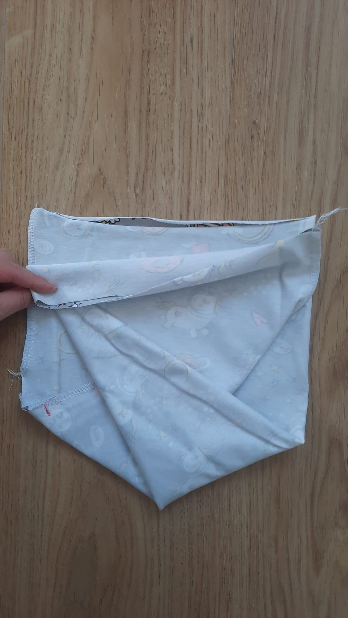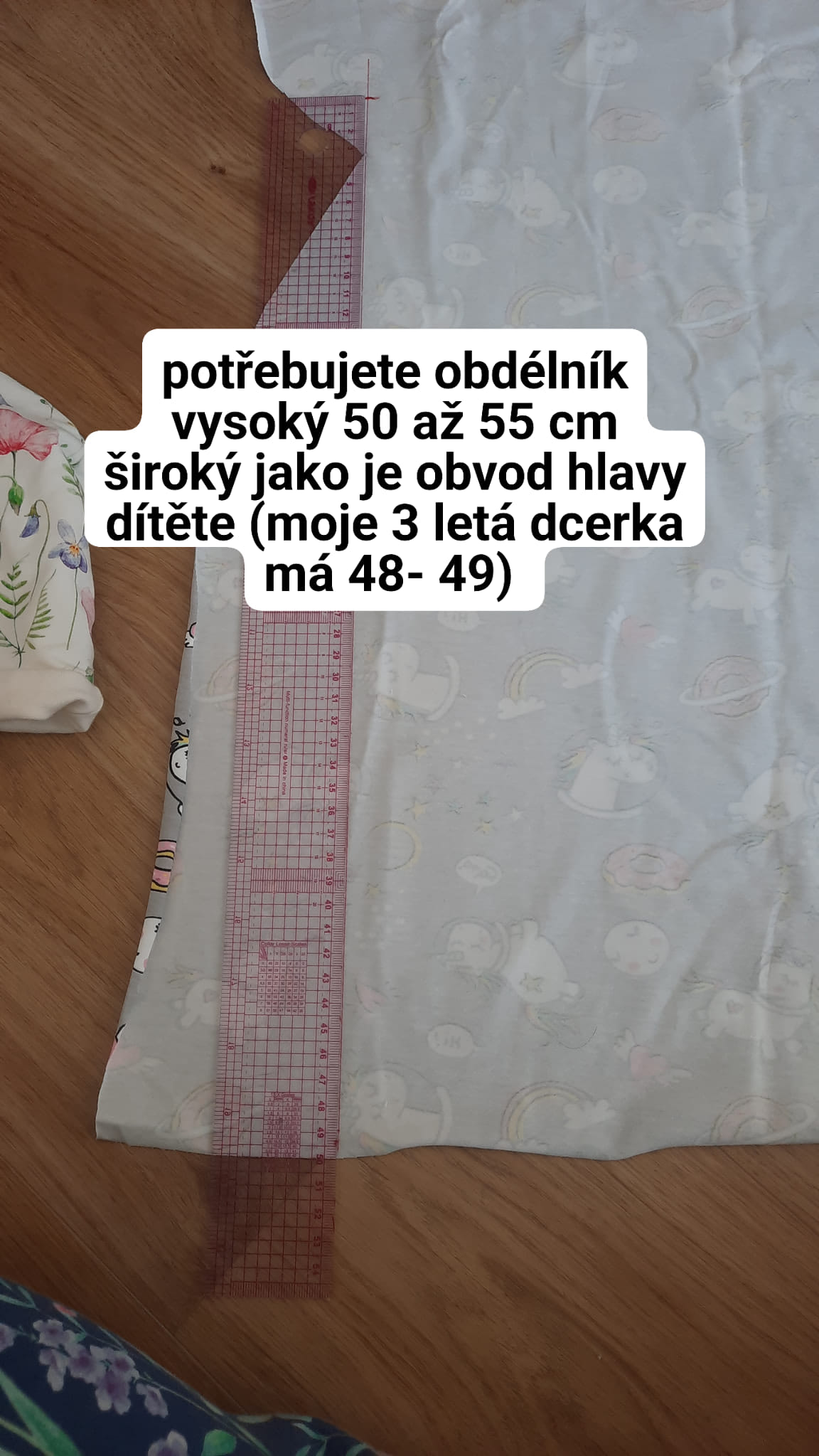 Budeme stříhat obdélník vysoký 50 až 55 cm a široký jako je obvod hlavy dítěte mínus 2 cm.