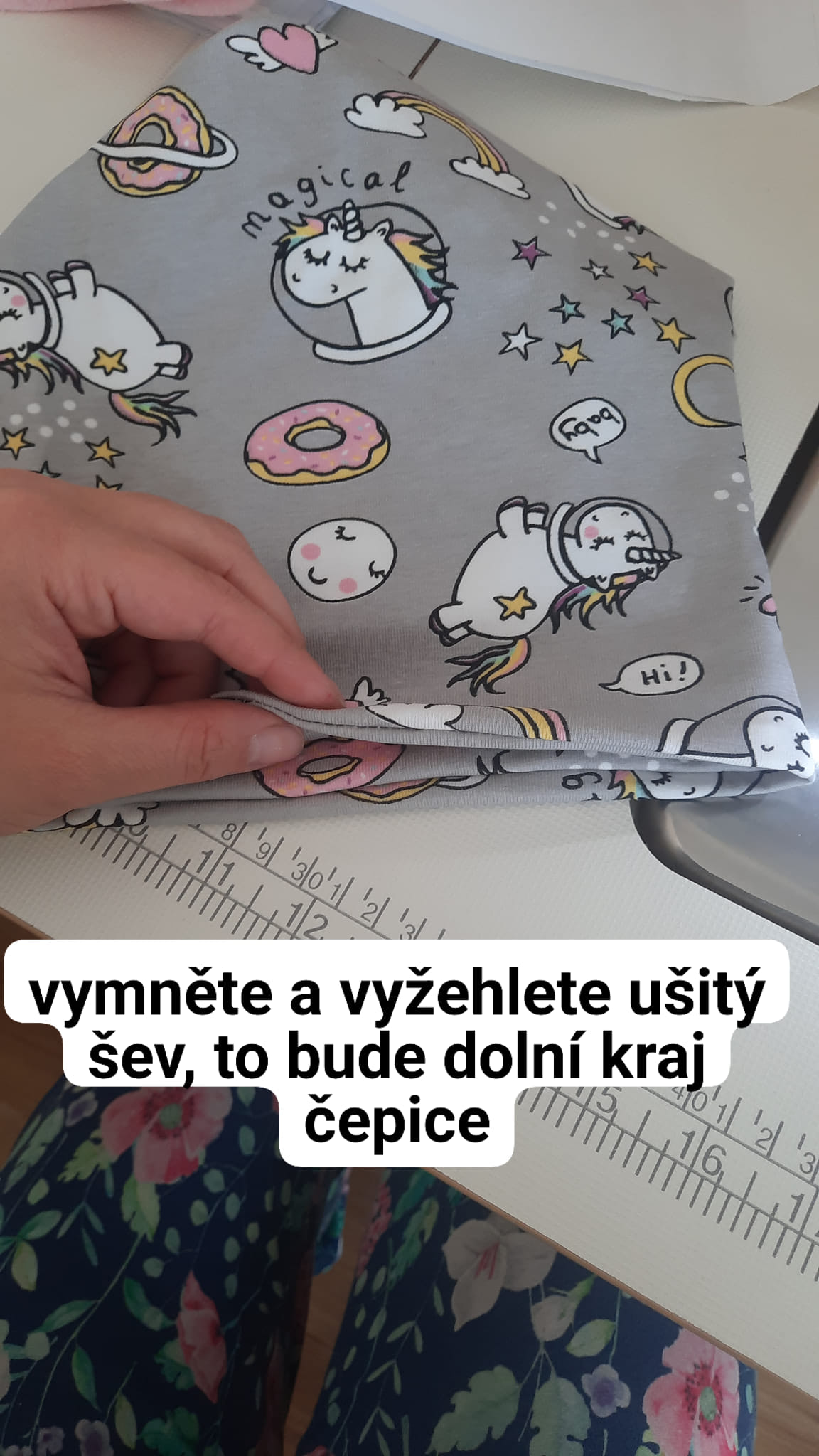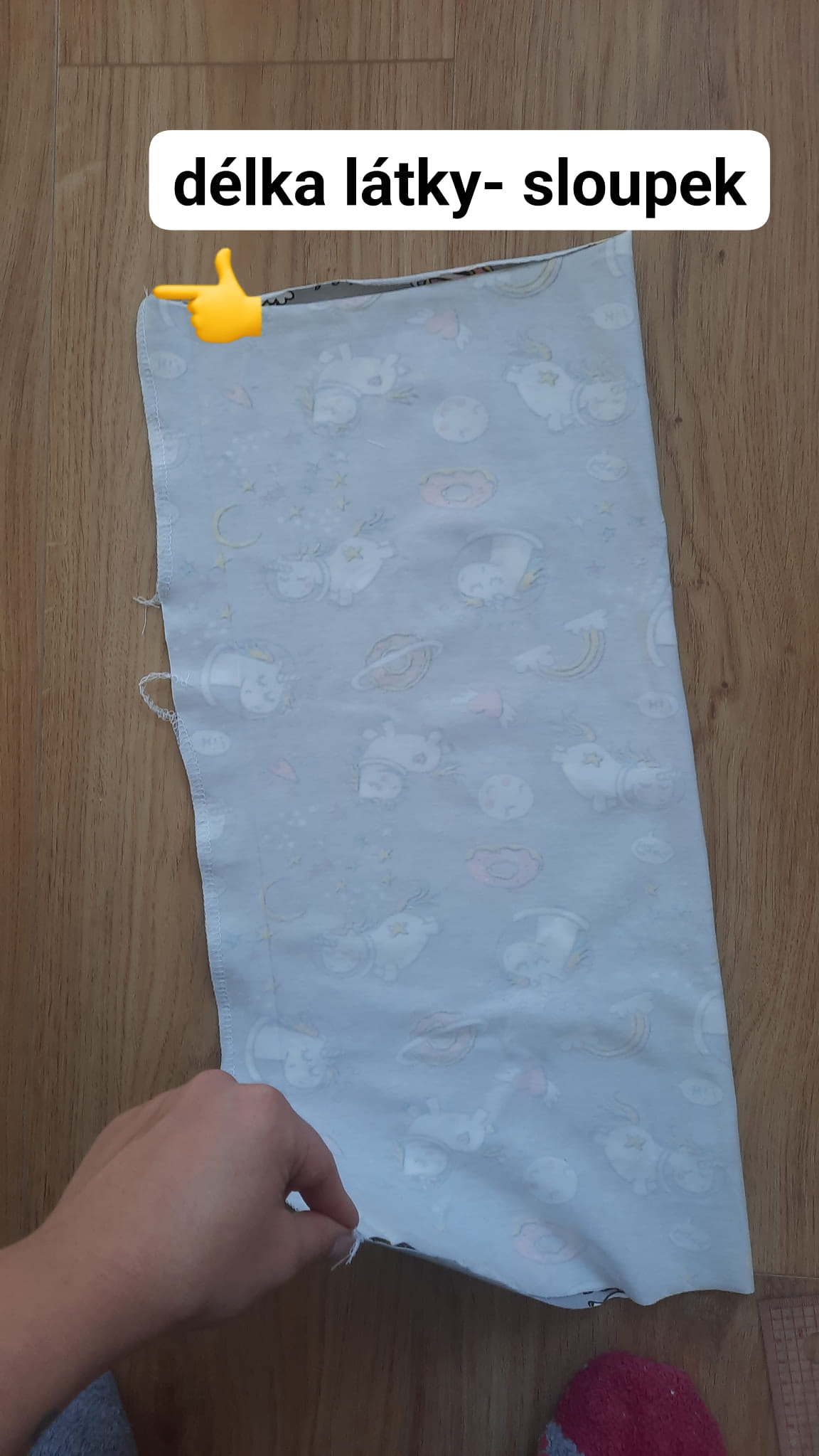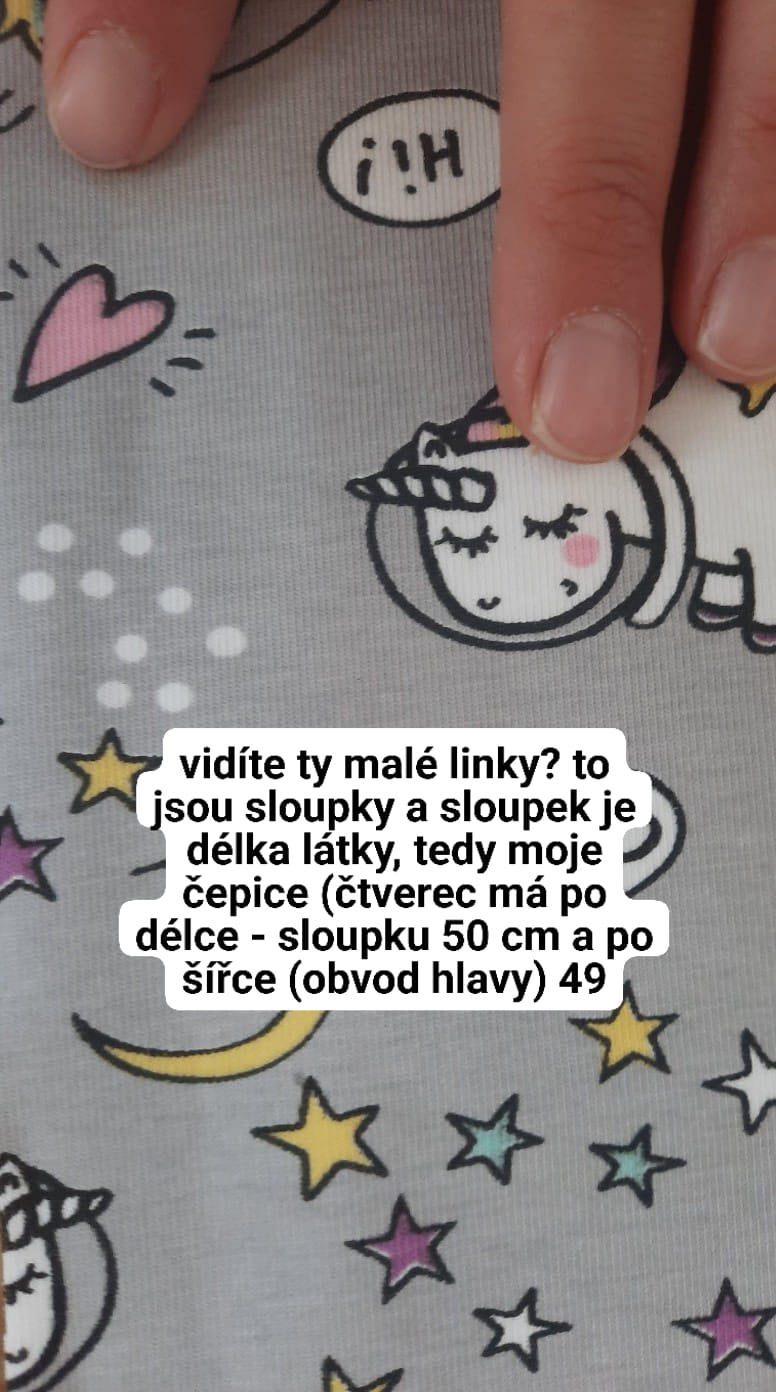 Délka látky se jmenuje osnova a poznám ji díky sloupkům, po délce nanesu délku čepice - na 4 letou dceru 50 cm. Šíře látky se jmenuje útek a po ní nanesu obvod hlavy mínus 2 cm.