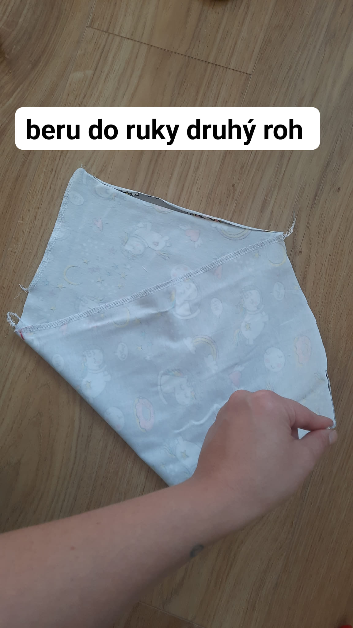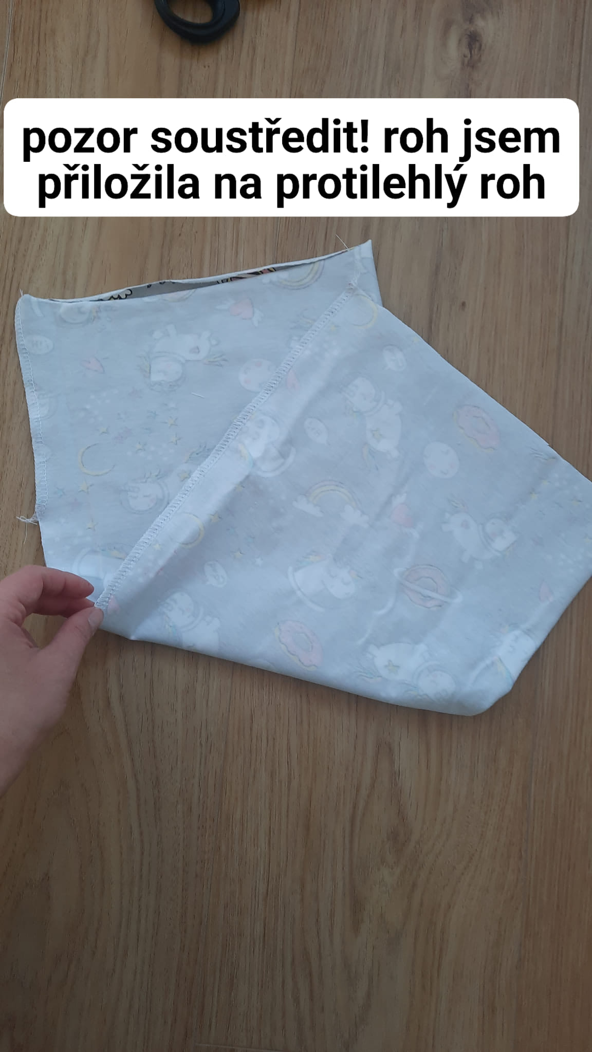 Jeden roh přiložím na protilehlý roh dle obrázku.