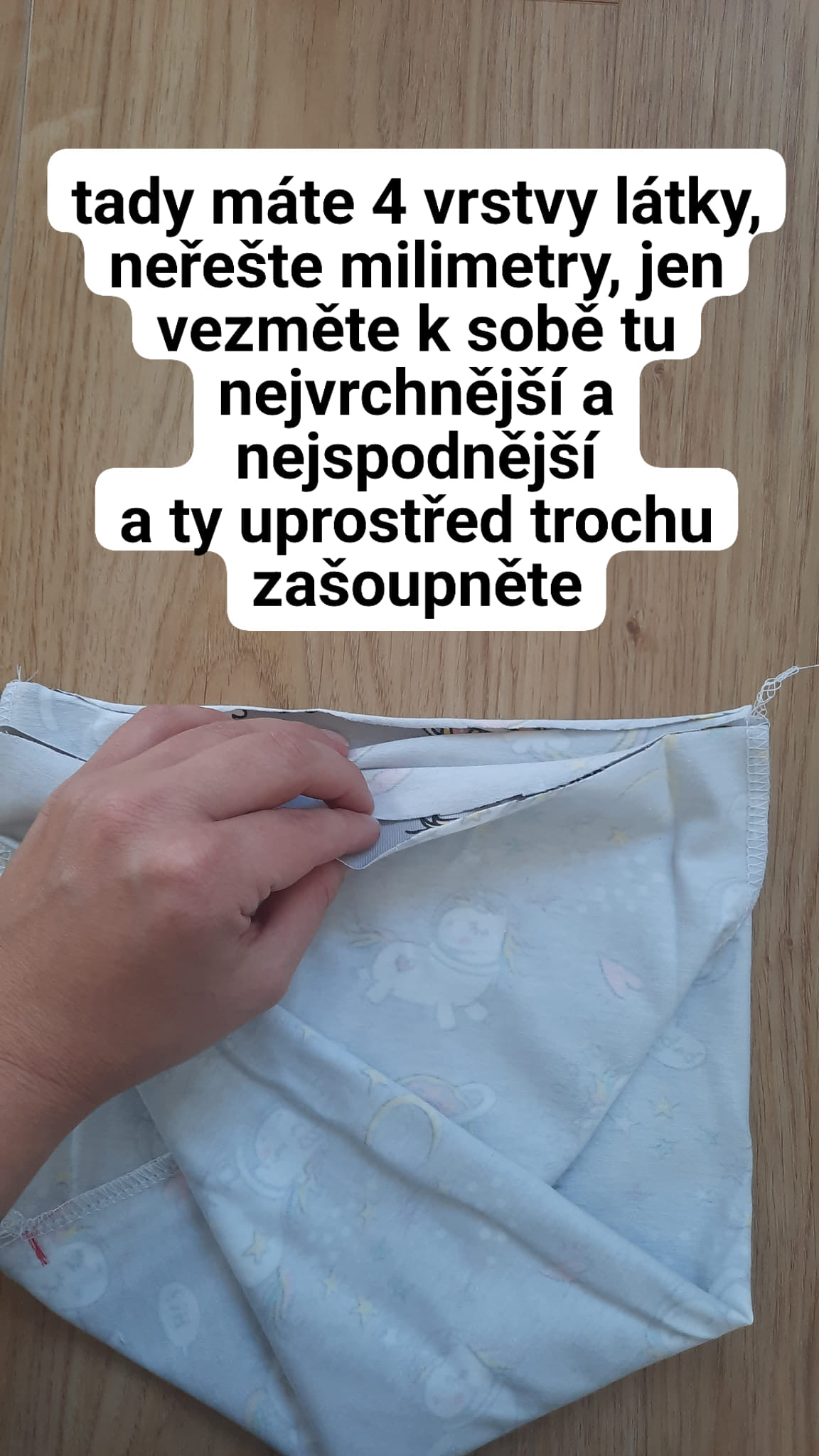 Položím k sobě tak, jak jsou, tu nejvrchnější a nejspodnější vrstvu látek. Dvě vrstvy co jsou uprostřed zašoupnu lehce dovnitř.