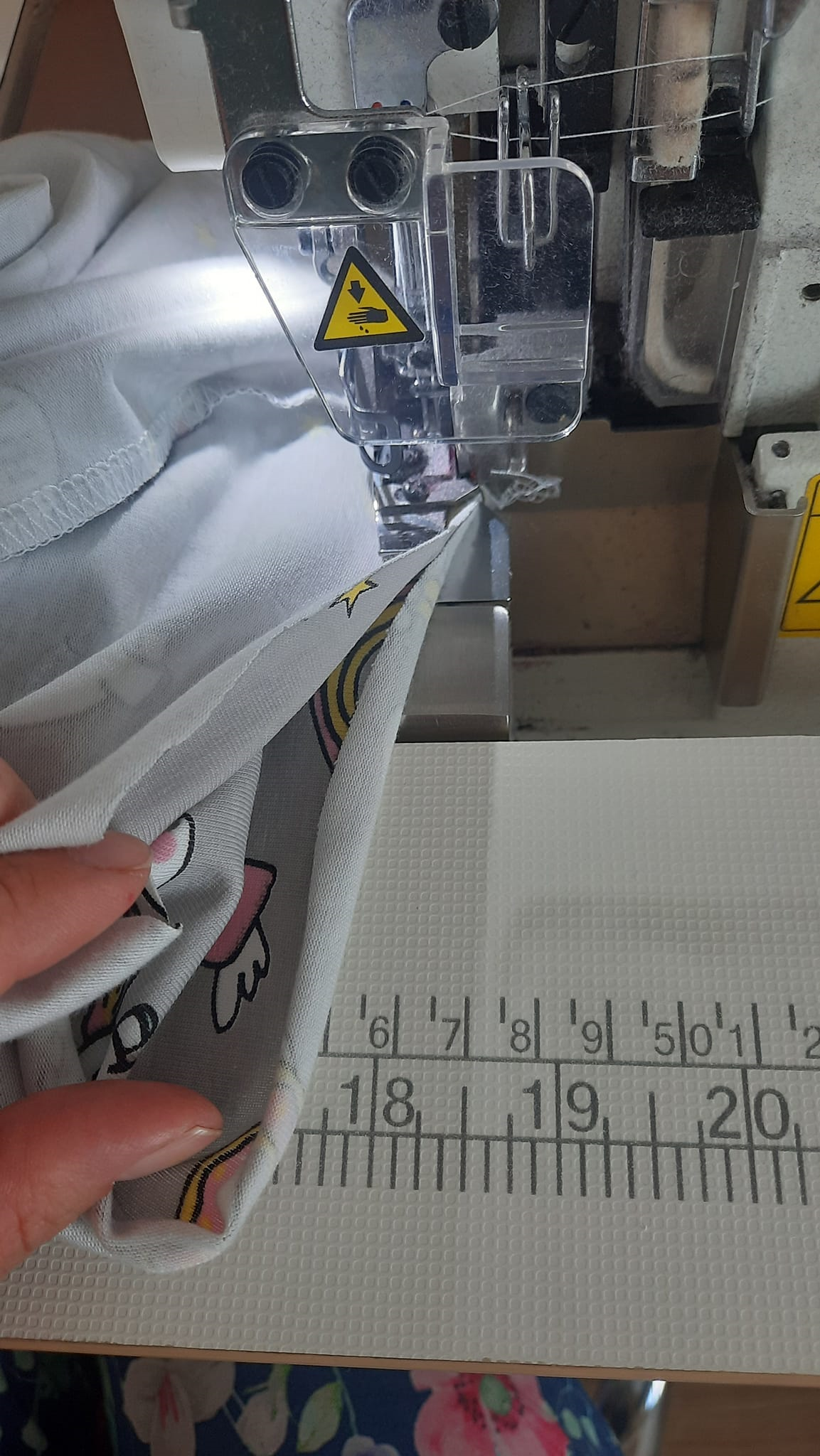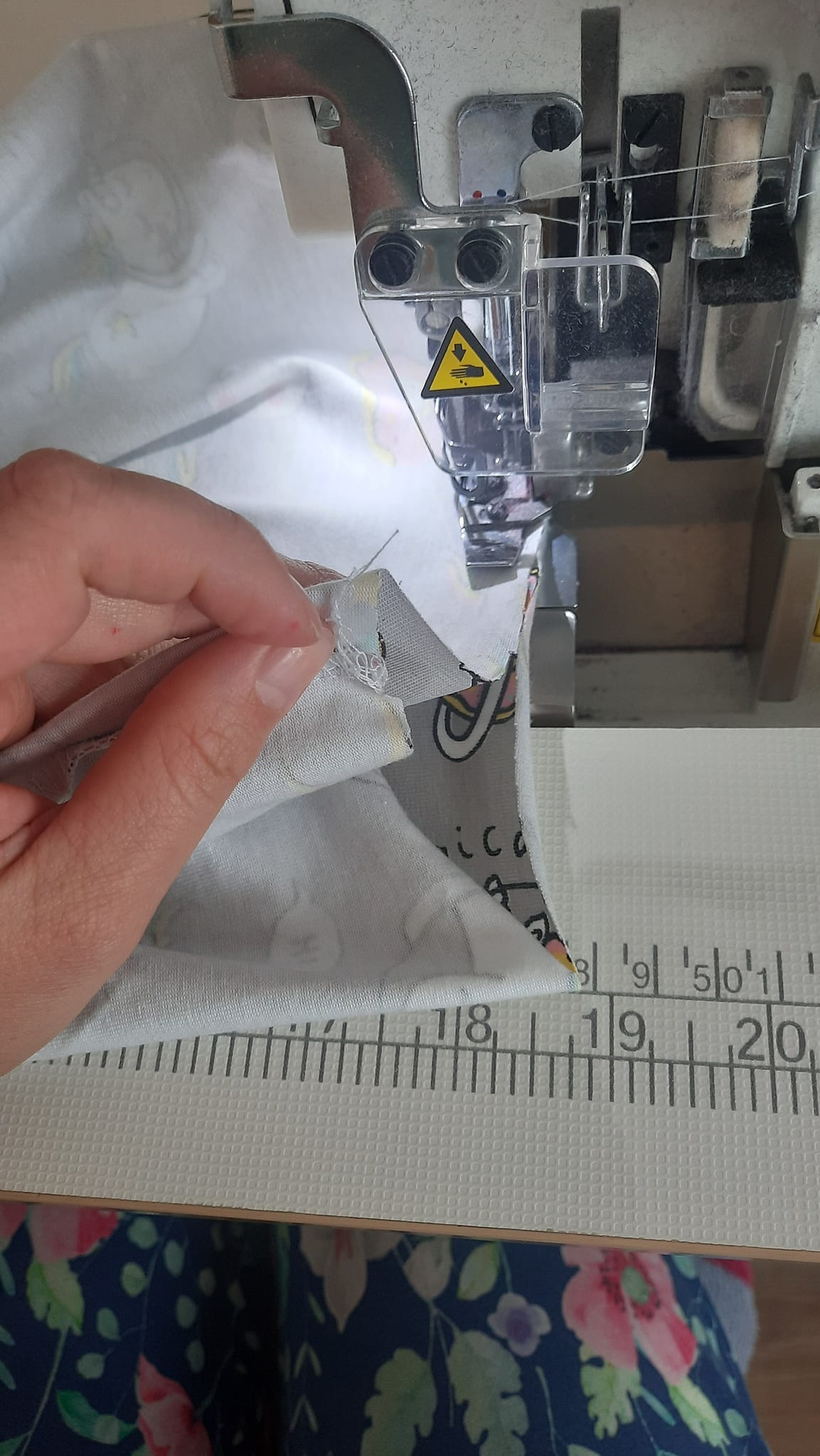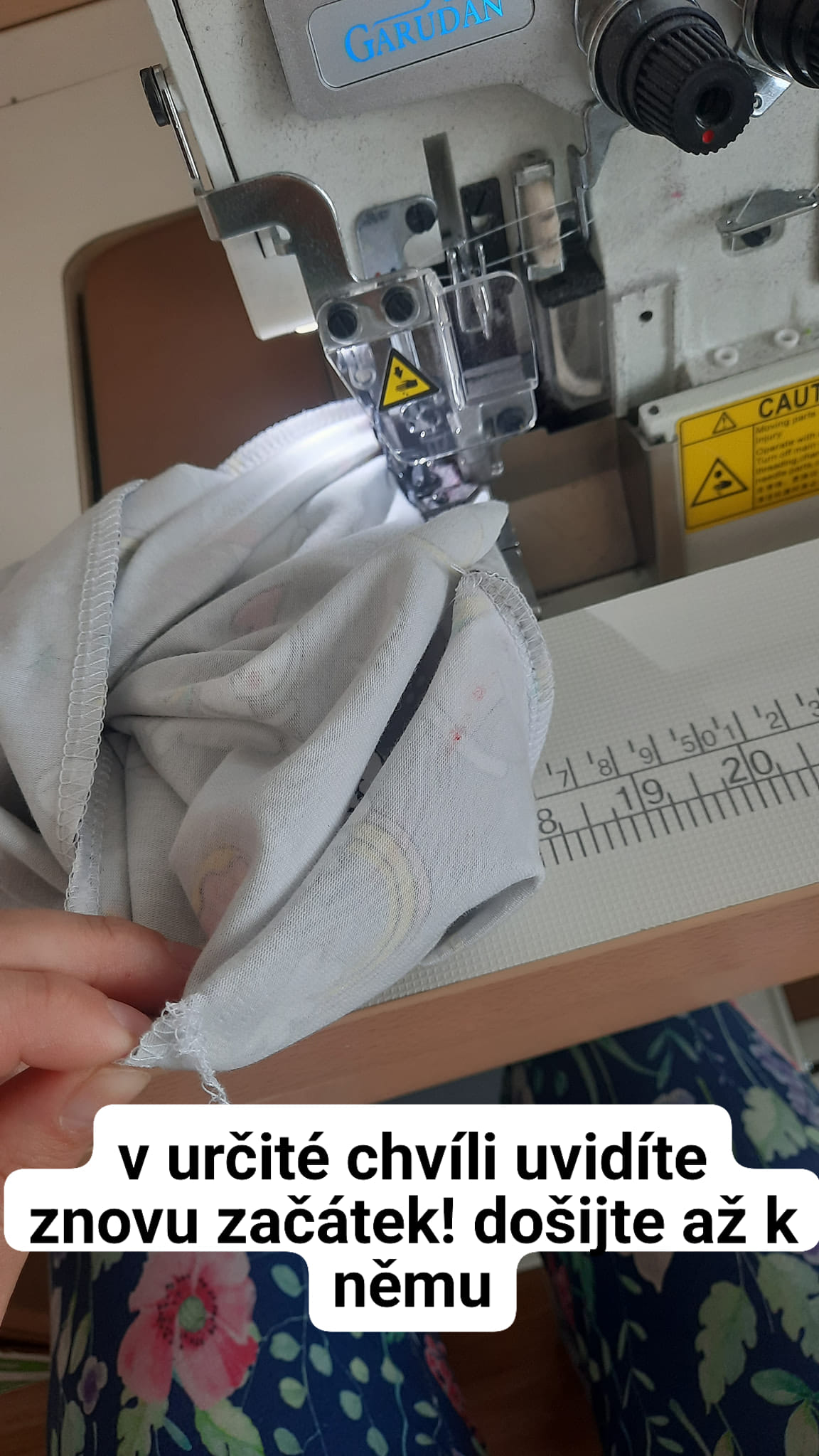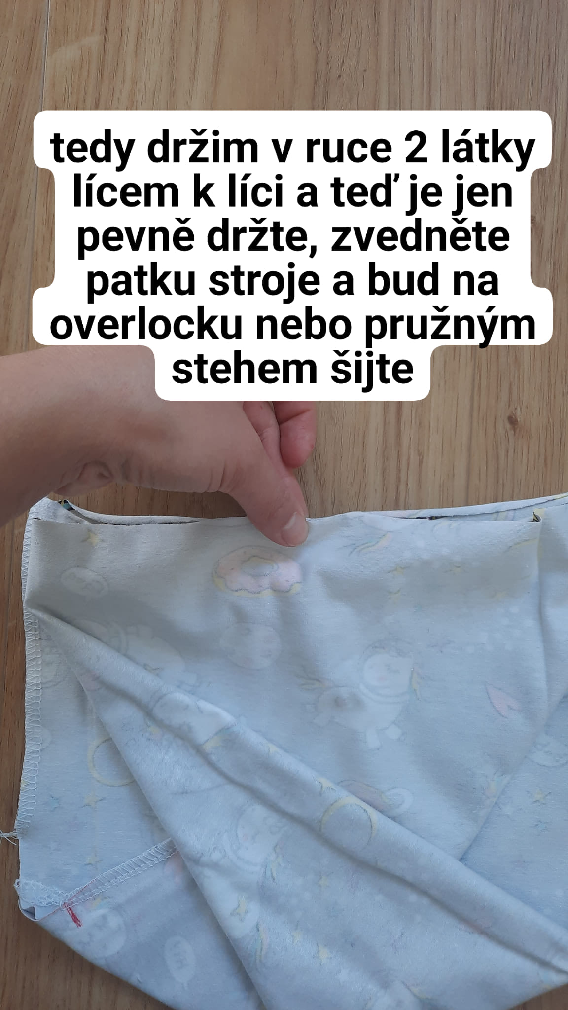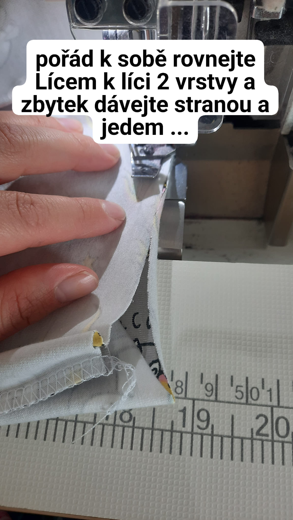 Tyto dvě vrstvy - nejvíc nahoře a nejvíc dole, dejte pod stroj, šijte opět buď na overlocku nebo pružným stehem.
