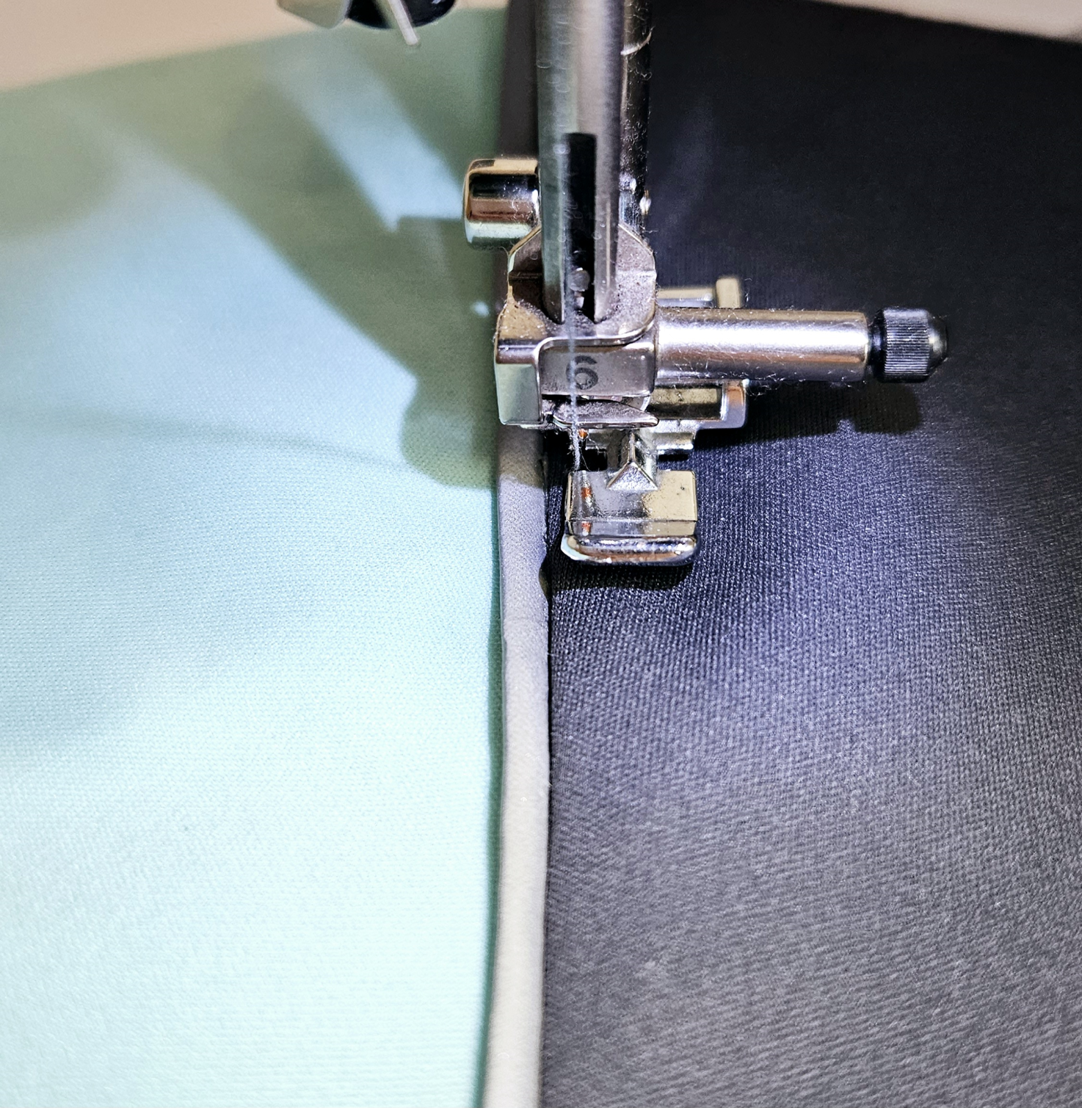 Látku přiložím lícem na líc druhého dílu. Nový díl je dole, díl s viditelným šitím je pod strojem, opět šiji patkou na zip a šití je na totožném místě jako to minulé.