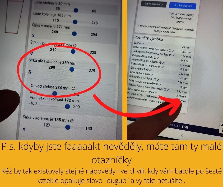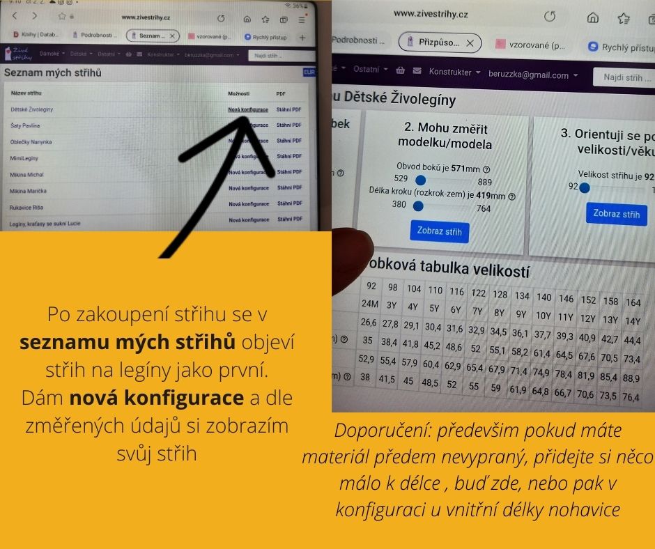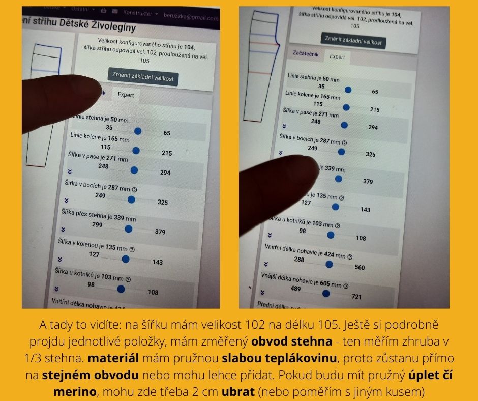 Doporučení: především pokud máte materiál předem nevypraný, přidejte si něco málo k délce , buď zde, nebo pak v konfiguraci u vnitřní délky nohavice