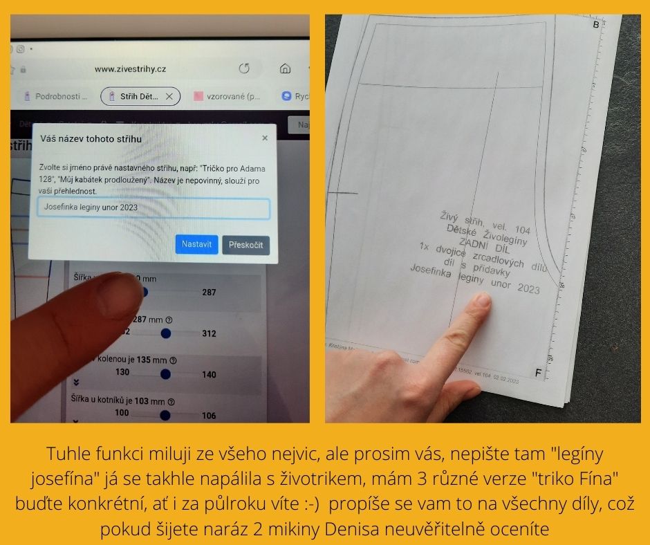 Tuhle funkci miluji ze všeho nejvíc, ale prosím vás, nepište tam "legíny josefína" já se takhle napálila s životrikem, mám 3 různé verze "triko Fína" buďte konkrétní, ať i za půlroku víte :-) propíše se vám to na všechny díly, což pokud šijete naráz 2 mikiny Denisa neuvěřitelně oceníte