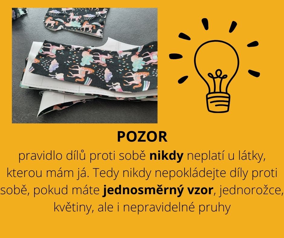 pravidlo dílů proti sobě nikdy neplatí u látky, kterou mám já. Tedy nikdy nepokládejte díly proti sobě, pokud máte jednosměrný vzor, jednorožce, květiny, ale i nepravidelné pruhy