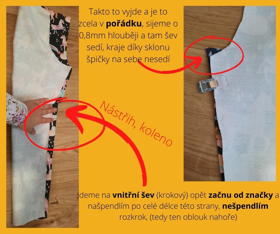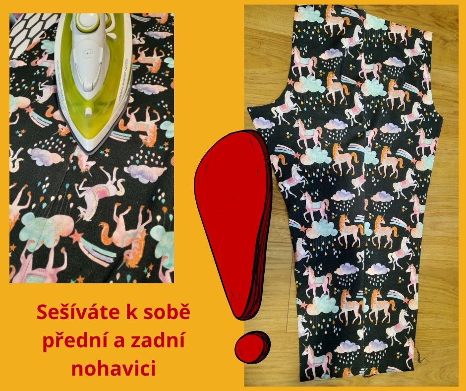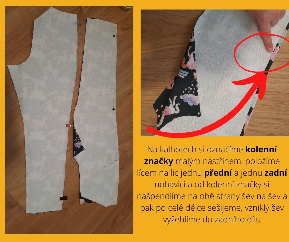 Na kalhotách si označíme kolenní značky malým nástřihem, položíme lícem na líc jednu přední a jednu zadní nohavici a od kolenní značky si našpendlíme na obě strany šev na šev a pak po celé délce sešijeme, vzniklý šev vyžehlíme do zadního dílu
