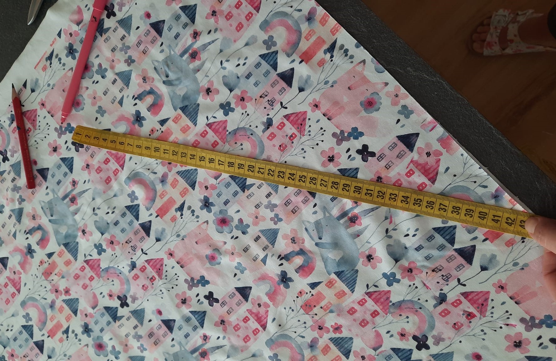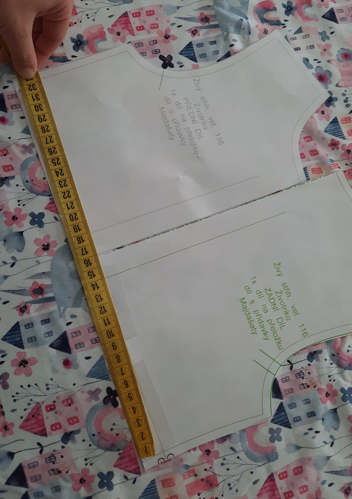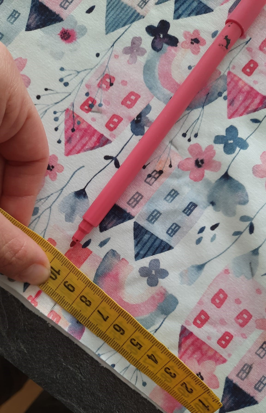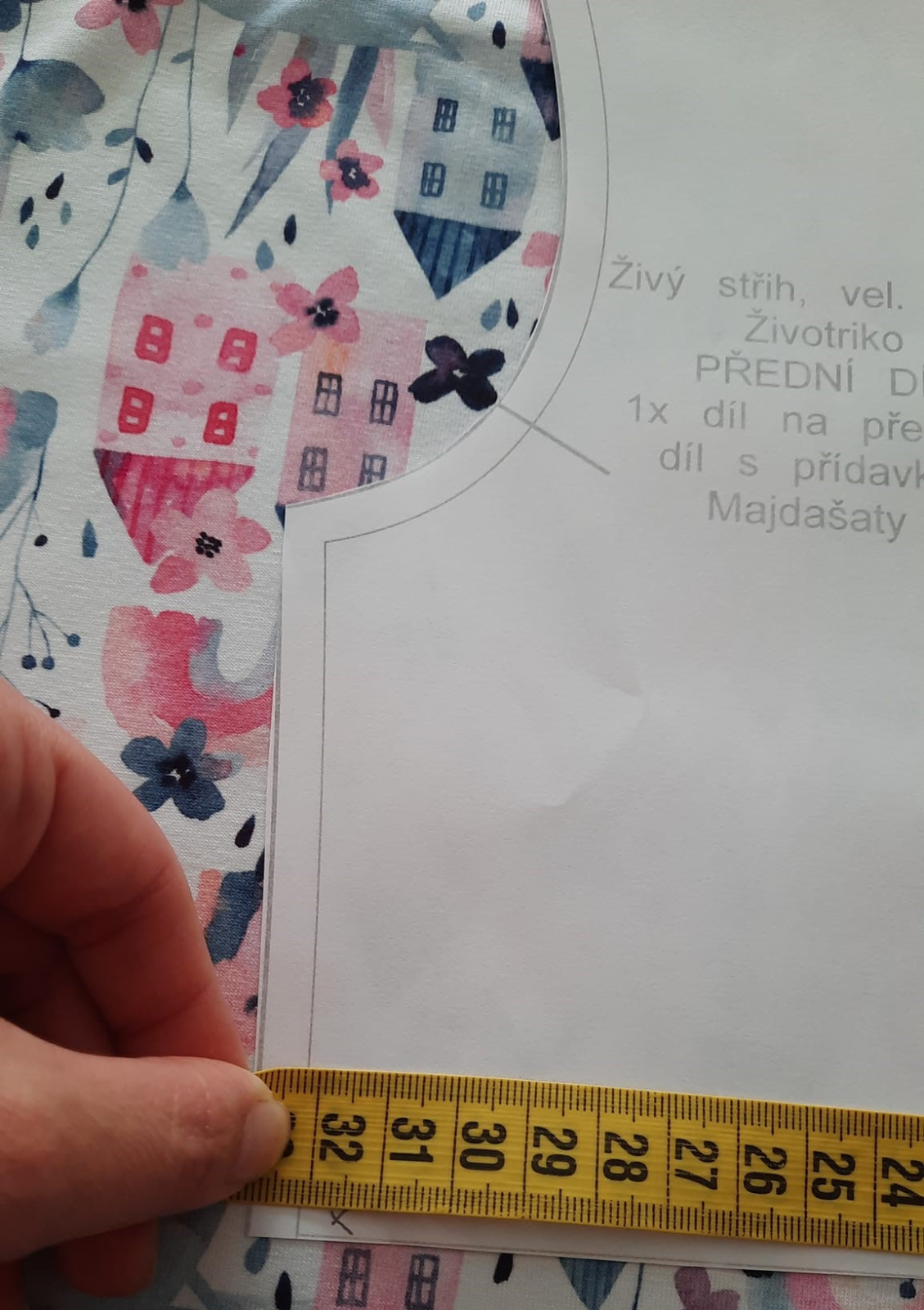 protože mám vzor domečků budu sukni stříhat jako dvě pulkola, jistě najdete na yt či pinterest milion fotek jak na to, zde jen ve zkratce: naměřím od kraje délku sukně 32+1 na šev v pase, na délku nic budu lemovat proužkem. od té značky v 33 cm naměřím hodnotu z wikiny (r - poloměr kruhu) tedy asi 9.5 cm
