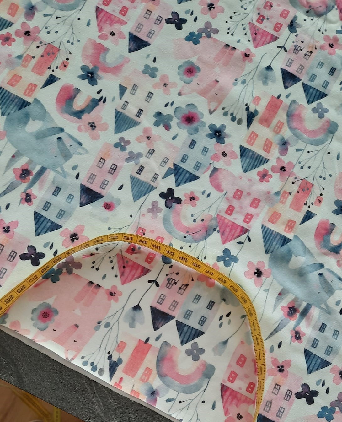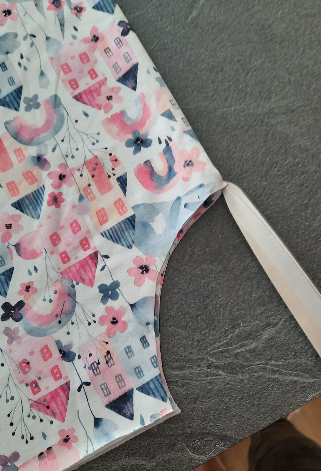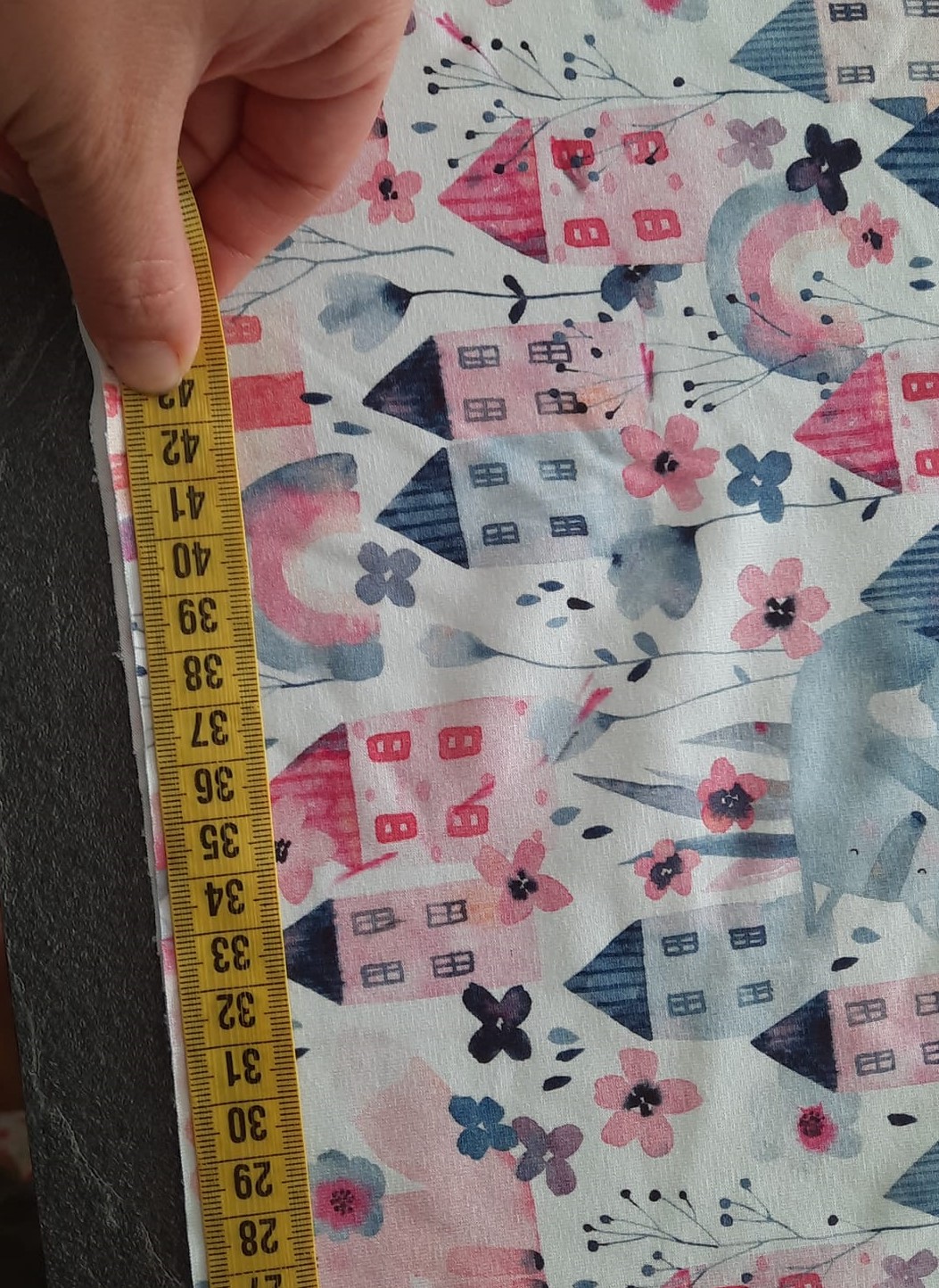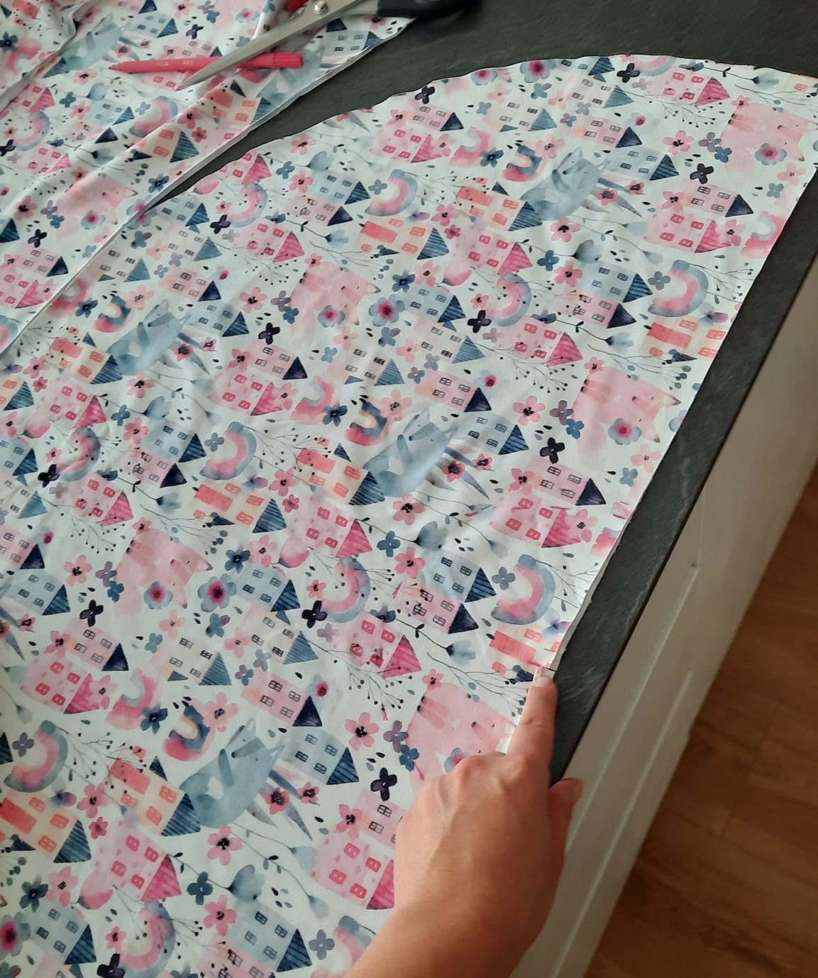 protože mám vzor domečků budu sukni stříhat jako dvě pulkola, jistě najdete na yt či pinterest milion fotek jak na to, zde jen ve zkratce: naměřím od kraje délku sukně 32+1 na šev v pase, na délku nic budu lemovat proužkem. od té značky v 33 cm naměřím hodnotu z wikiny (r - poloměr kruhu) tedy asi 9.5 cm