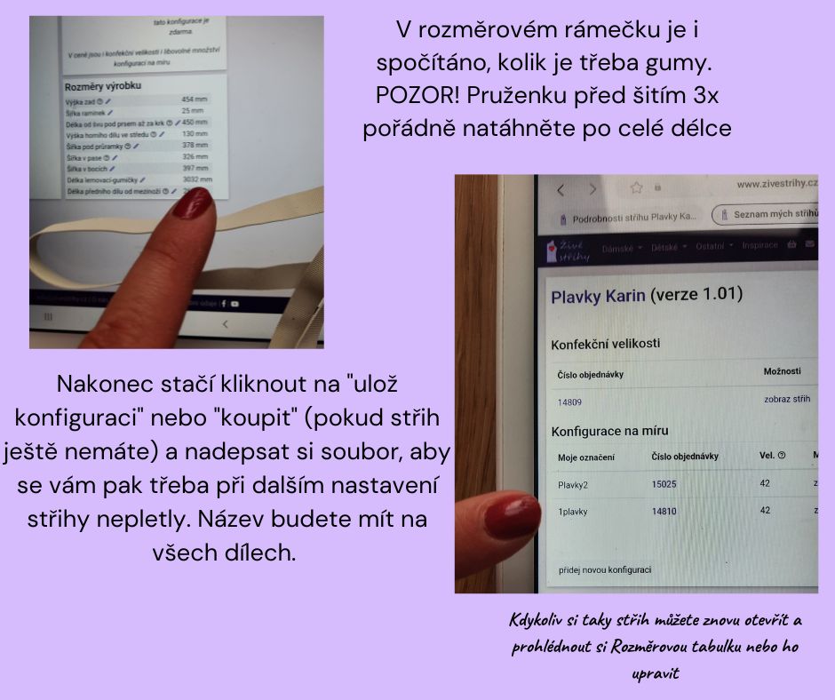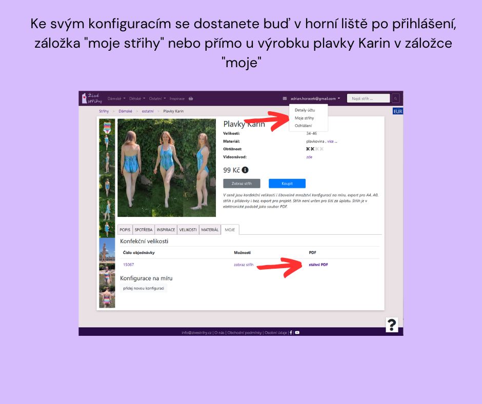 Ke svým konfiguracím se dostanete buď v horní liště po přihlášení, záložka "moje střihy" nebo přímo u výrobku plavky Karin v záložce "moje"