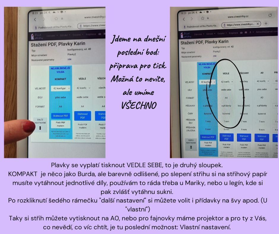 Po rozkliknutí šedého rámečku "další nastavení" si můžete volit i přídavky na švy apod. (U "vlastní")