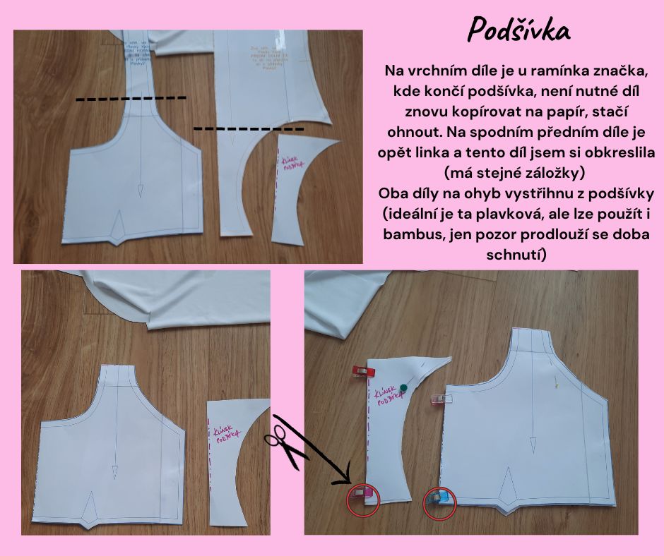 Na vrchním díle je u ramínka značka, kde končí podšívka, není nutné díl znovu kopírovat na papír, stačí ohnout. Na spodním předním díle je opět linka a tento díl jsem si obkreslila (má stejné záložky) Oba díly na ohyb vystřihnu z podšívky (ideální je ta plavková, ale lze použít i bambus, jen pozor prodlouží se doba schnutí)