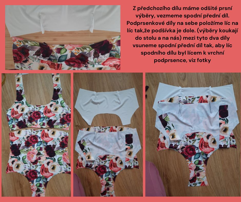 Z předchozího dílu máme odšité prsní výběry, vezmeme spodní přední díl. Podprsenkové díly na sebe položíme líc na líc tak,že podšívka je dole. (výběry koukají do stolu a na nás) mezi tyto dva díly vsuneme spodní přední díl tak, aby líc spodního dílu byl lícem k vrchní podprsence, viz fotky