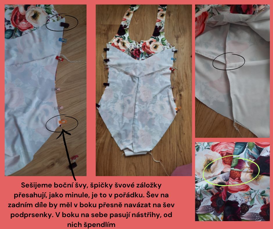 Sešijeme boční švy, špičky švové záložky přesahují, jako minule, je to v pořádku. Šev na zadním díle by měl v boku přesně navázat na šev podprsenky. V boku na sebe pasují nástřihy, od nich špendlím