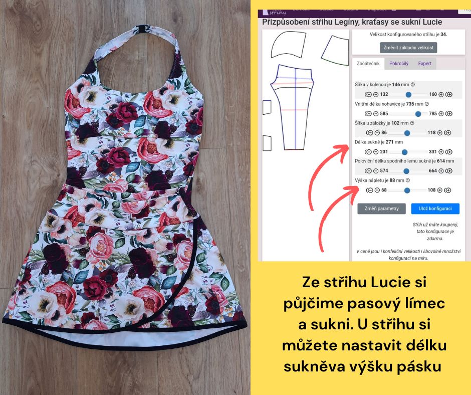 Ze střihu Lucie si půjčíme pasový límec a sukni. U střihu si můžete nastavit délku sukně a výšku pásku.