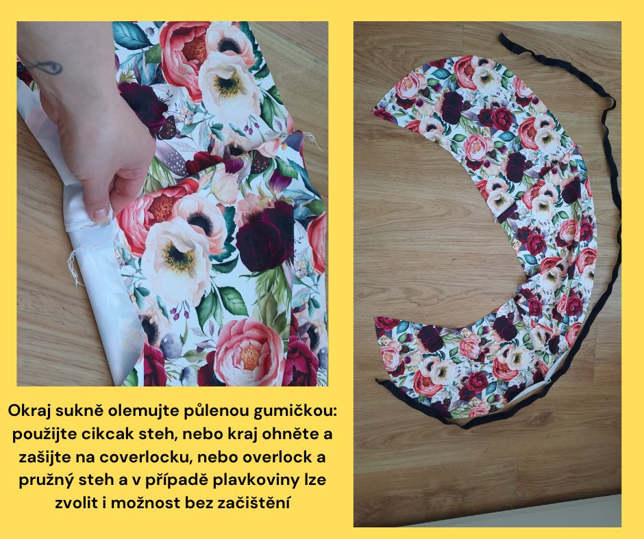 Okraj sukně olemujte půlenou gumičkou: použijte cikcak steh, nebo kraj ohněte a zašijte na coverlocku, nebo overlock a pružný steh a v případě plavkoviny lze zvolit i možnost bez začištění