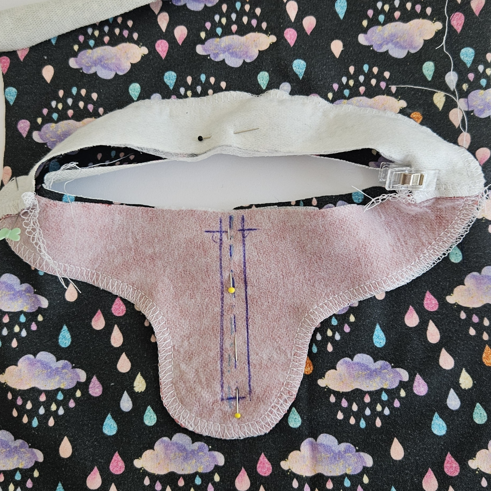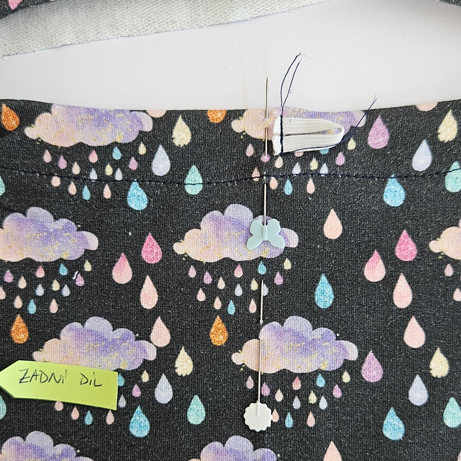 na střed zadního dílu umístím střed podsádky, zbytek kolem dokola našpendlím - ramena na sebe atd.