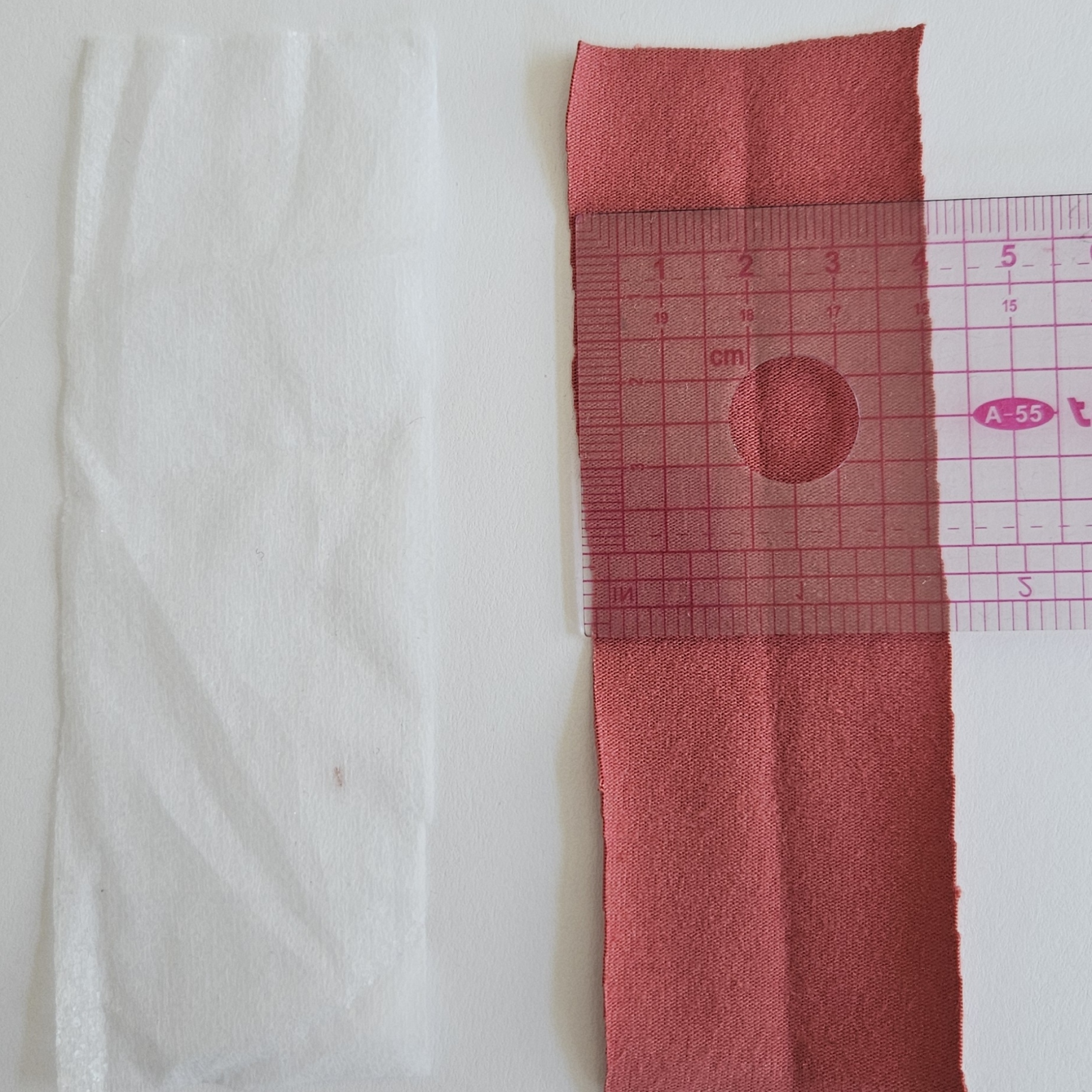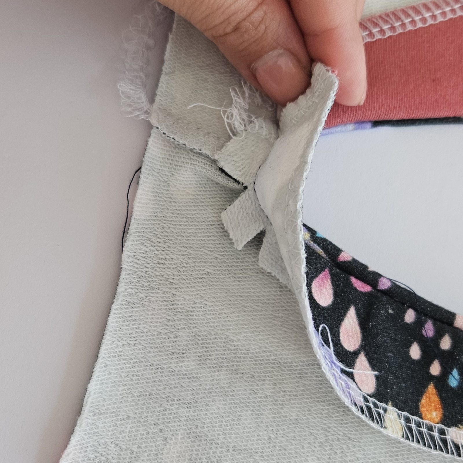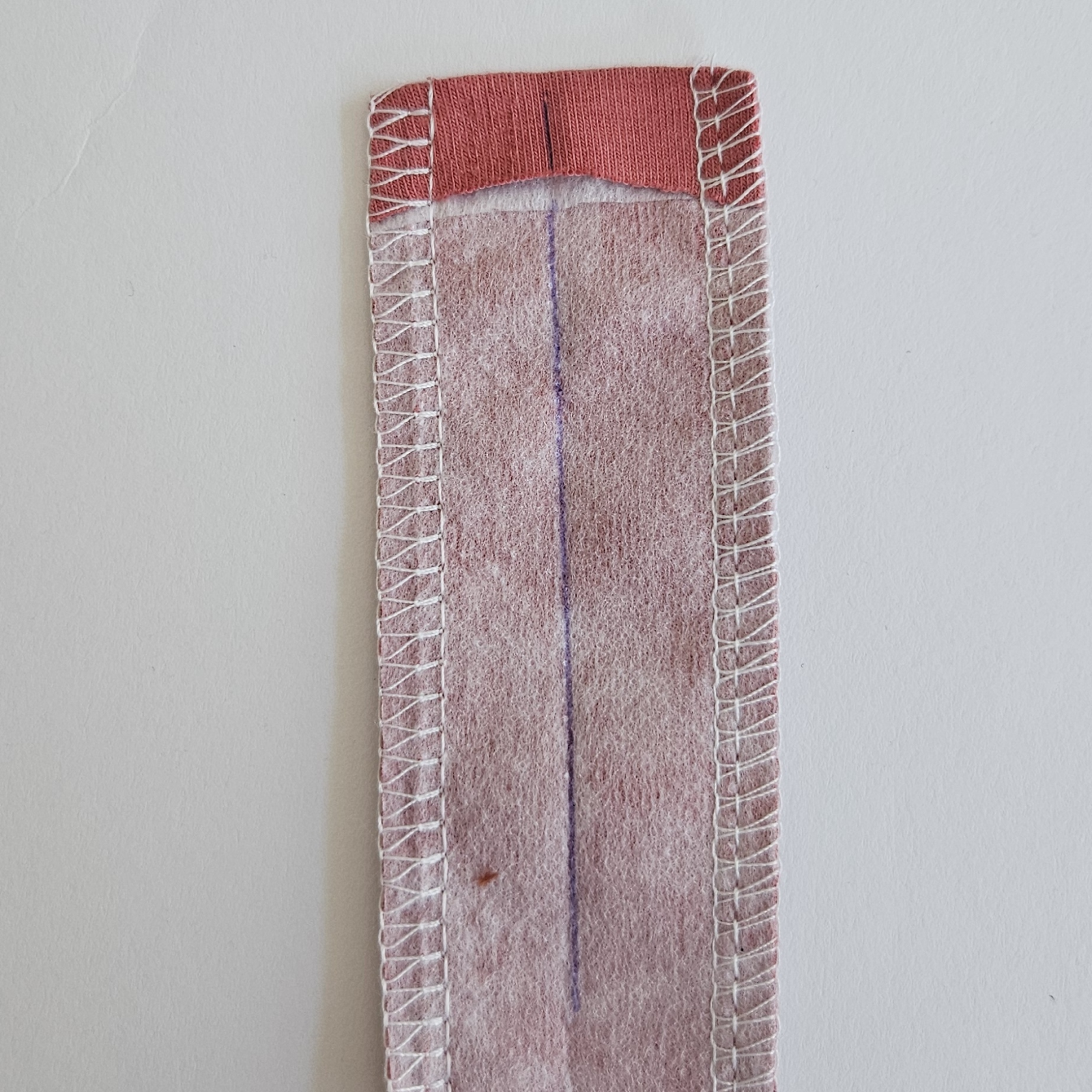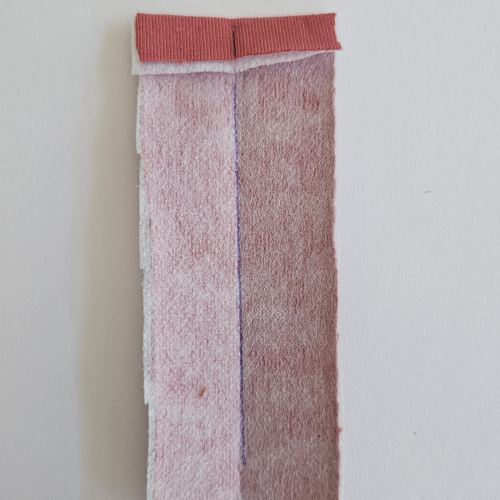 Já zde používám kontrastní látku, Vám doporučuji stejnou barvu úpletu šit slabé teplákoviny. Proužek 4 x 12 cm podlepím vlizelínem