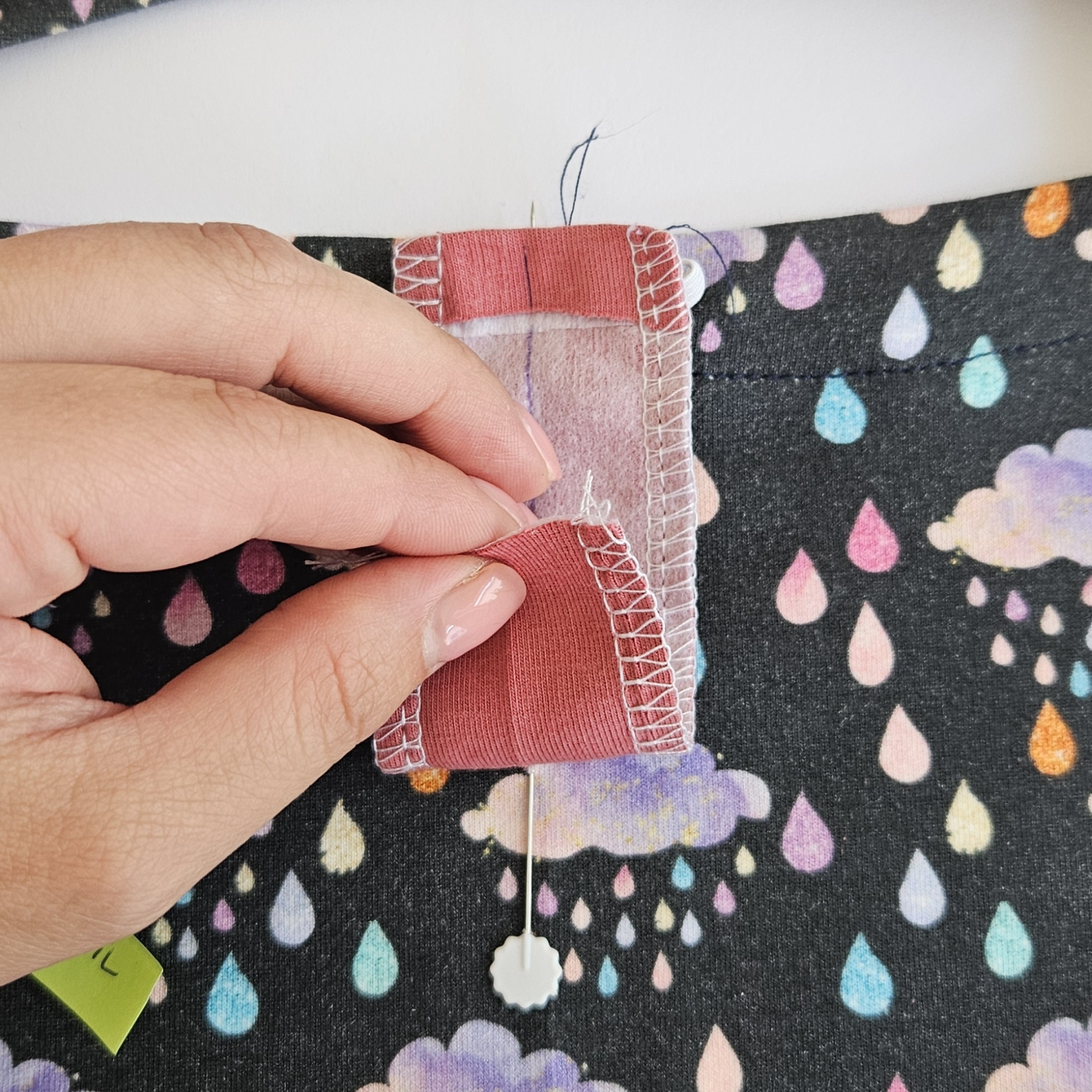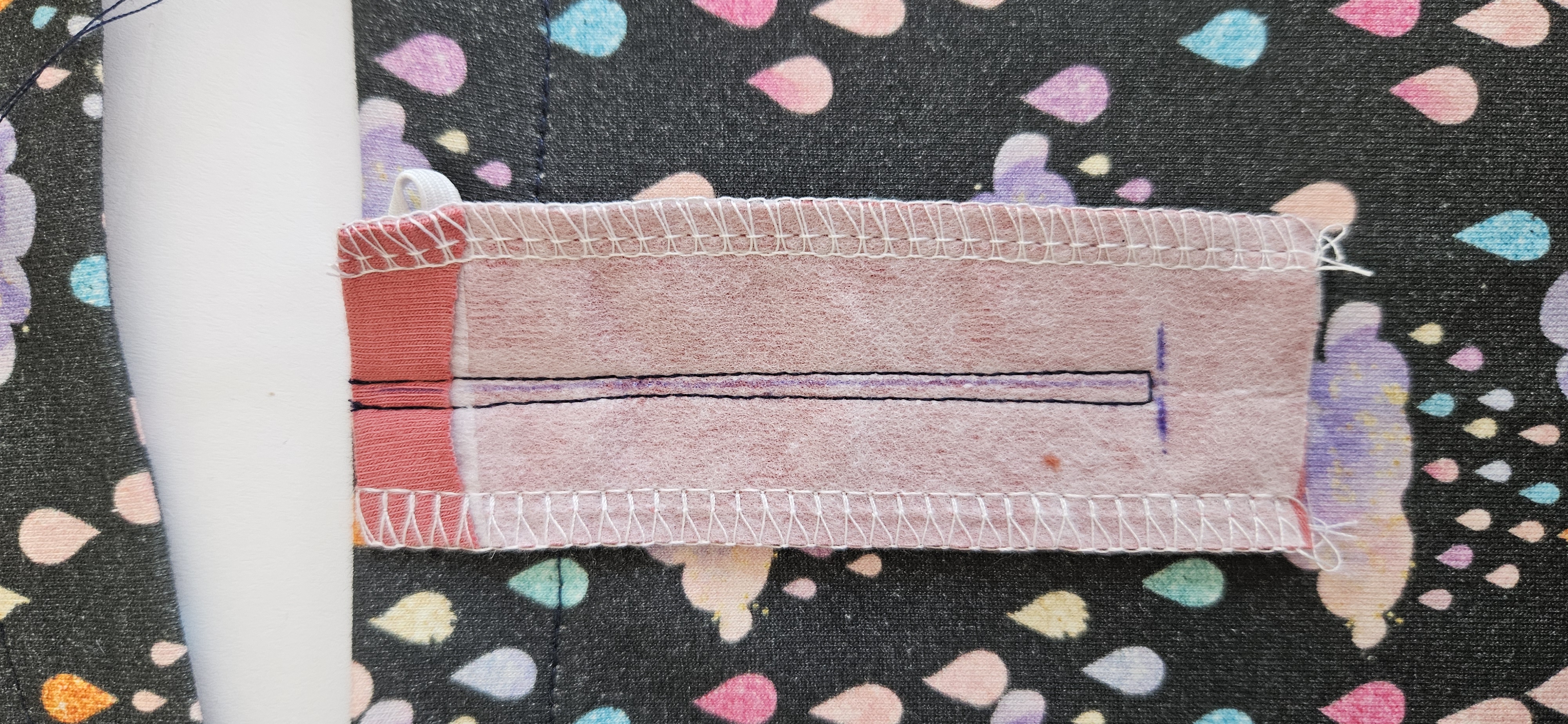 našpendlím a šití povedu tak, abych šila 2mm za zachycenou gumičkou tedy aby šití gumičky bylo uvnitř nového "okýnka"