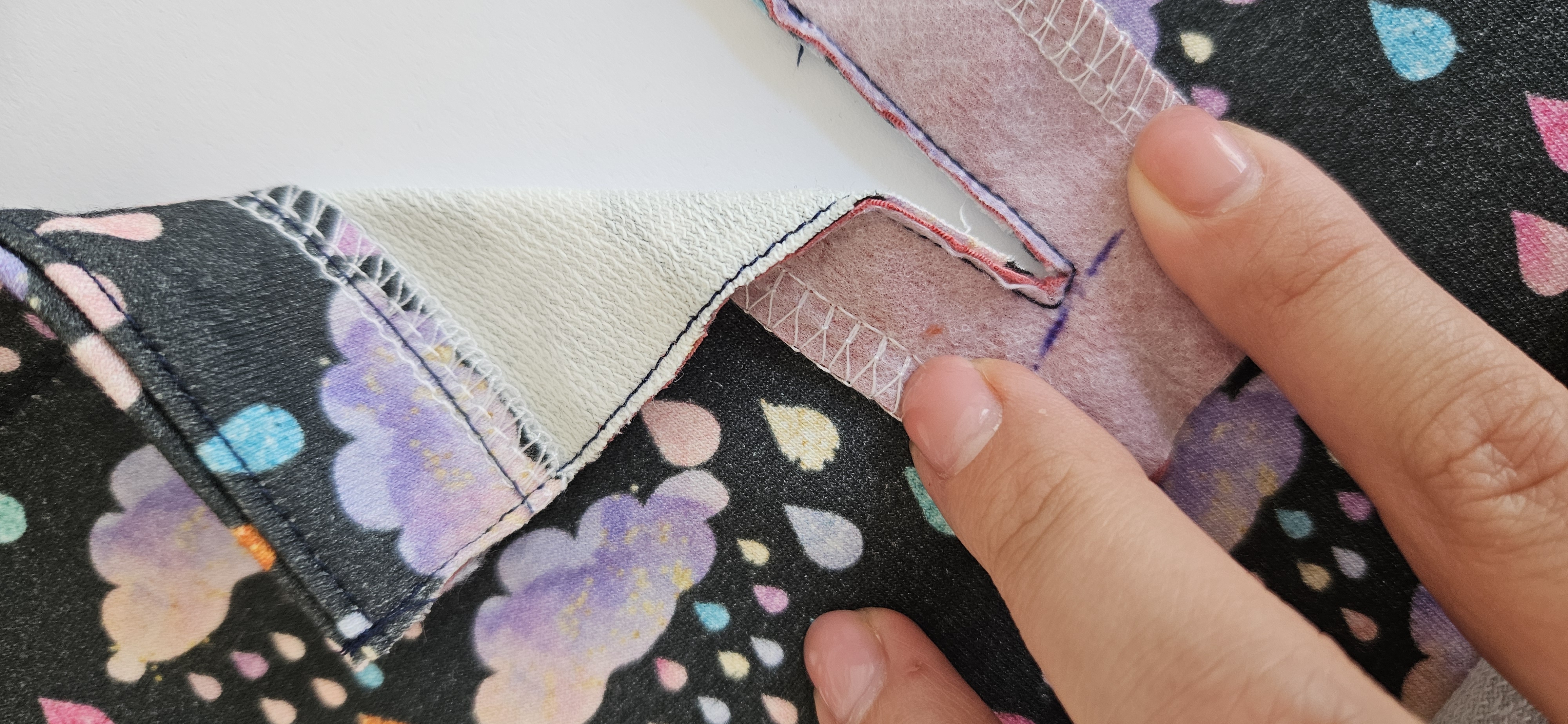 Vrchní stranu o 1 - 1.5 cm zahnu a zažehlím, boční strany si začistím na overlocku