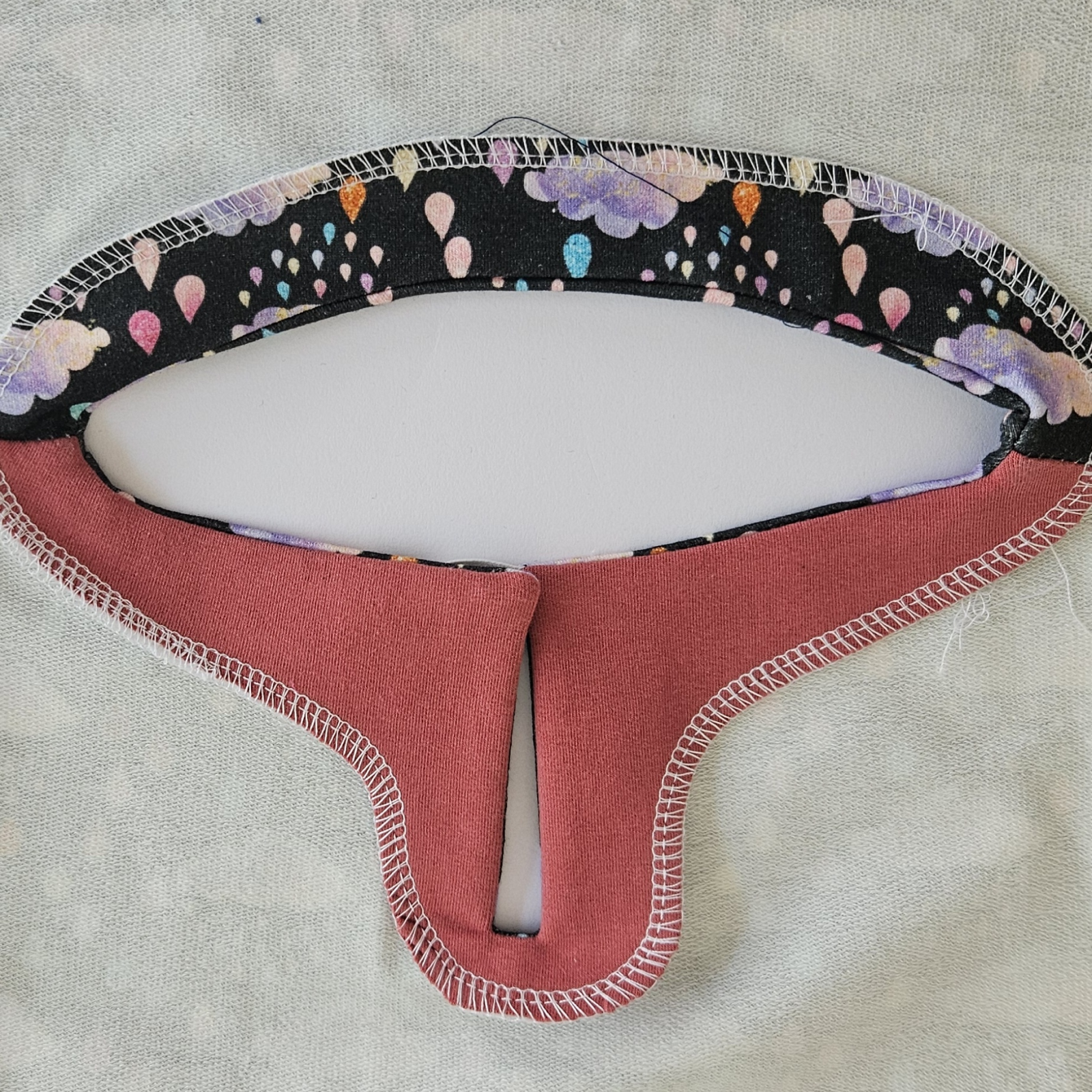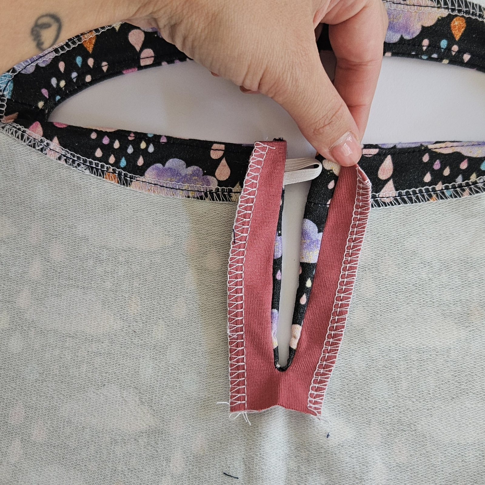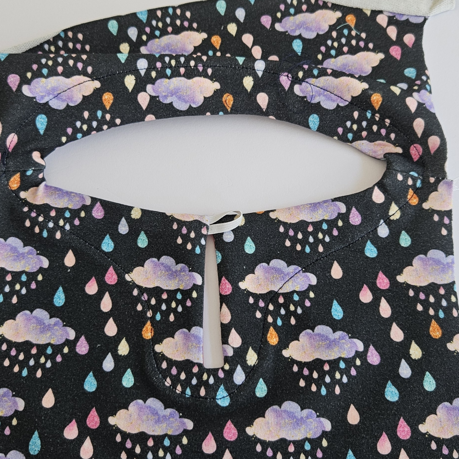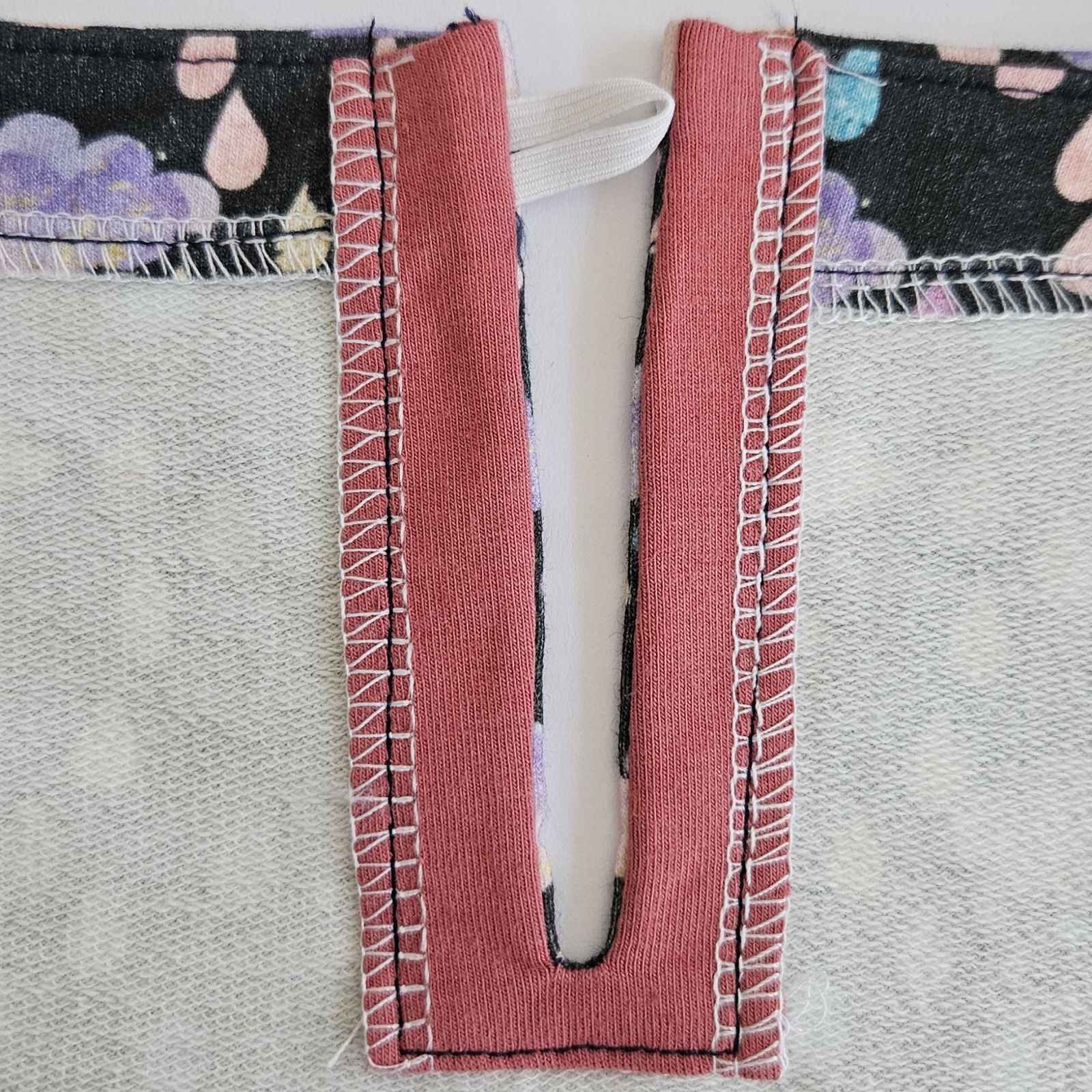 gumička je ušitá mezi dvěma linkami šití a kraje šití jsou v rovině, ušiji celý průkrčník kolem dokola, je dobré začít v rovné ploše třeba 5 cm od ramene, nikoliv ve špičce, do té by se mi na konci špatně vracelo.