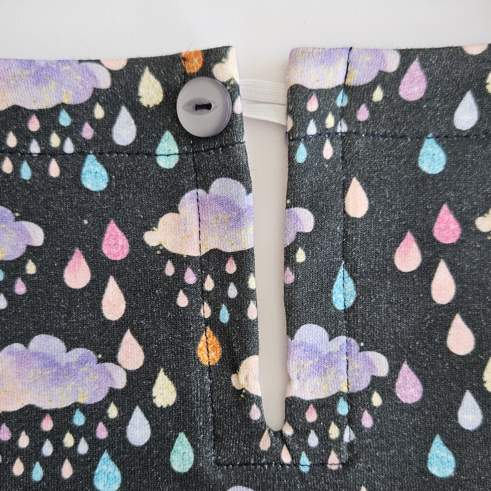 Pohled z líce: Podsádka protažená je prišitá obloukem. Obě verze počítájí s knoflíčkem a gumičkou na zapnutí.