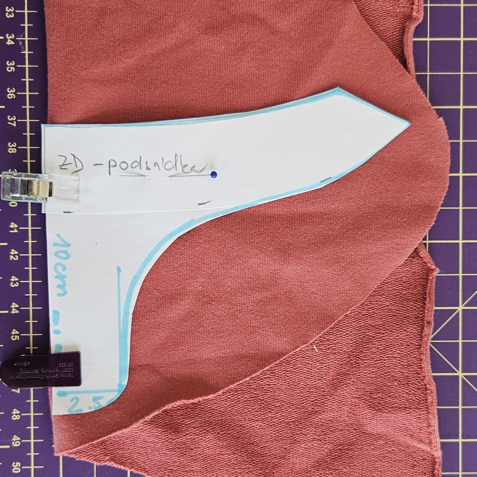 na podsádce si zakreslím střed a hloubku šití, plus je nutné mít zakreslený vrchní kraj který je v rovině, aby mi po přišití vyšly obě strany stejně vysoké a nebyl tam zub