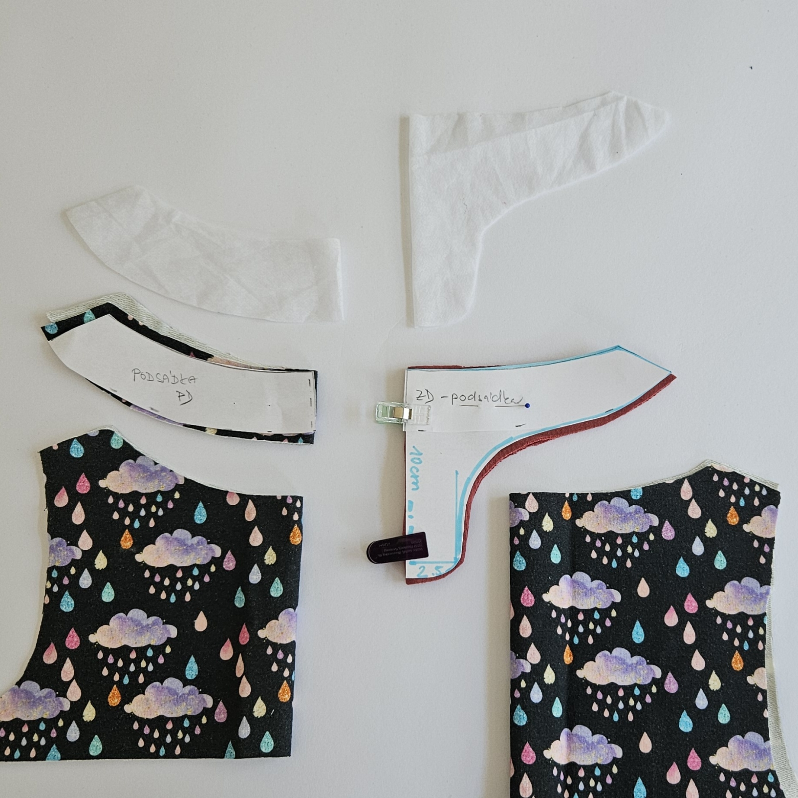 mám vystřižený přední a zadní díl na přehyb, podsádky na přehyb a vlizelín na přehyb. Je dobré použít slabší ideálně elastický vlizelín.