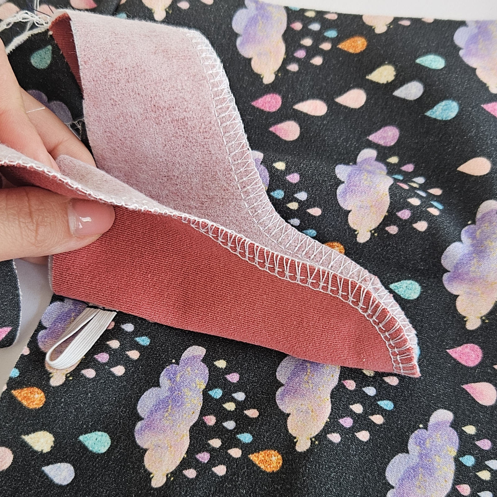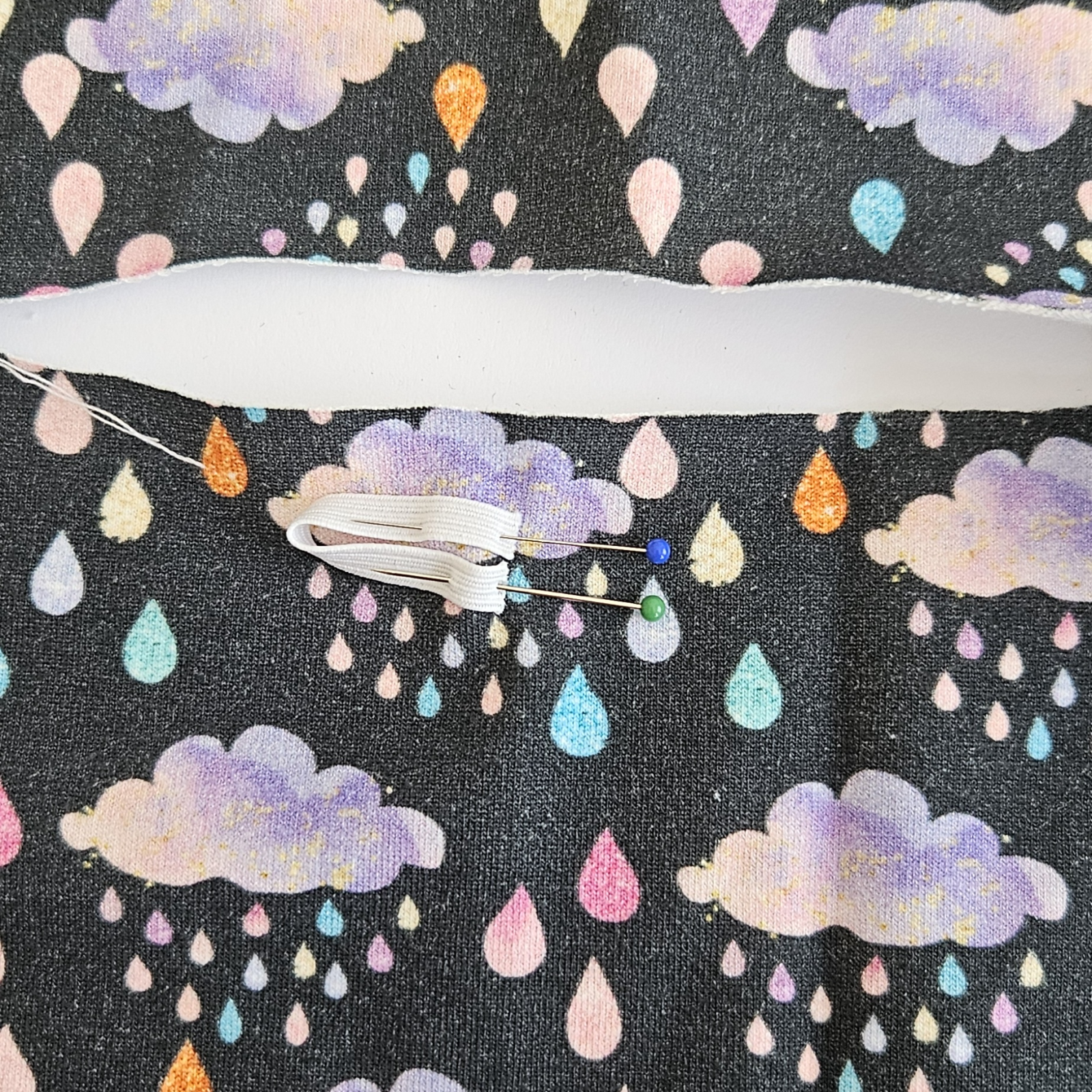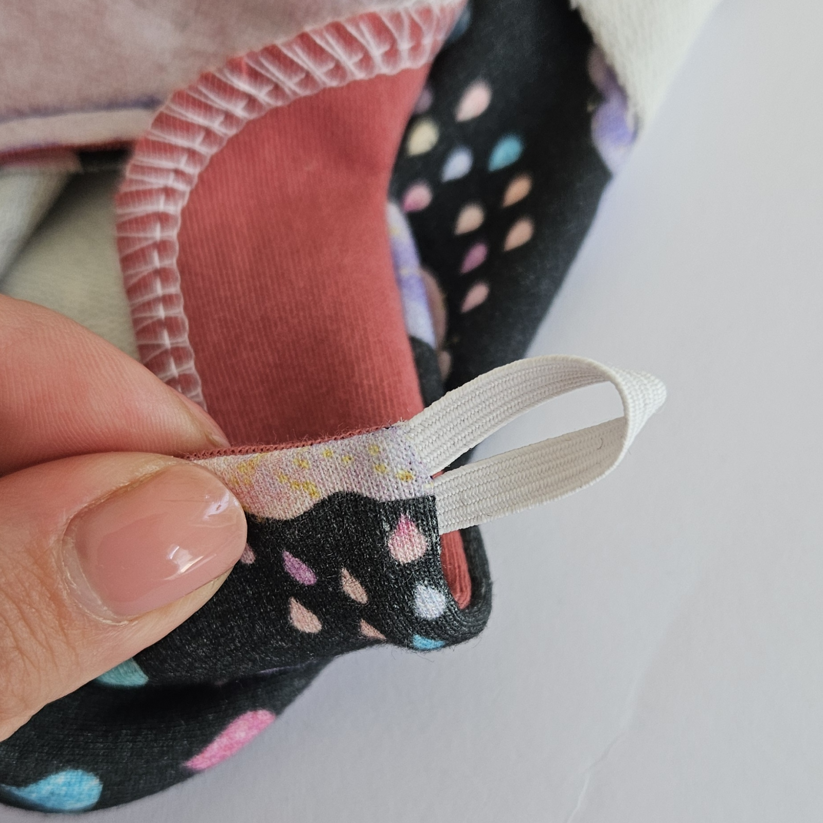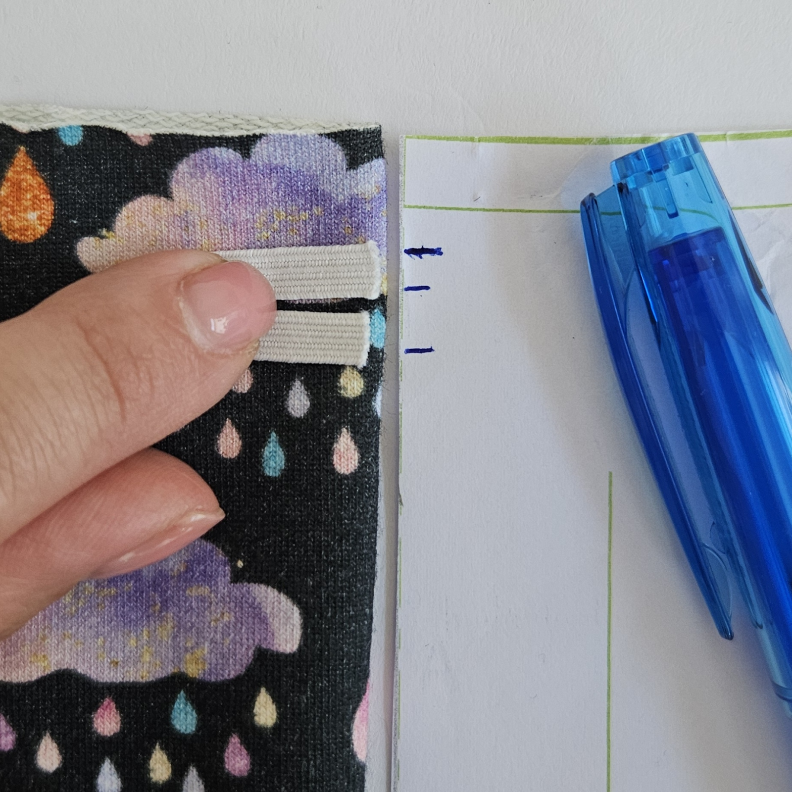 Na střihu si zakreslím umístění gumičky, je asi 1,5 cm od okraje