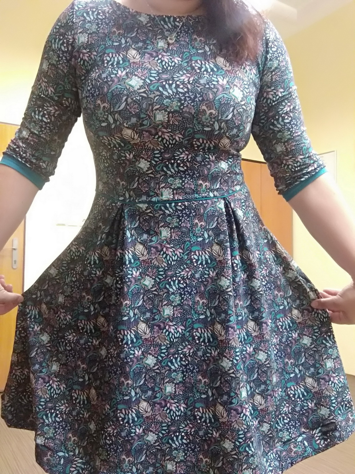 Lucie „Moje třetí a opět "wau". Přední díl sukně zkrácen cca o 20cm a zadní díl srovnán do stejné délky jako PD. Sukně zakončena lemem dle videa. Rukávy místo založení olemovány jednobarevným úpletem, ve stejné barvě vložen proužek mezi živůtek a sukni.“