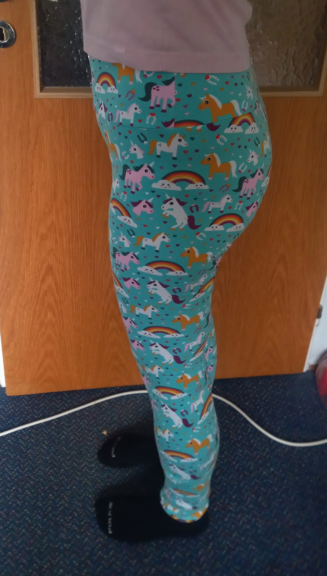 VV „I velké holky chtějí někdy duhové legíny s jednorožcem. 😆🦄🌈 Látka vyhraná v soutěži, doma dva kluci, co je jednorožci fakt neberou. Tak máma má aspoň legíny na doma. ♥️ Legíny Lucie. Sedí fakt skvěle. Šitá velikost 40, mírně prodloužené (úprava velikosti, super věc). Chystám se na tu verzi se sukní. Pas je skvěle tvarovaný, akorát budu muset prodat gumu, ten úplet má sice elastan, ale asi míň a trochu se mi shrnují.“