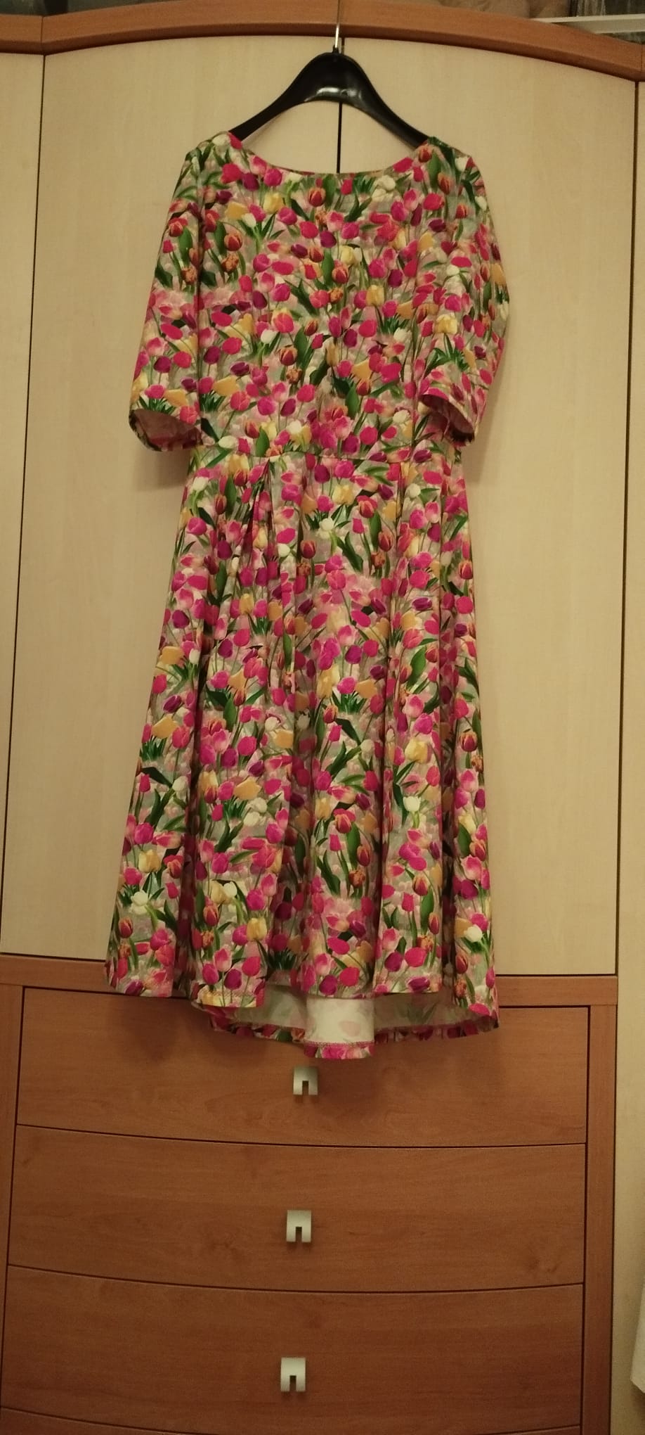 MM „Střih sedí perfektně. Cítím se v nich skvěle. Šaty jsem šila dvoje, jedny modré s kapsami, u tulipánových jsem kapsy nedělala. “