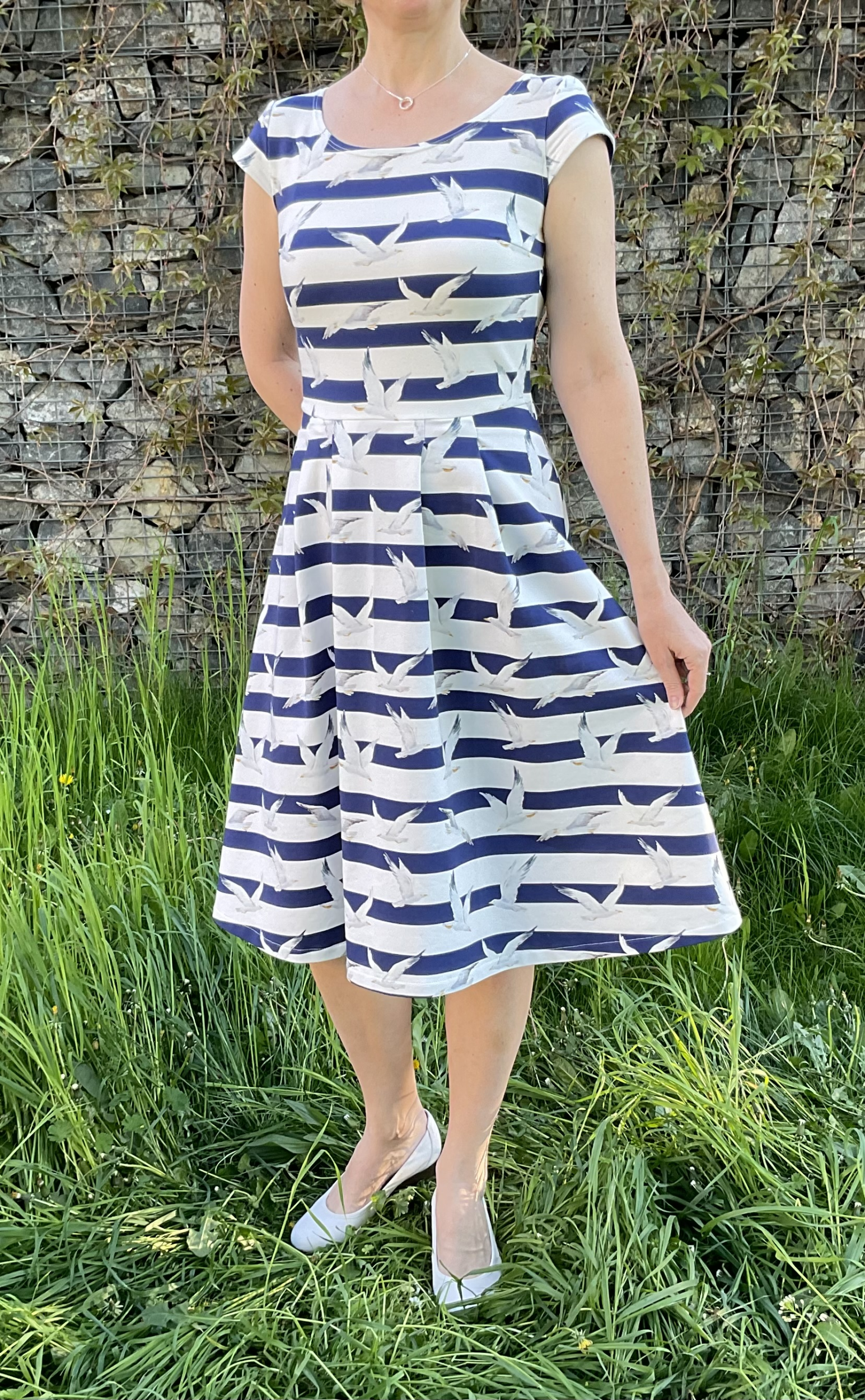 JK „Jedny letně námořnické, už dlouho jsem je chtěla 😍 Vršek a zadní díl sukně = Letníny, přední díl sukně = Pavlíny, jen jsem je záměrně jinak naskládala, aby sukně víc trčela uprostřed a dopředu. Výstřih tentokrát jen podehnutý a prošitý dvojjehlou, aby tam nebylo zbytečně moc látky. Zbožňuju, jak Živé střihy skvěle sedí a dají se kombinovat navzájem!“
