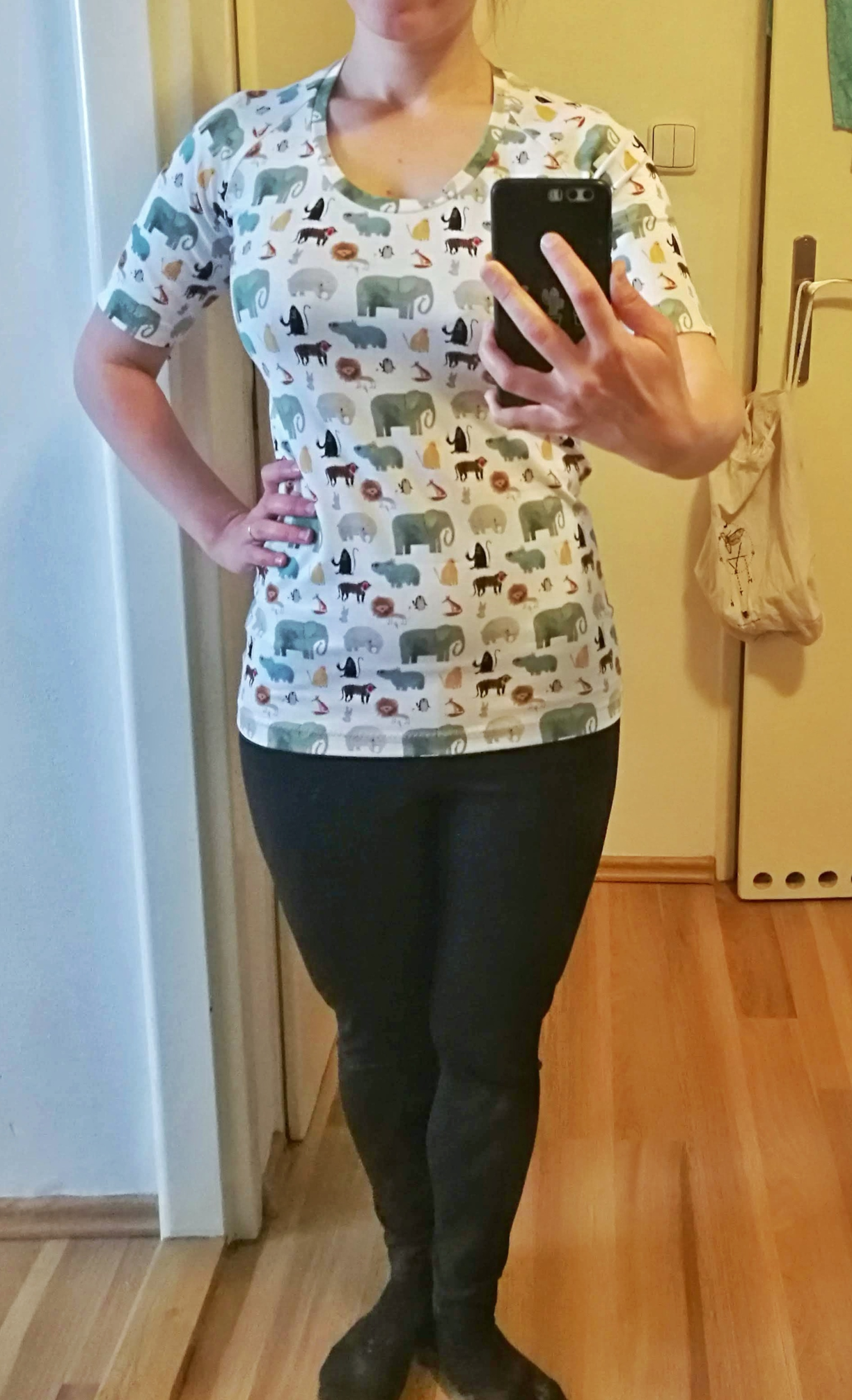 MF „Druhé triko Táňa určené na návštěvy zoo. Velikost je tentokrát tiptop. Výstřih zvětšený ještě o fousek víc, zkráceny rukávy, aby látka vyšla i na tričko pro prcka :)“