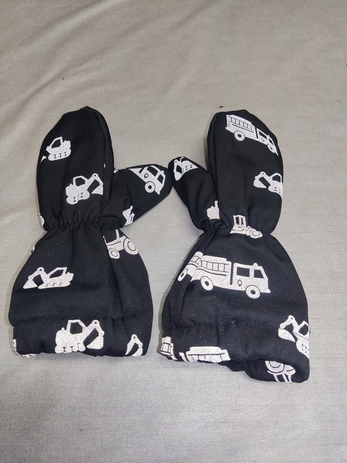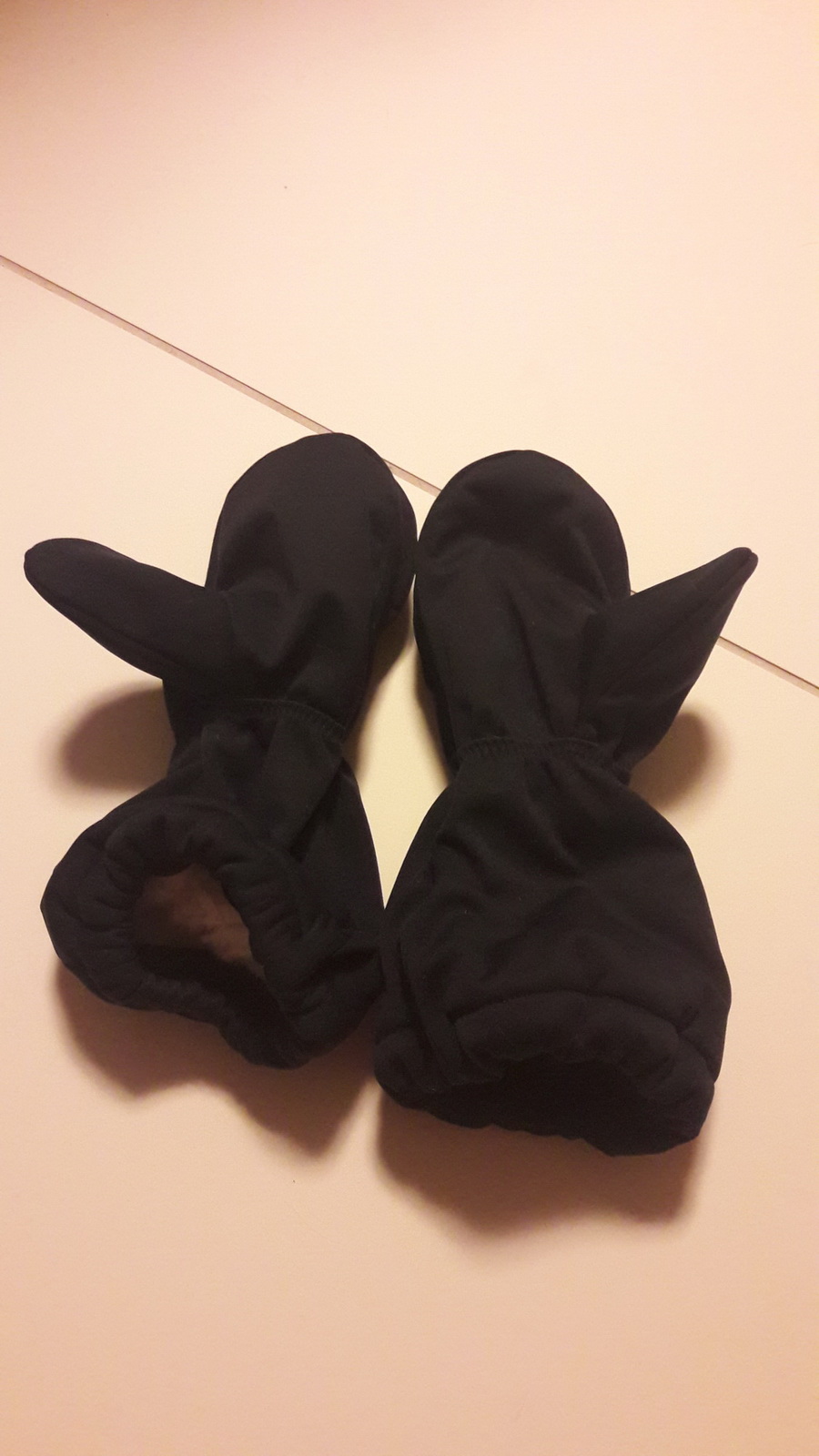 „Tohle jsou už asi páté, mám pocit, že už jsem je fakt vychytala. Tyhle jsou dokonce i krásně ušité 0:) Kombinace materilů je fajn, měla jsem strach, jestli to nebude moc trčet nebo něco a ono ne. A opět sedí jako prdel na hrnec a synovec "má konečně pořádné rukavice". Nasadí mu je i tatínek :) ke všeobecné spokojenosti.“