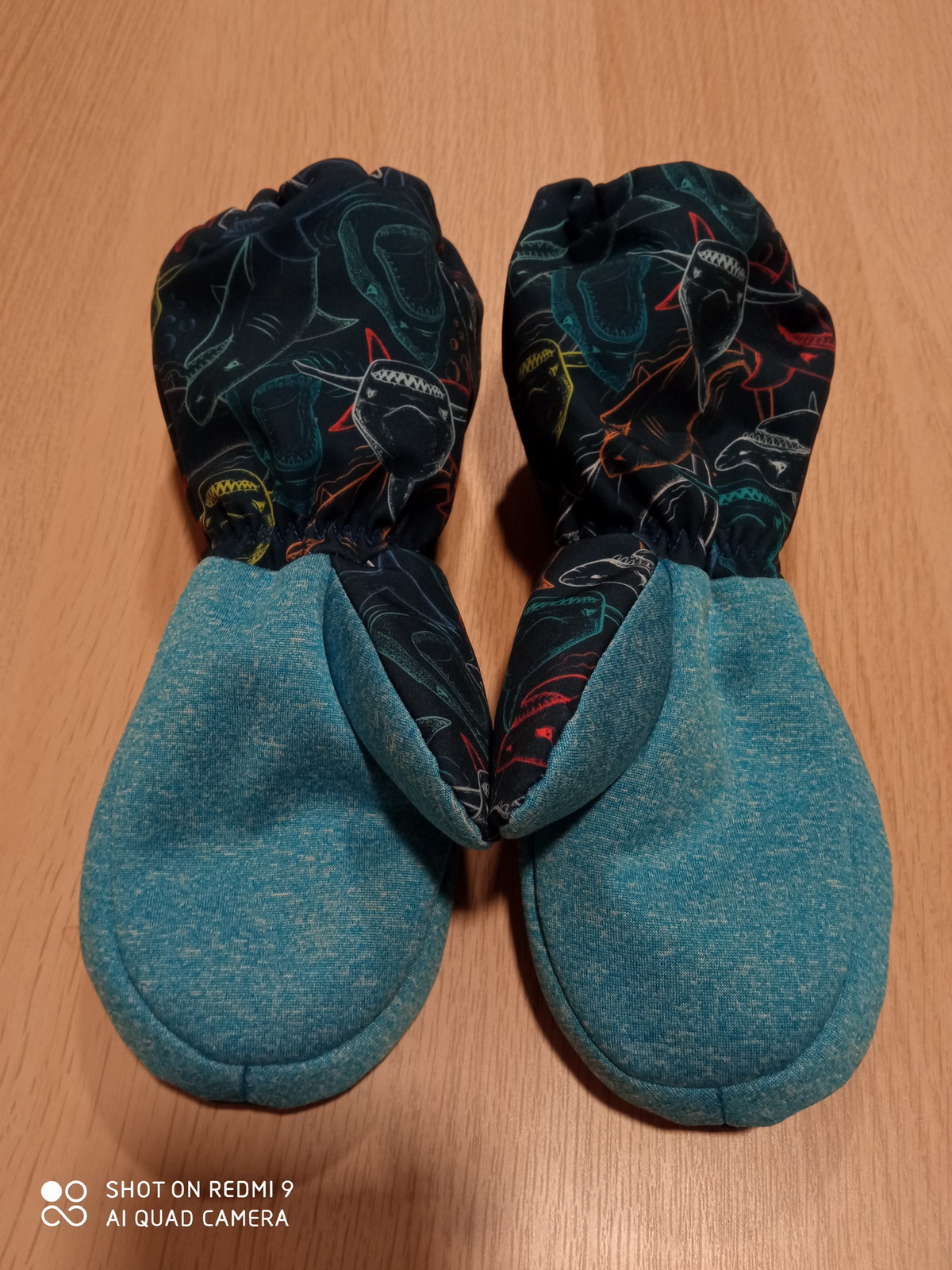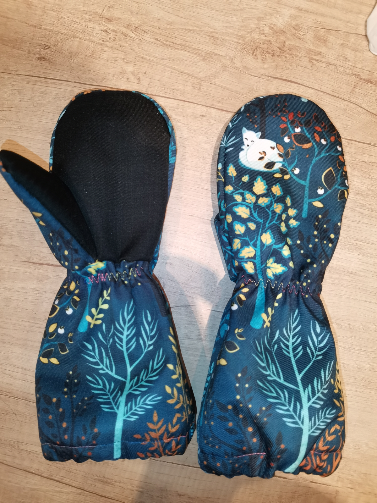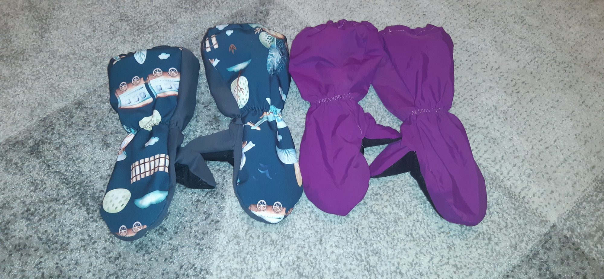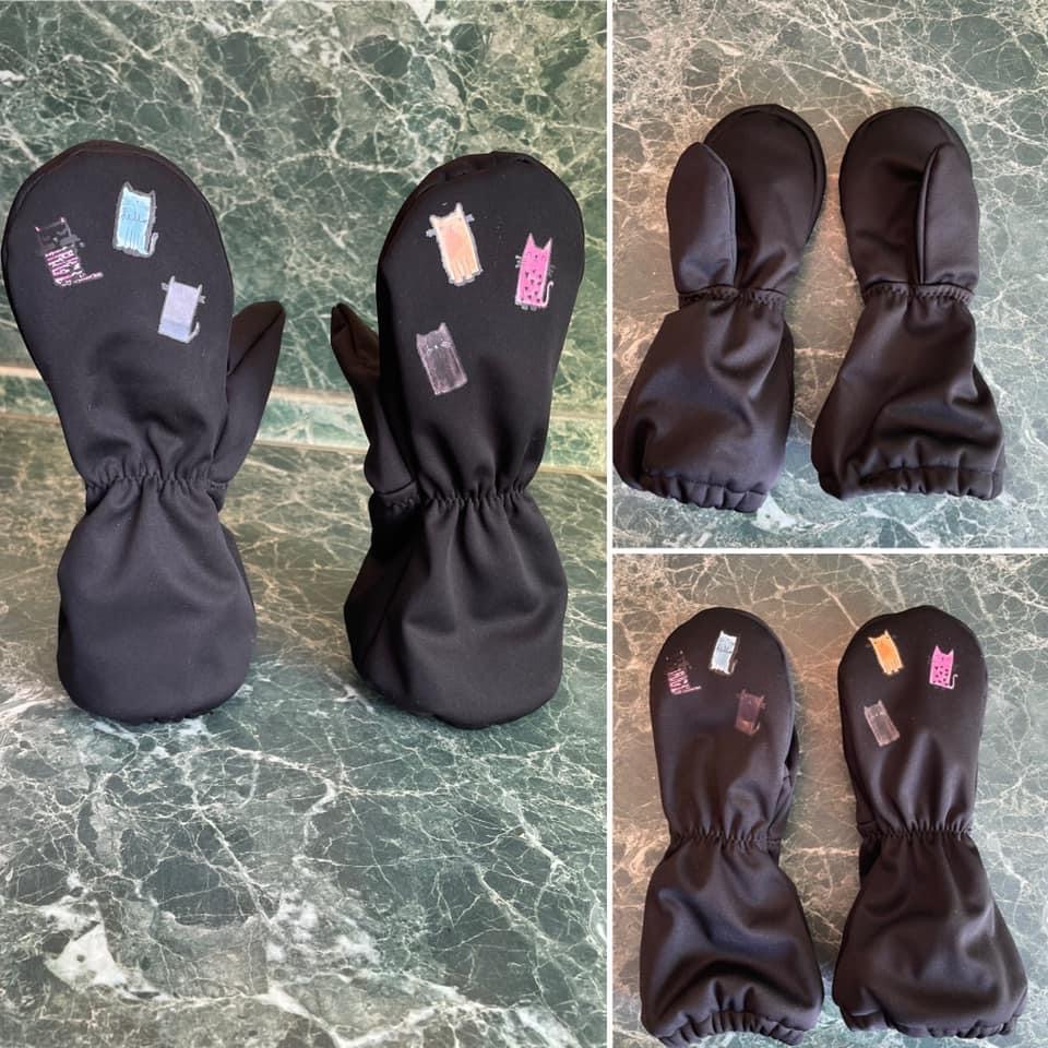 „Moje třetí :) Tyhle už šly jako po másle. Jsou pevnější než ze šusťáku, tepelně asi stejně. Ten softshell nám parametrově moc nevyhovuje... ale povrch je velmi příjemný. Warmkeeper jsem použila tak, že rubový chloupek je na dotykové straně, tisk nejde vidět (měla jsem takový akorátní zbytek). A to je velmi příjemná záležitost :) Syn maximálně spokojen. Už od rána je má na rukou a ani na snídani je nechtěl sundat. Ještě budu muset ušít pro synovce... Už jsme zkoušeli i ve sněhu a po dvou hodinách bobování cajk.“