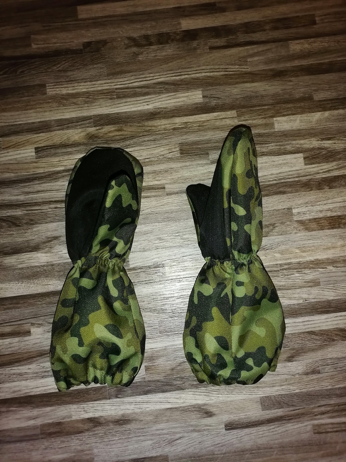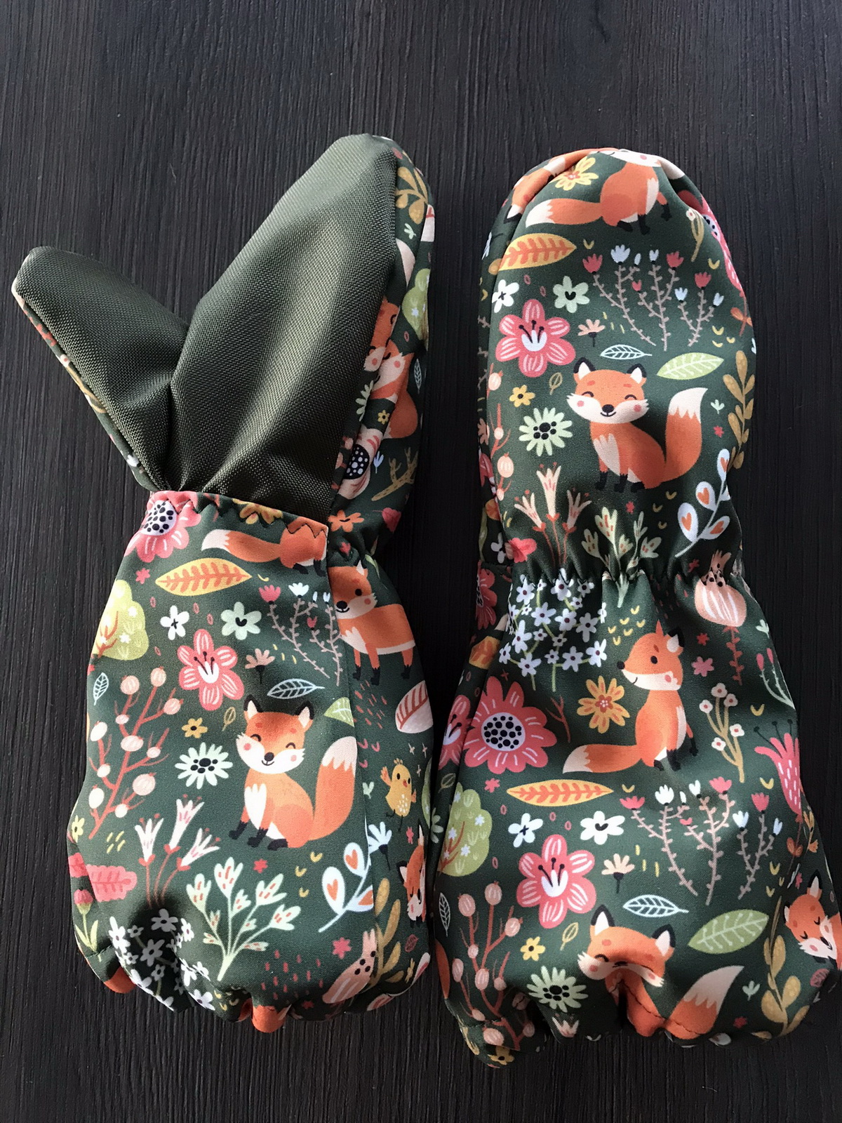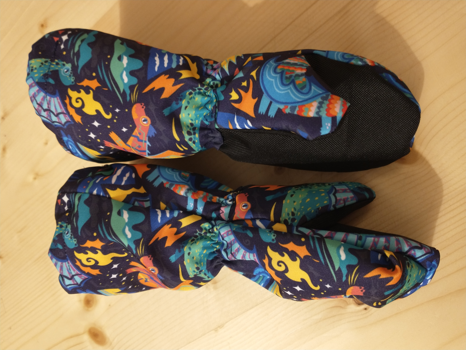 „Moje třetí :) Tyhle už šly jako po másle. Jsou pevnější než ze šusťáku, tepelně asi stejně. Ten softshell nám parametrově moc nevyhovuje... ale povrch je velmi příjemný. Warmkeeper jsem použila tak, že rubový chloupek je na dotykové straně, tisk nejde vidět (měla jsem takový akorátní zbytek). A to je velmi příjemná záležitost :) Syn maximálně spokojen. Už od rána je má na rukou a ani na snídani je nechtěl sundat. Ještě budu muset ušít pro synovce... Už jsme zkoušeli i ve sněhu a po dvou hodinách bobování cajk.“