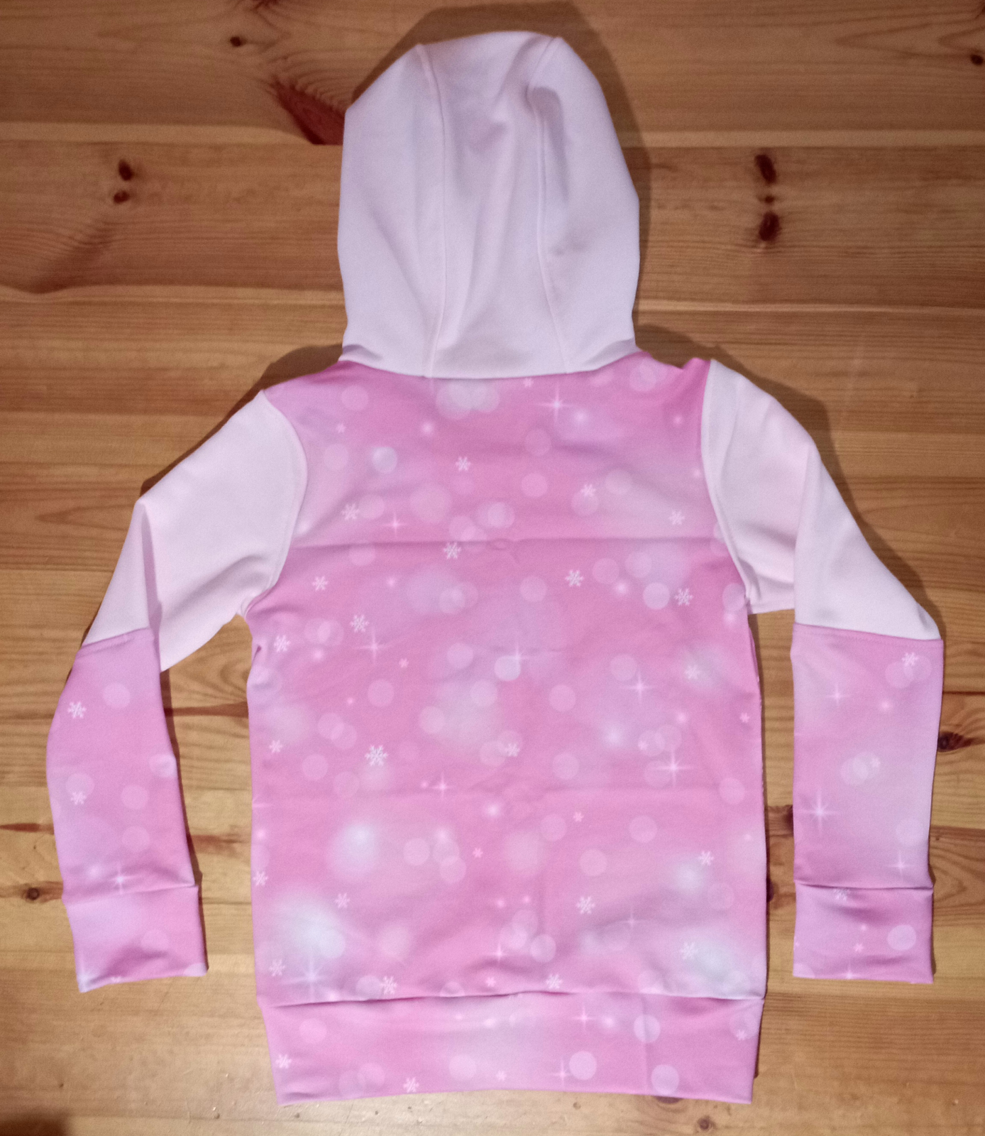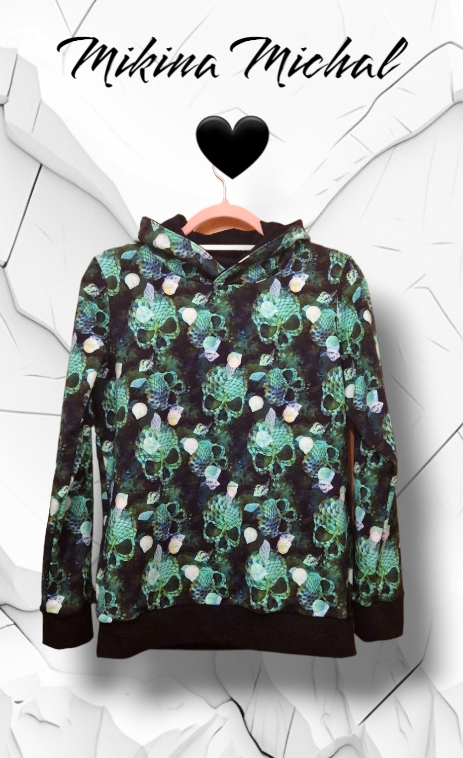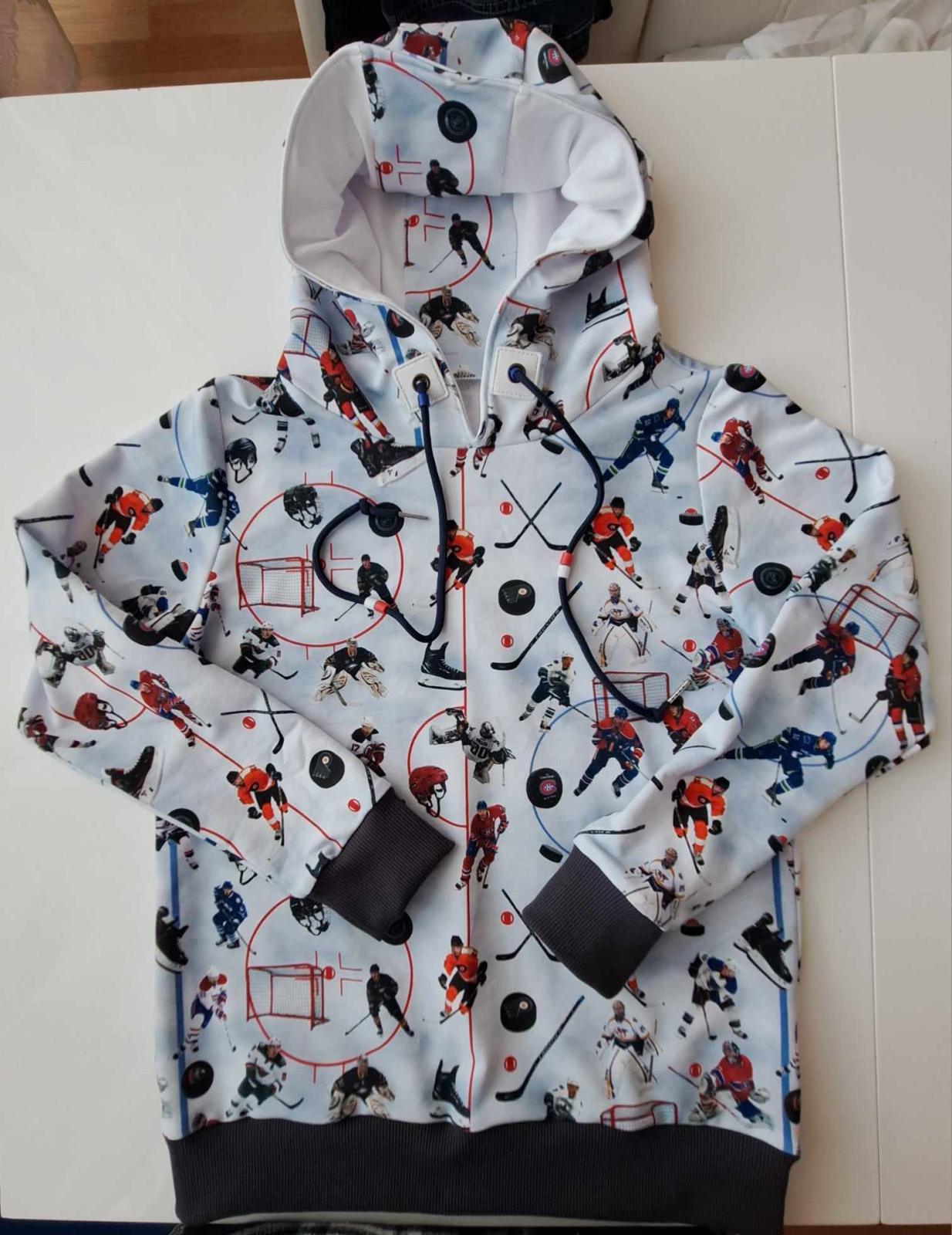„Môj prvý mikinový počin, navyše s kapucňou. Šila sa super aj keď mi úplne nevyšla kapucňa vpredu prekrížená a pridala som klokanie vrecko.“