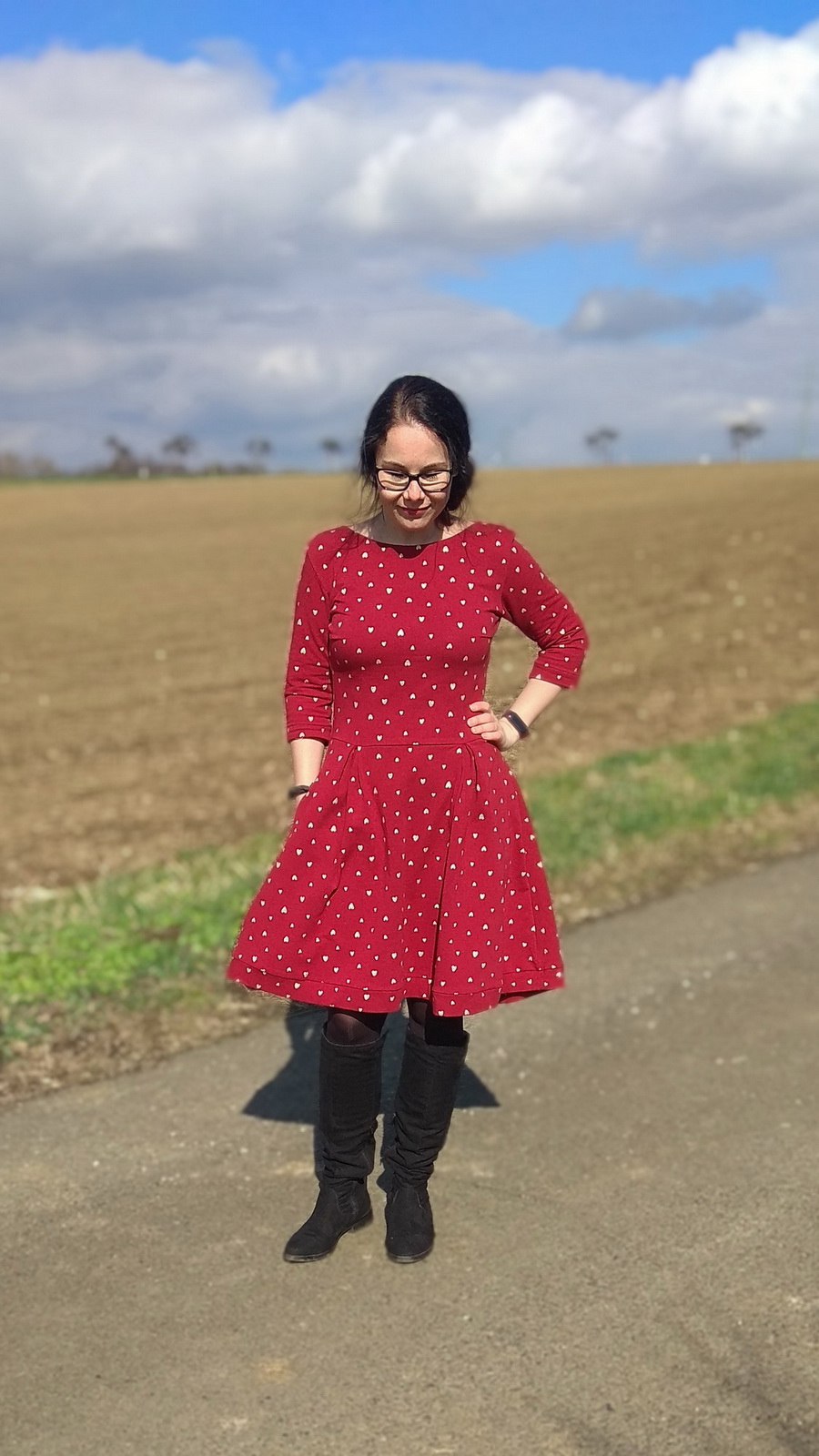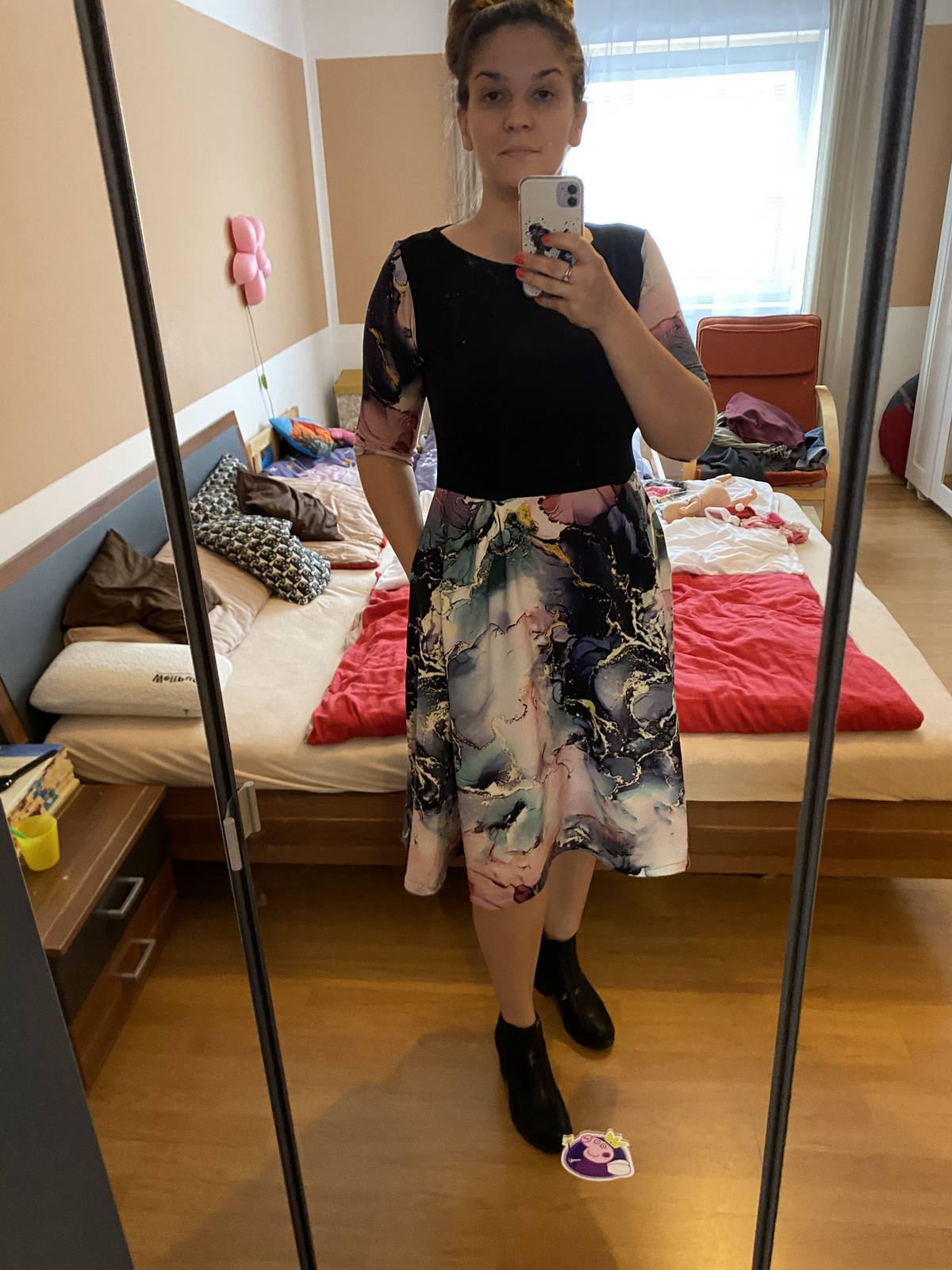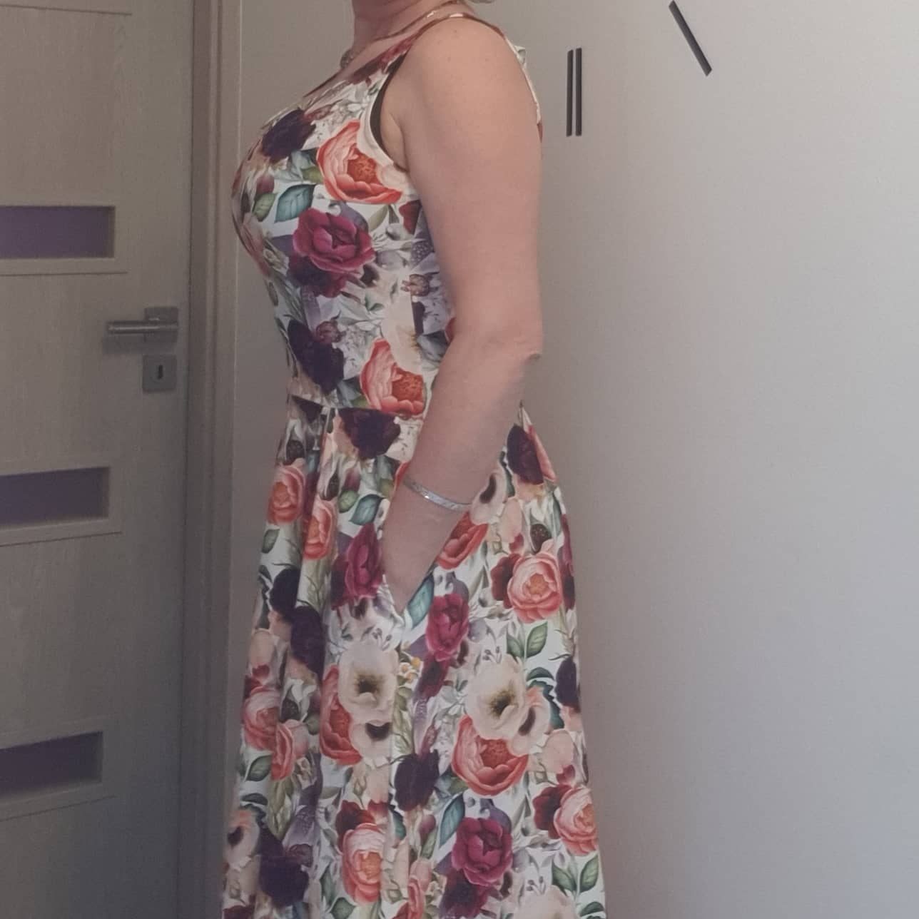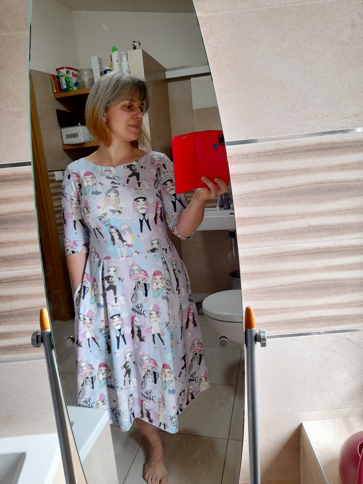 „Šaty jsou super, pohodlné. Spodní lem jsem zahla 5 cm a prošila dvojjehlou. Měřím 160cm.“