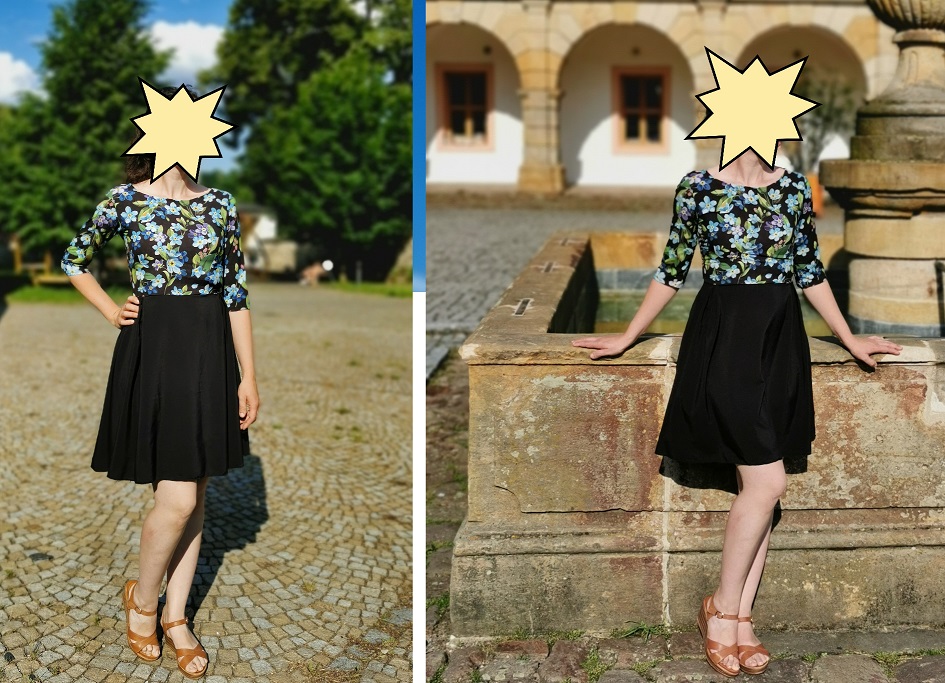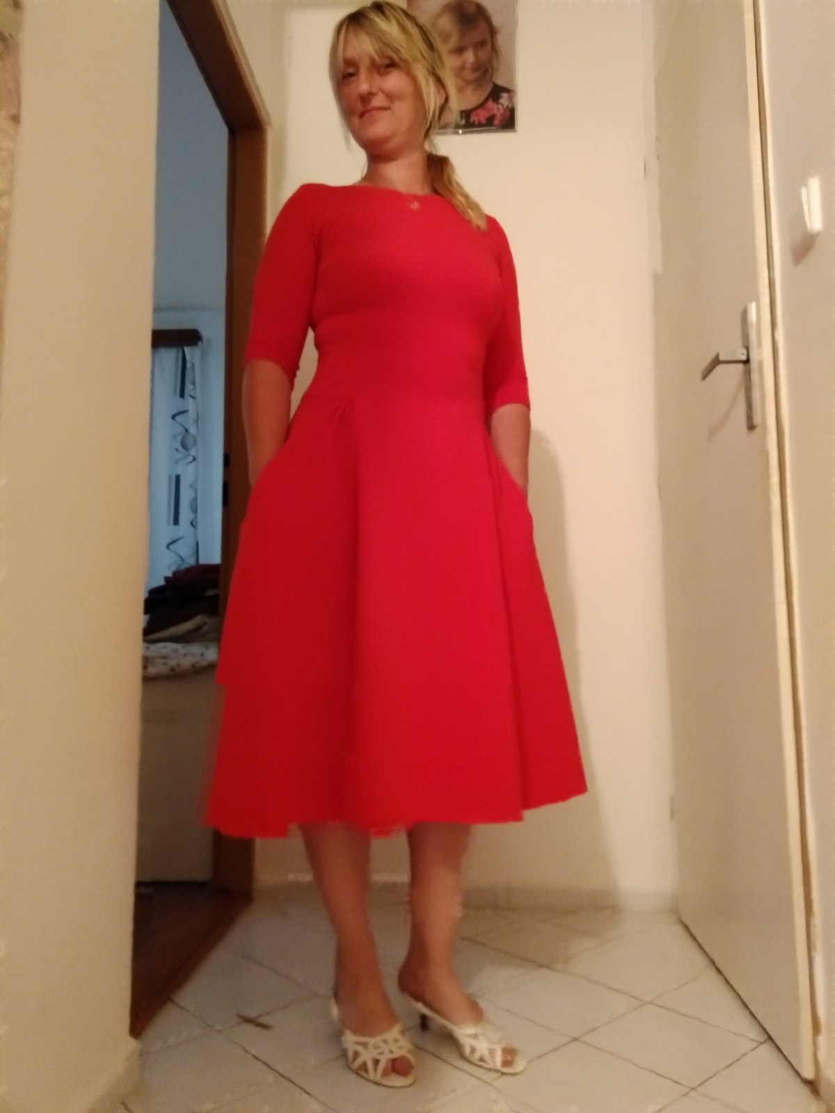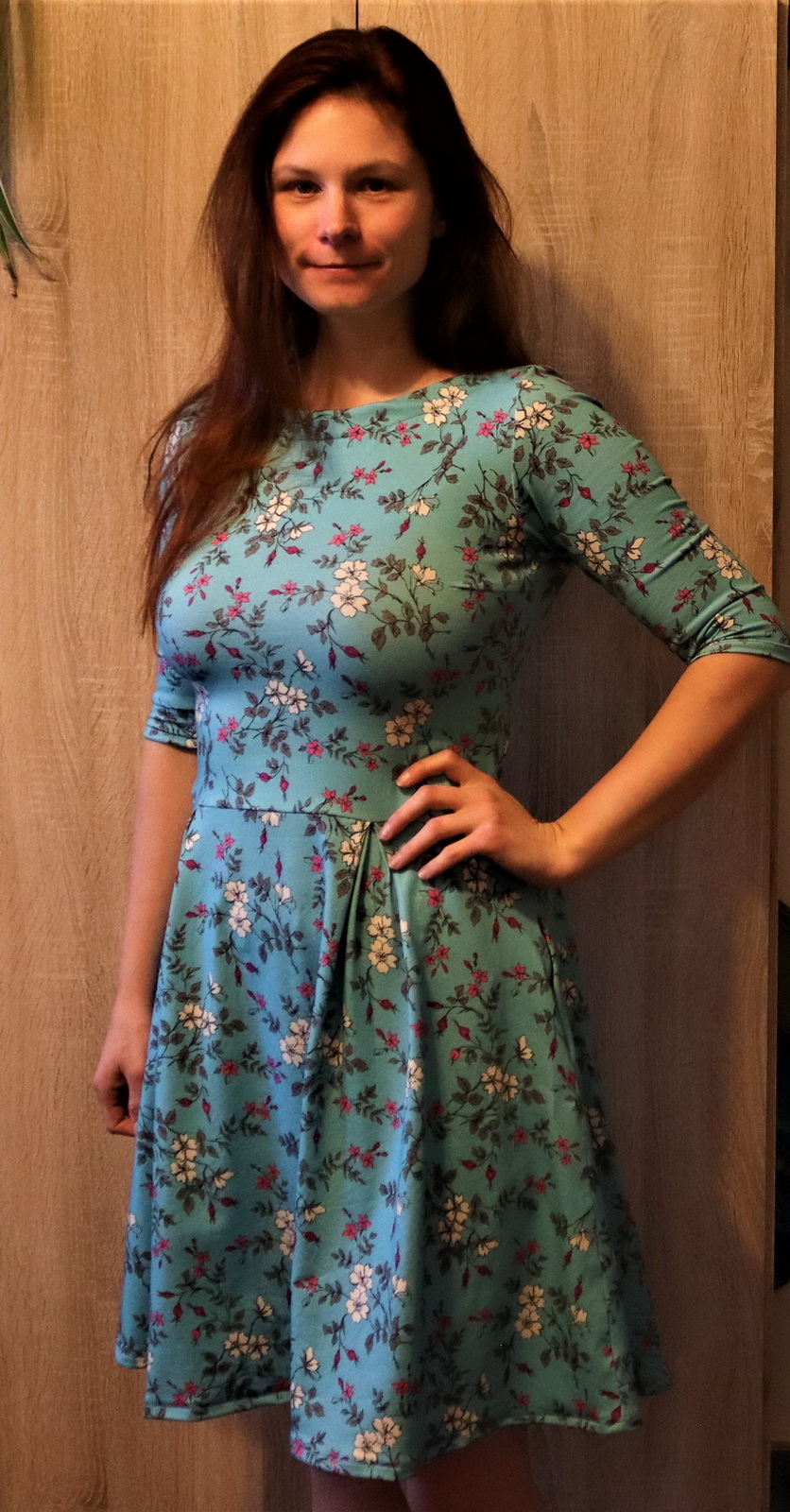 „Šaty se šily pěkně, ale pro příště vynechám dvojité sklady na PD sukně a zadní díl zkrátím. Do pasového švu jsem všila gumičku, aby šaty neodstávaly.“