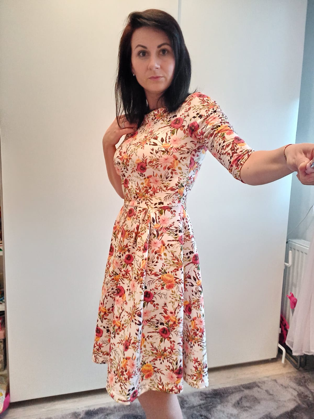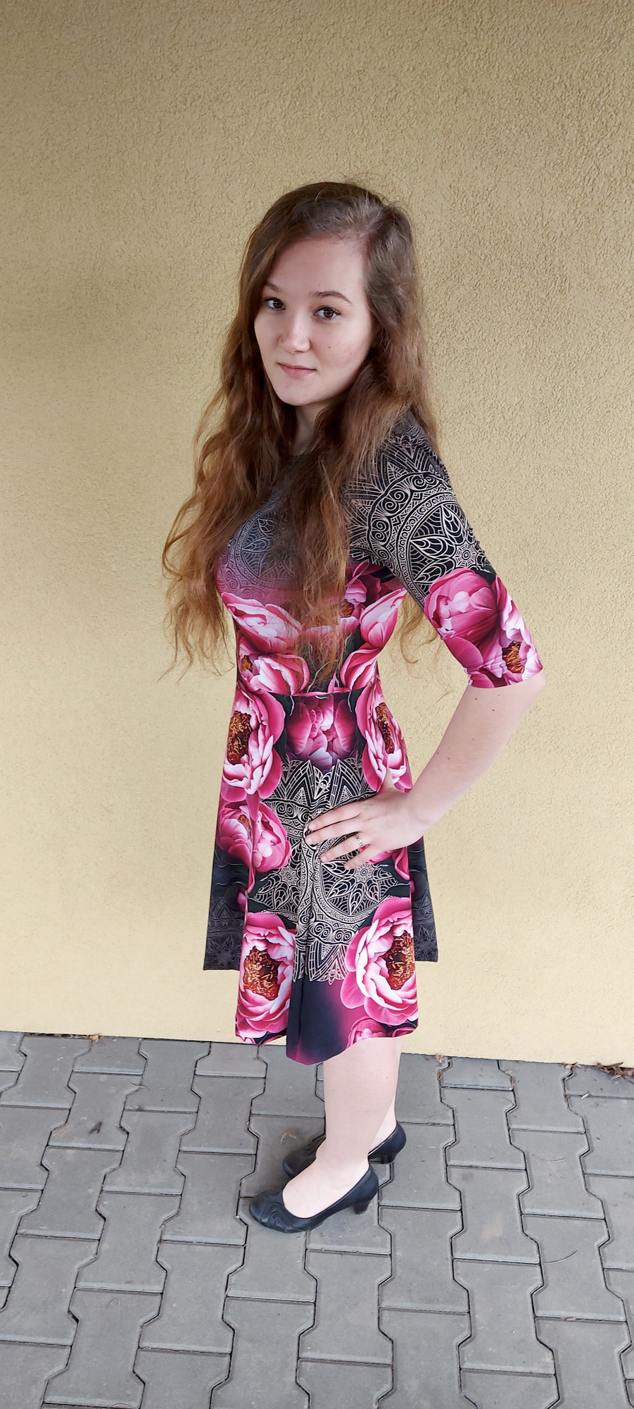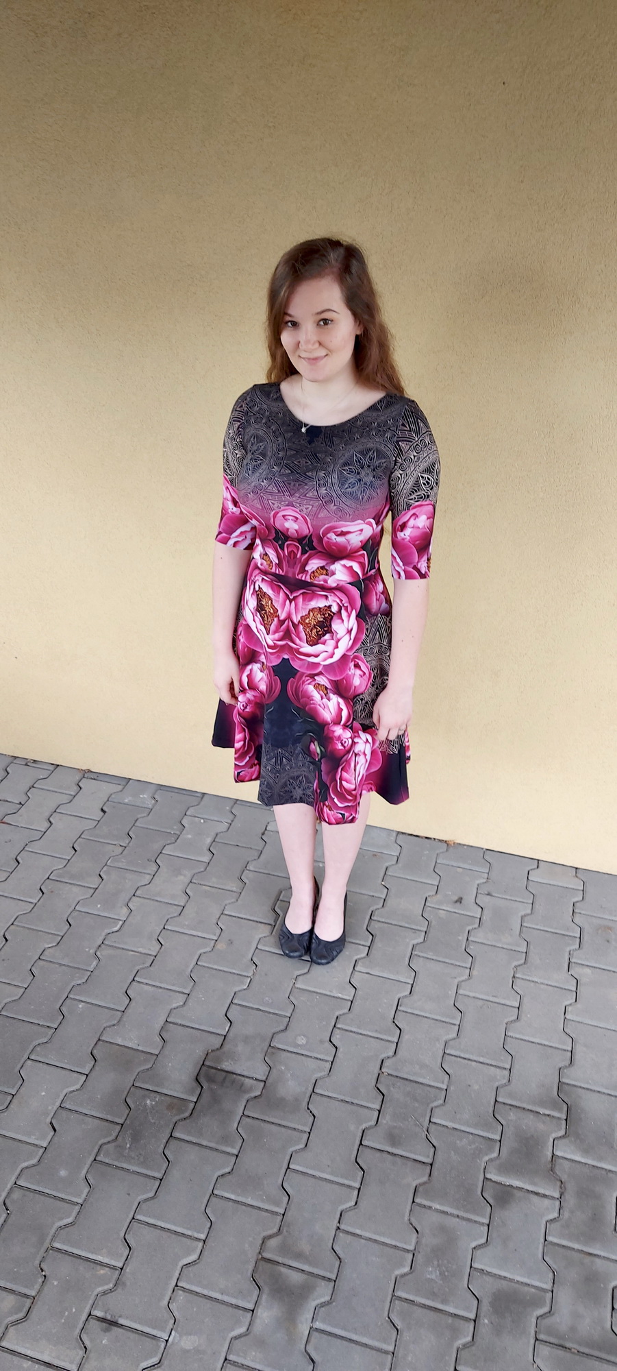 „MOC spokojena, střih i videonávod srozumitelný!Aneb šaty Pavlína ze SILKY- Jde to!:)Zde mé postřehy: Střih je určen pro úplet nebo teplákovinu, nutno přeměřit své proporce a hlavně připočíst i fakt, že silky "jen" mírně pruží , resp.ne tolik jako úplet nebo teplákovina s elastanem.Nosím běžně vel. 38,po zvážení mé postavy střihnuto v tomto případě vel.40+švy. Rukávy jsem raději rozšířila(květované látky bylo málo,nemohla jsem si dovolit chybu,že se do nich nevejdu) 😛.Na šatech není žádný zip nebo zapínání-přetahuji přes hlavu . Záševky jsem "vynechala". (Na ta má kůzlátka je to zbytečný 😛).Myslím, že se nic nestalo a i tak to vypadá dobře. Délka sukně zvolena podle svého uvážení a konzervativnosti, zakončeno rolovacím stehem. Rolovací steh + ohnutí a ruční stehování jsou rukávy i kolem krku.“
