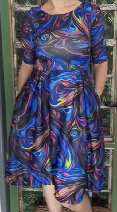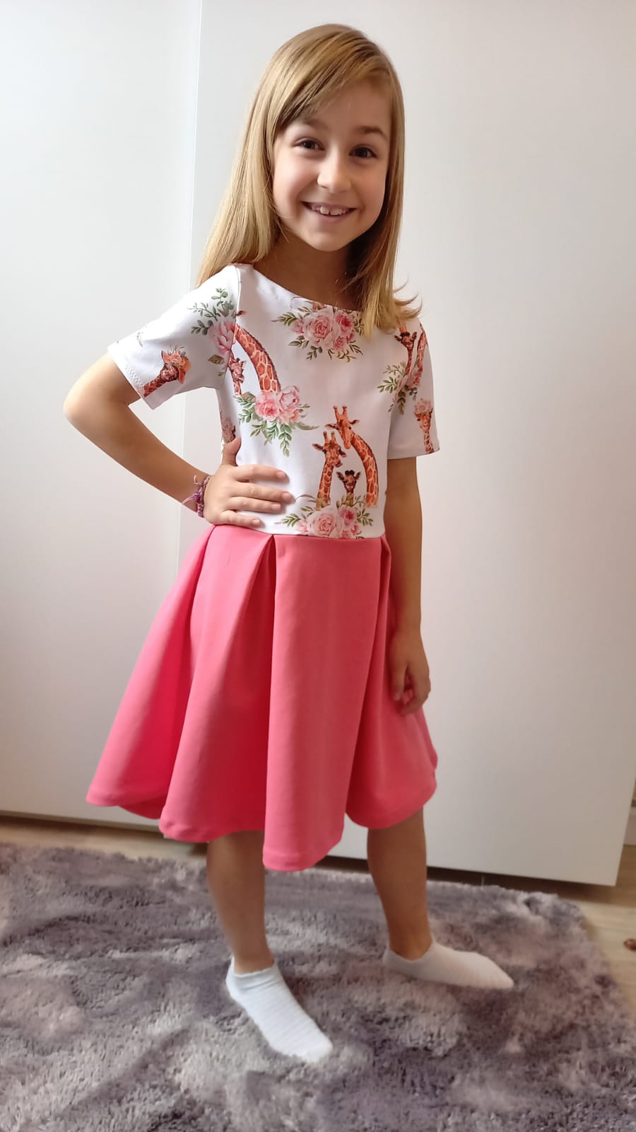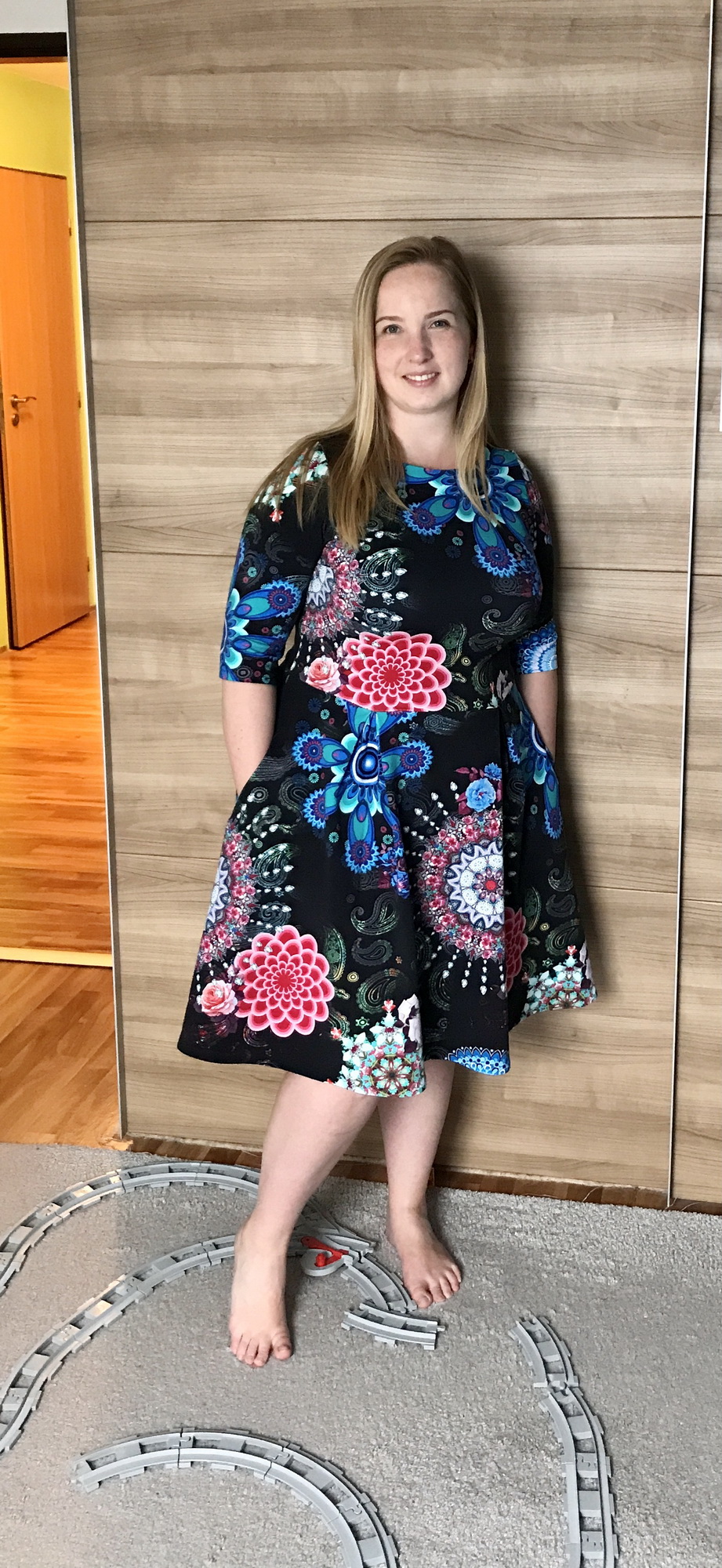 „MOC spokojena, střih i videonávod srozumitelný!Aneb šaty Pavlína ze SILKY- Jde to!:)Zde mé postřehy: Střih je určen pro úplet nebo teplákovinu, nutno přeměřit své proporce a hlavně připočíst i fakt, že silky "jen" mírně pruží , resp.ne tolik jako úplet nebo teplákovina s elastanem.Nosím běžně vel. 38,po zvážení mé postavy střihnuto v tomto případě vel.40+švy. Rukávy jsem raději rozšířila(květované látky bylo málo,nemohla jsem si dovolit chybu,že se do nich nevejdu) 😛.Na šatech není žádný zip nebo zapínání-přetahuji přes hlavu . Záševky jsem "vynechala". (Na ta má kůzlátka je to zbytečný 😛).Myslím, že se nic nestalo a i tak to vypadá dobře. Délka sukně zvolena podle svého uvážení a konzervativnosti, zakončeno rolovacím stehem. Rolovací steh + ohnutí a ruční stehování jsou rukávy i kolem krku.“