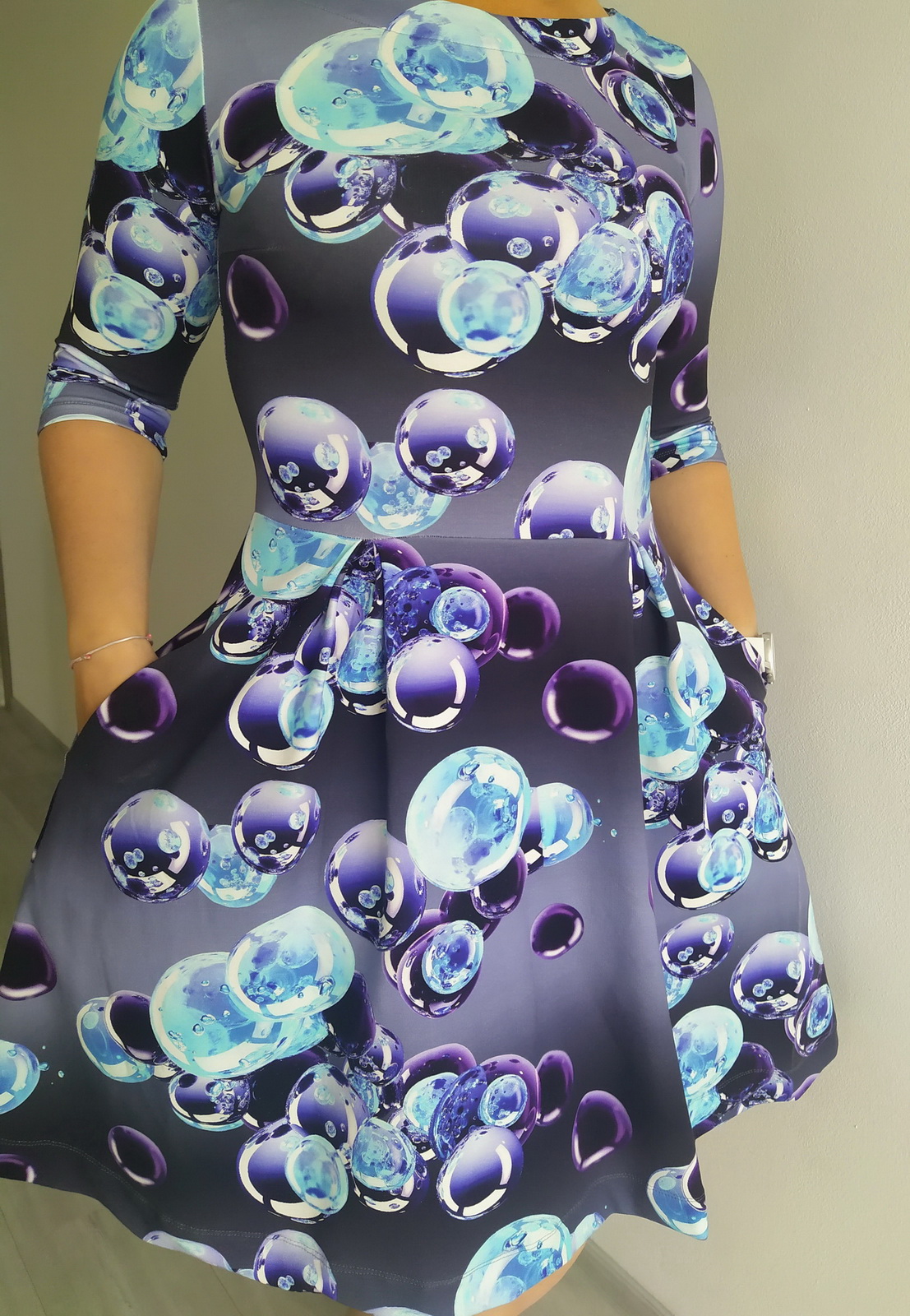 Střih byl konstruován pro pružnou teplákovinu s elastanem. Teplákovina je trochu pevnější než úplet. Zákaznice šaty s úspěchem šijí i z úpletu. Tady bych sáhla raději po nějakém s vyšší gramáží, ať se nevytáhne živůtek pod tíhou sukně. Některé odvážné zákaznice zkoušeli šít šaty i z velmi málo pružné silky (volily o velikost větší střih) a byly spokojené - viz inspirační album. Sama tuto variantu vyzkoušenou nemám.