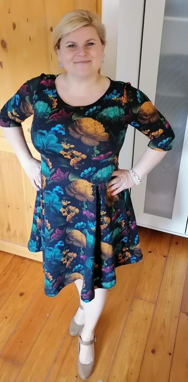 „Perfektní střih a ušito doslova raz dva. Provedla malou úpravu výstřihu a musela jsem trochu upravit sukni, s ohledem na použitou borduru.“
