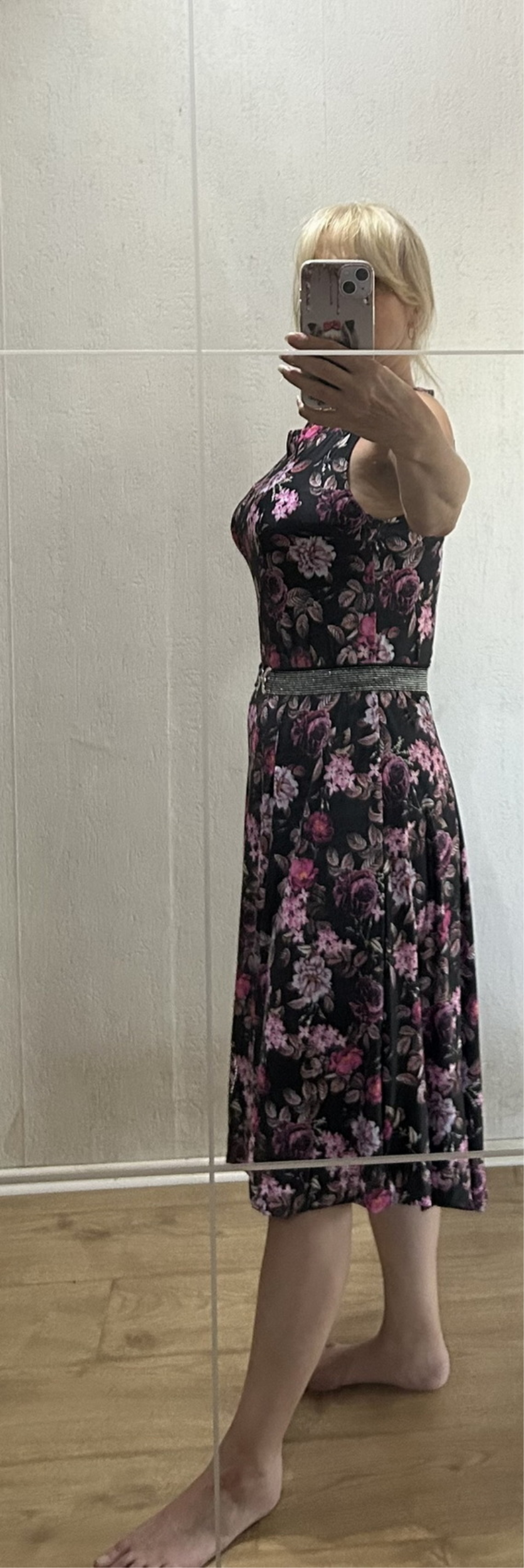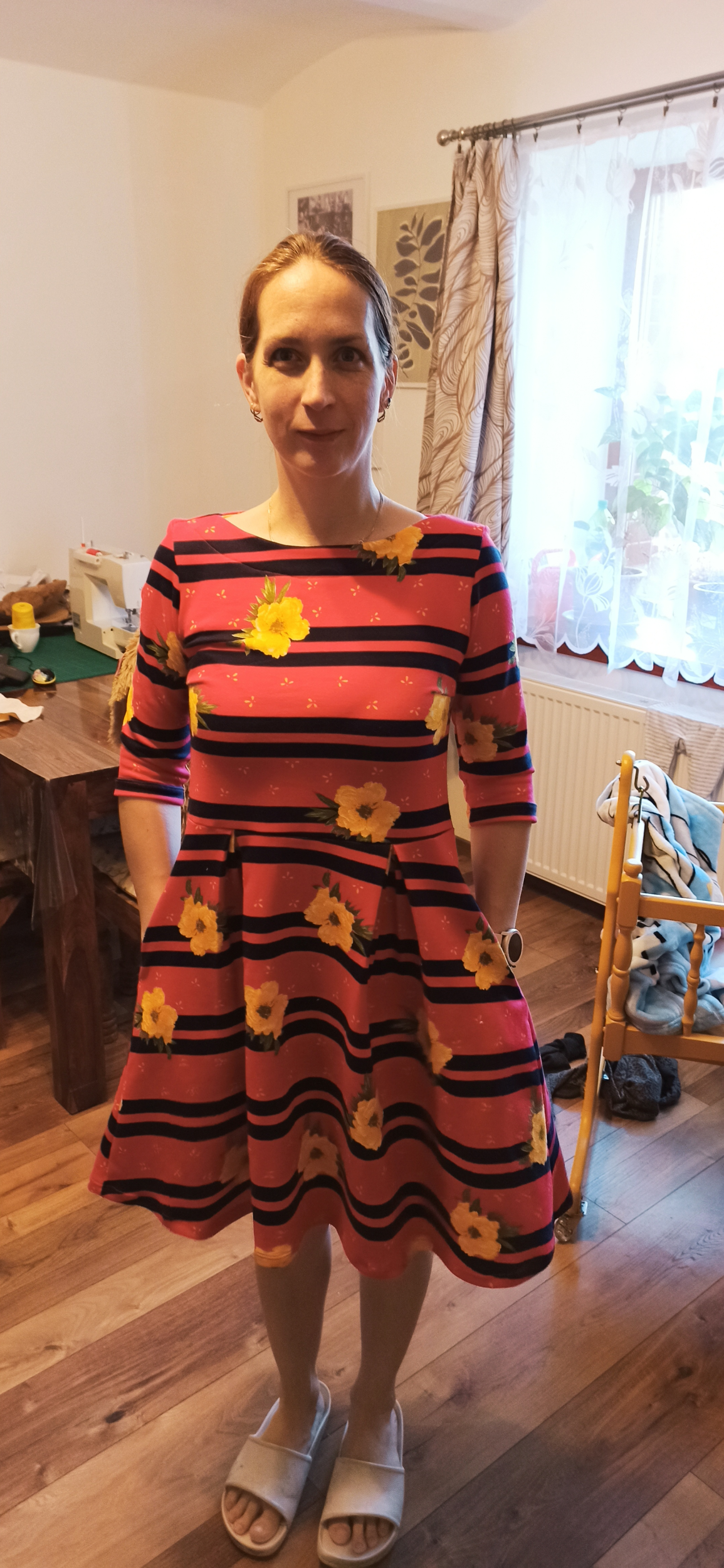 „Šaty se šily dobře, už jsem šila druhé. Akorát jsem zašila sklady, připadalo mi, že z téhle látky trochu trčely. Je to trochu silnější materiál, než jsem čekala, ale takhle, myslím, sedí dobře 😊.“