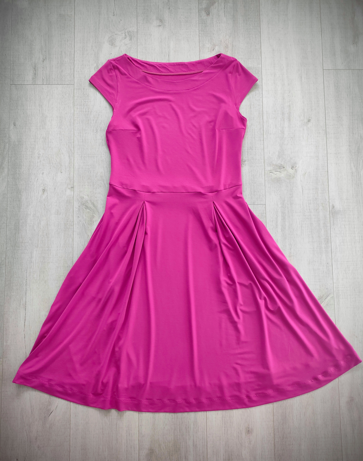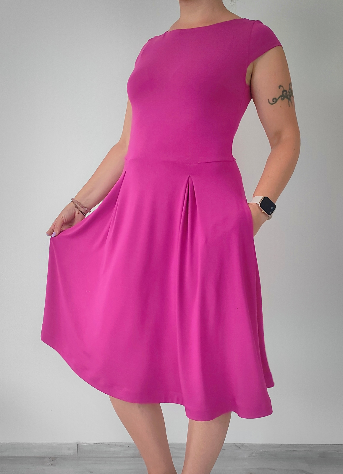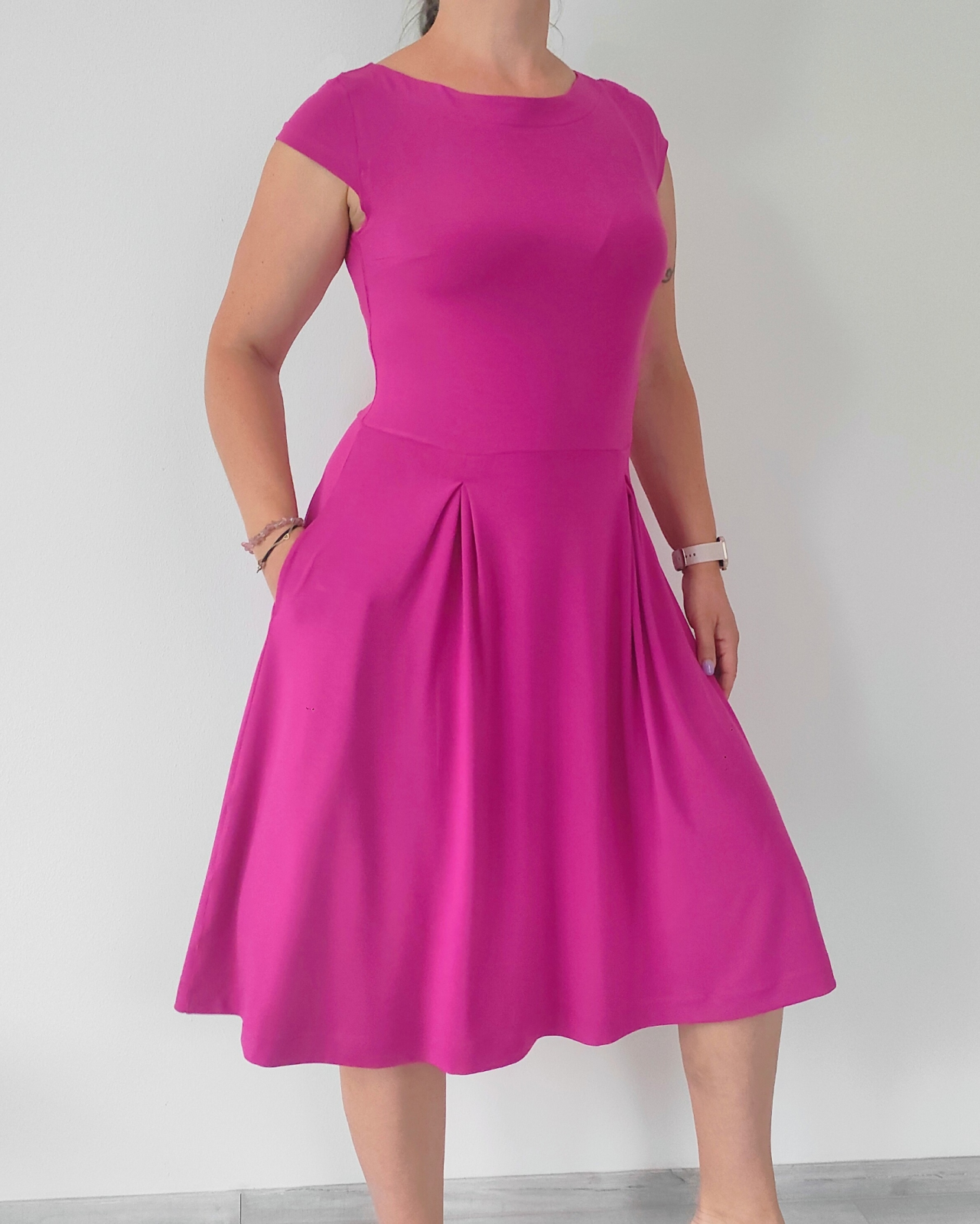„Jsem moc spokojená! Videonávod je super a střih krásně sedí! Rukávy a kapsy jsem vynechala a sklady na sukni sešila po délce. Určitě budu šít do svého šatníku další.“