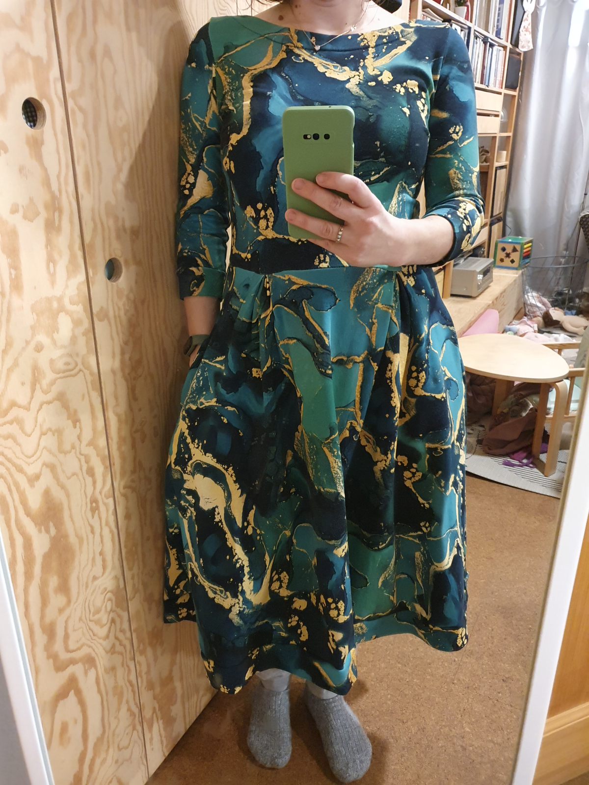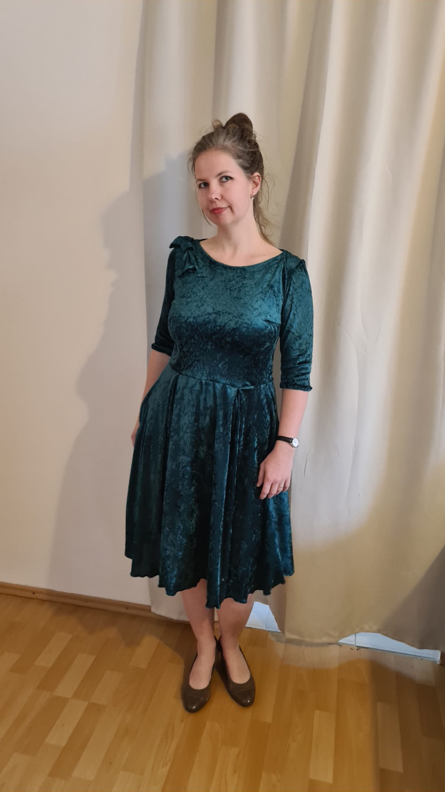„Strih sedí perfektne, nikde som nič neupravovala (pri zelených som mierne skrátila živôtik, inak bez zmeny). Video návod je super zrozumiteľný a šaty sa šijú naozaj dobre. Páči sa mi, že majú vrecká, sú pohodlné a ženské.“
