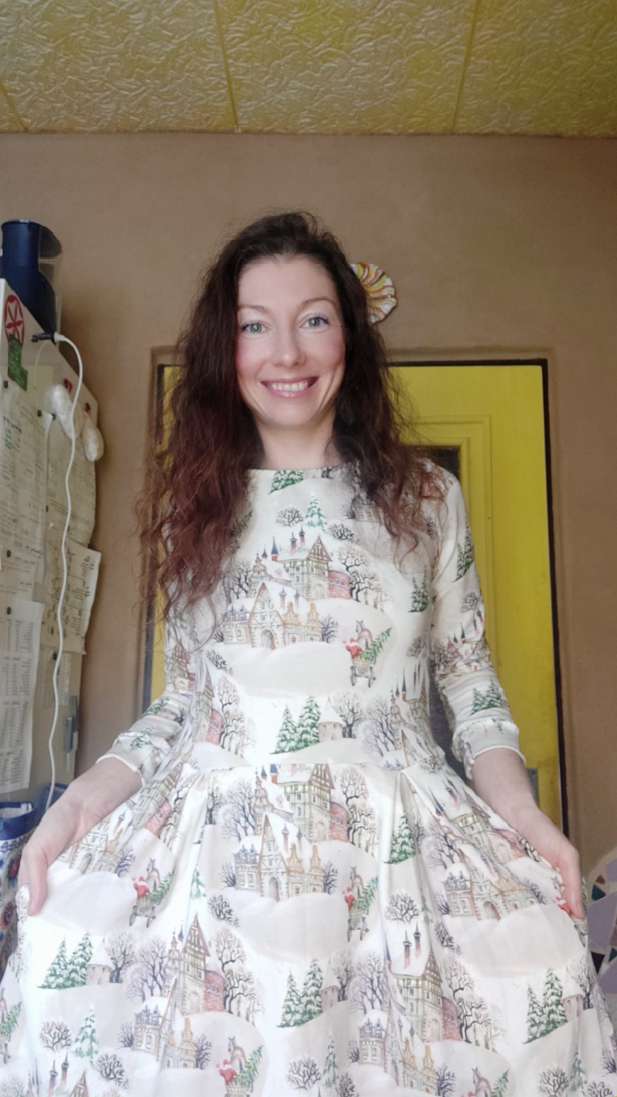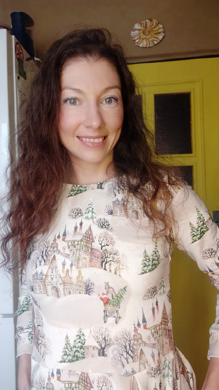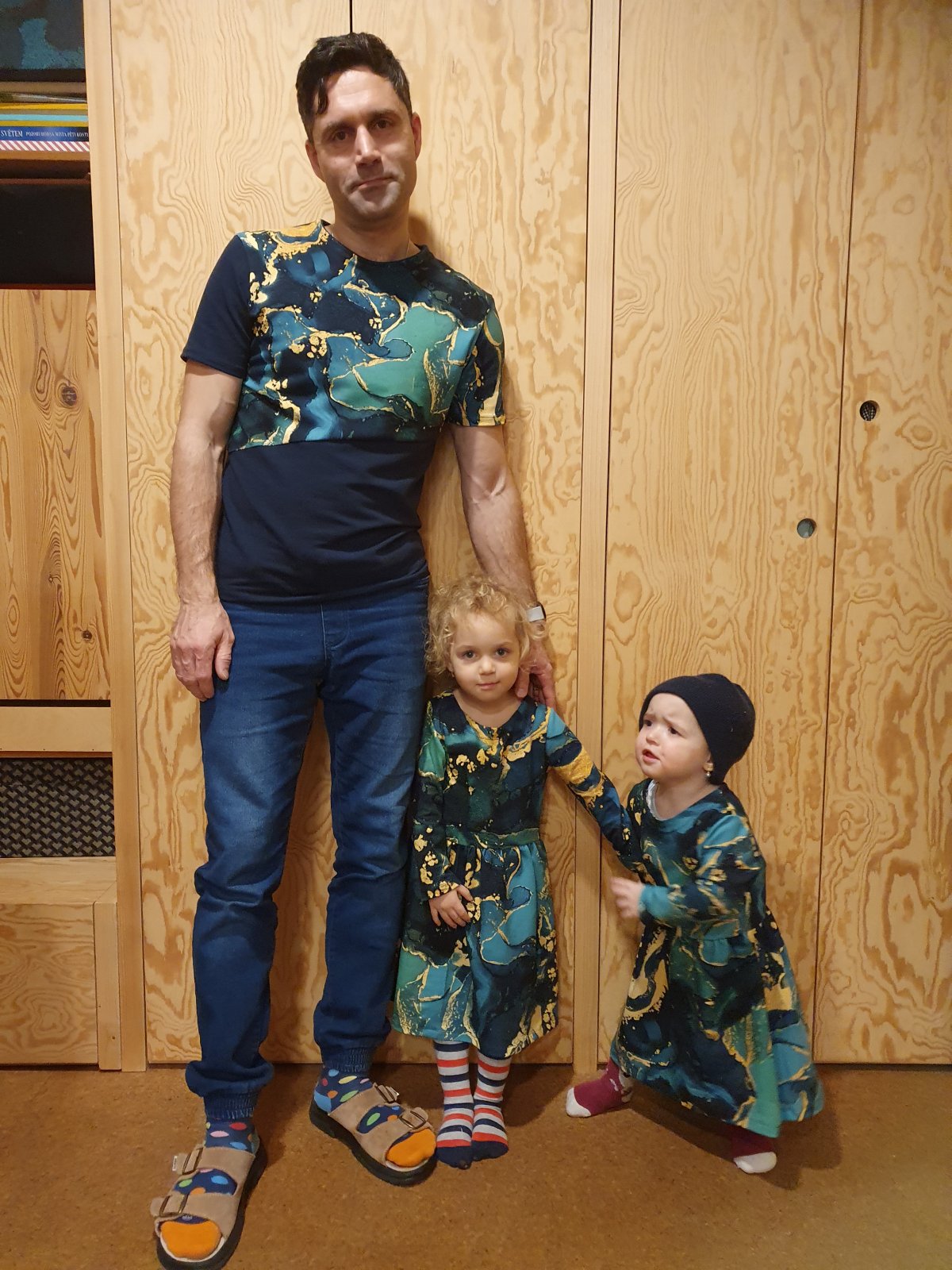 „Šaty jsem šila poprvé. Velmi mi pomohl videonavod a skvělé jsou sesazovaci značky. Díky jim jsem neprehodila rukav, což se mi málem přihodilo. Šilo se mi dobře, leč pomalu, abych neudělala chybu. Pro opatrnost jsem šila 42, ale pak životek trochu projmula po vyzkoušení,zbytek steihla ve 42.Po celem usiti jsou šaty trošku větší než se mi zprvu zdálo. Příště rovnou zvolím 40. Vychazela mi podle tabulek na moji postavu ale když jsem měřila strih a jiné moje šaty, zdal se mi maly a raději strihla 42. Rukavy jsem strihla delší a zakoncila sirokym lemem, aby byly spise 3/4. Měla jsem 2,5m šíře 165cm a vyšlo mi na moje šaty, pak holcickam jednodušší podle vlastního strihu dle saticek a nakonec ještě vyzbylo pro chlapa, ikdyž jen kousek. V kombinaci s jednobarevkou je triko skvělé a máme nejen Vánoční rodinný set. Díky za motivaci, chytlo mne to. Původně jsem chtěla jen šaty pro sebe😁“