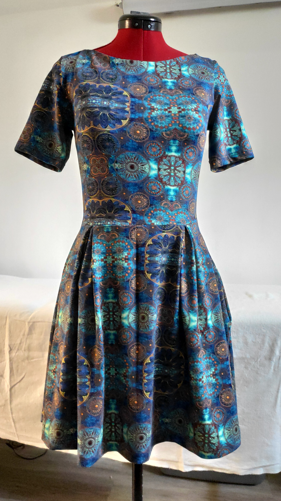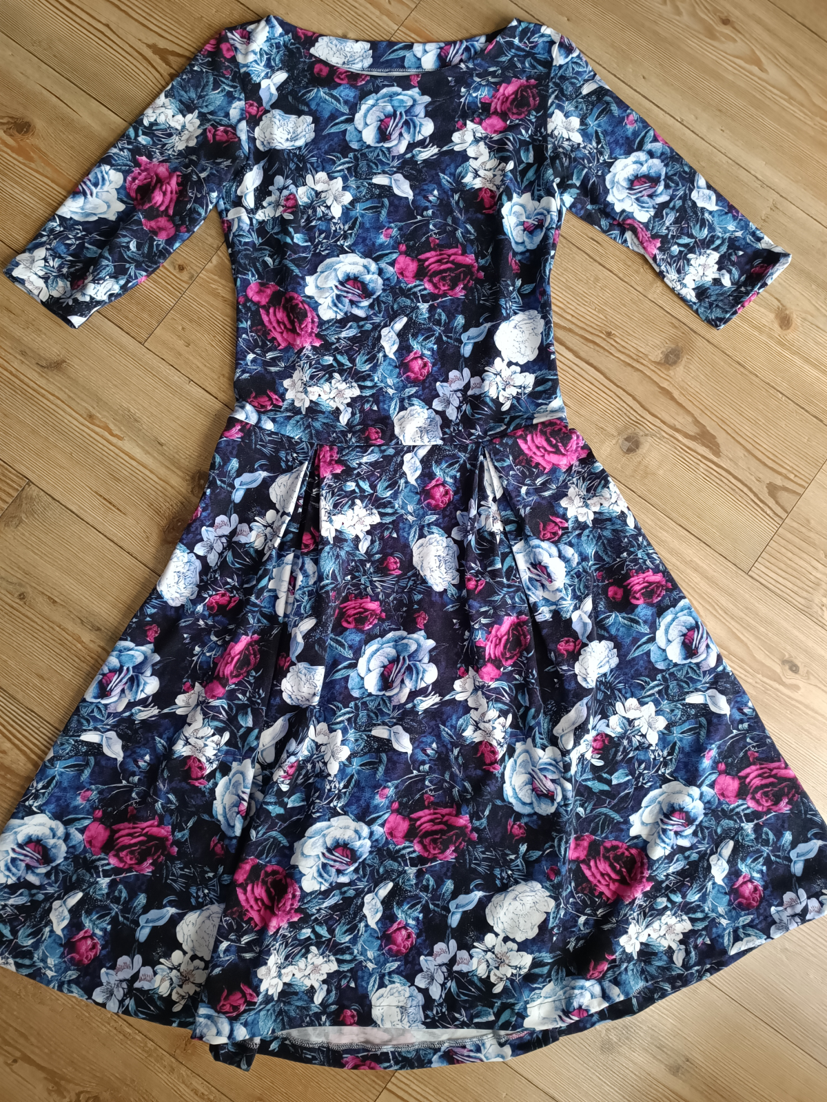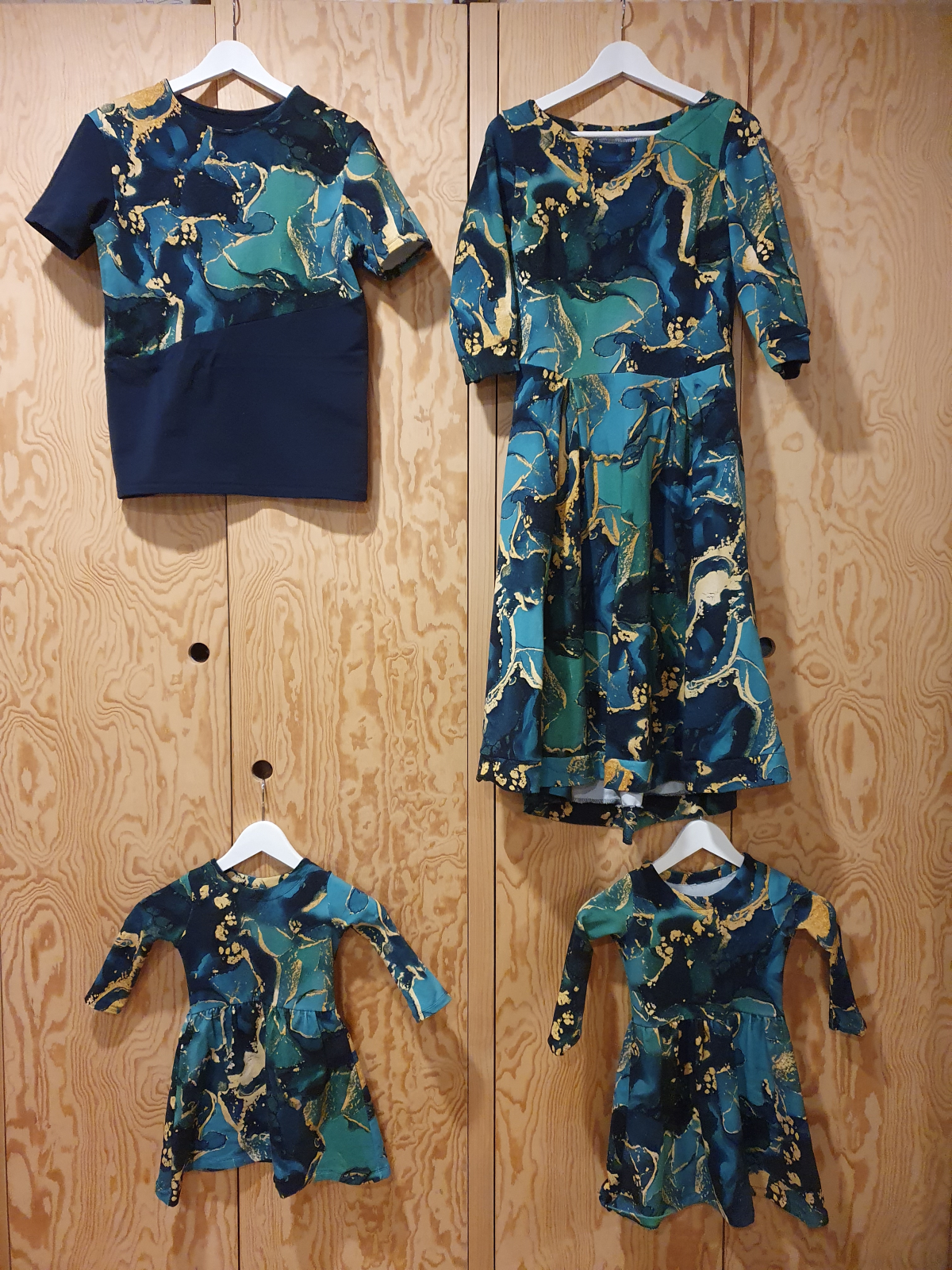 „Šaty jsem šila poprvé. Velmi mi pomohl videonavod a skvělé jsou sesazovaci značky. Díky jim jsem neprehodila rukav, což se mi málem přihodilo. Šilo se mi dobře, leč pomalu, abych neudělala chybu. Pro opatrnost jsem šila 42, ale pak životek trochu projmula po vyzkoušení,zbytek steihla ve 42.Po celem usiti jsou šaty trošku větší než se mi zprvu zdálo. Příště rovnou zvolím 40. Vychazela mi podle tabulek na moji postavu ale když jsem měřila strih a jiné moje šaty, zdal se mi maly a raději strihla 42. Rukavy jsem strihla delší a zakoncila sirokym lemem, aby byly spise 3/4. Měla jsem 2,5m šíře 165cm a vyšlo mi na moje šaty, pak holcickam jednodušší podle vlastního strihu dle saticek a nakonec ještě vyzbylo pro chlapa, ikdyž jen kousek. V kombinaci s jednobarevkou je triko skvělé a máme nejen Vánoční rodinný set. Díky za motivaci, chytlo mne to. Původně jsem chtěla jen šaty pro sebe😁“