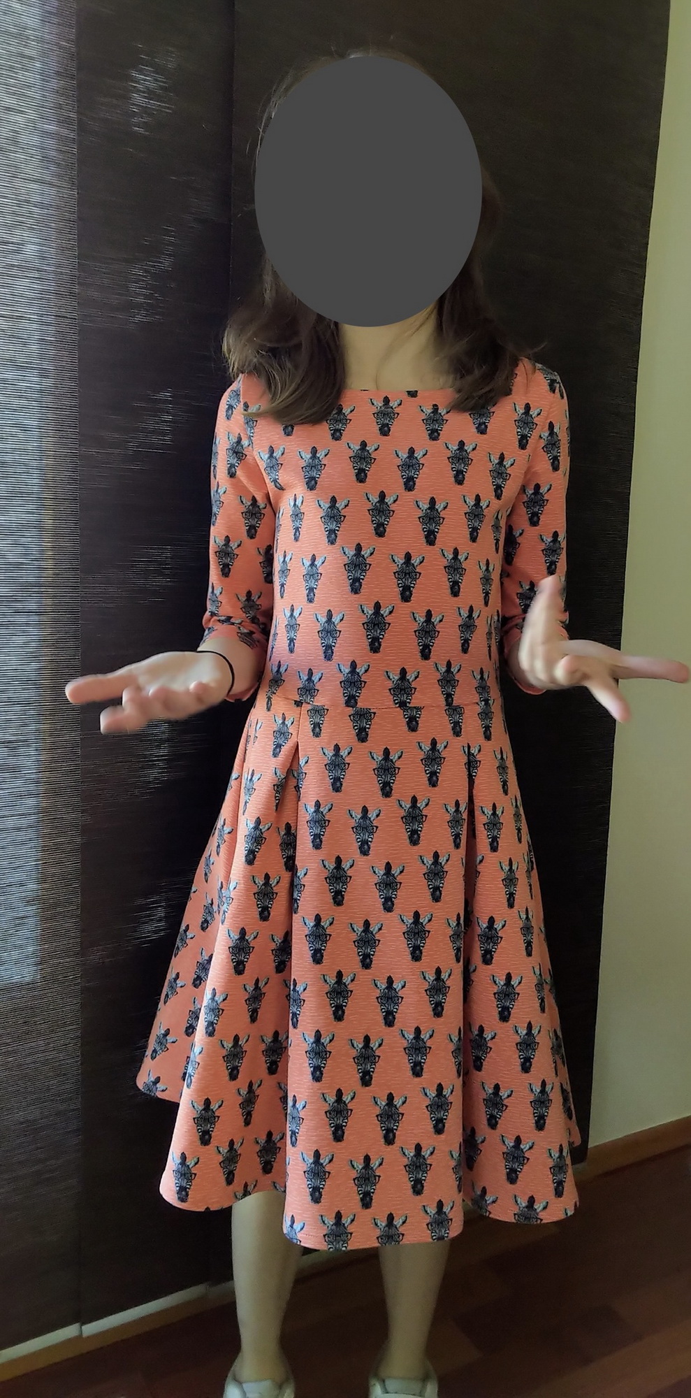 „Se střihem jsem maximálně spokojena, díly na sebe krásně sednou, a ta možnost, zvolit si jak střih vytisknout, to se málokdy vidí a usnadní to práci. Střih jsem mírně upravila, protože jsou to šaty do školky, takže kulatý výstřih lemovaný proužkem na polvinu a zadní díl stejně dlouhý jako přední
