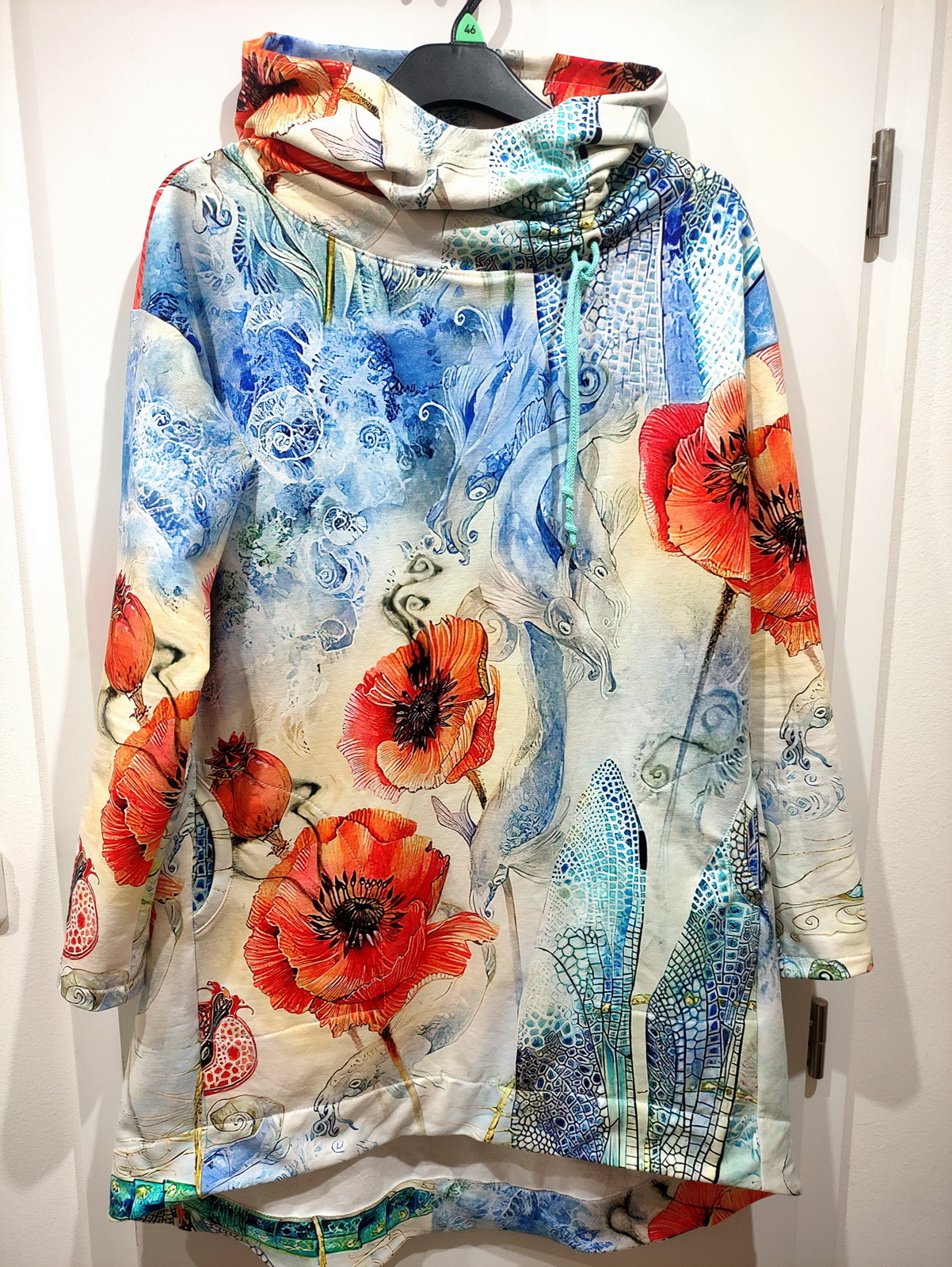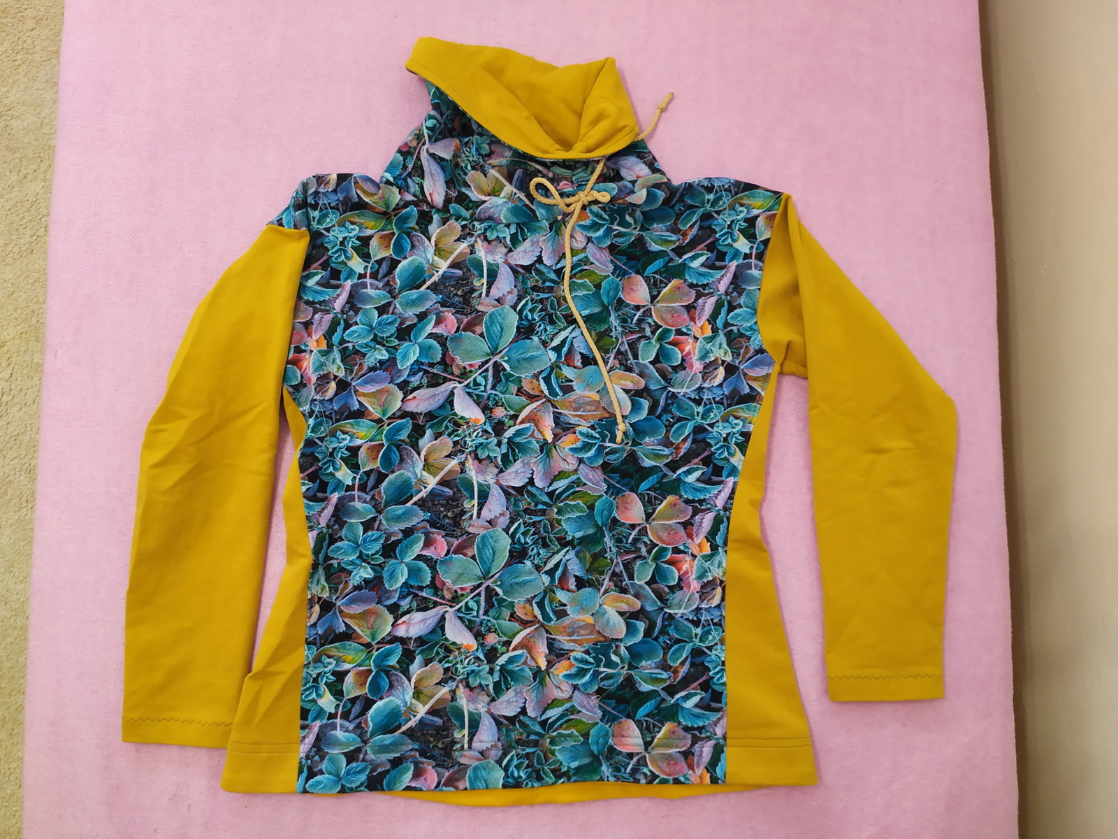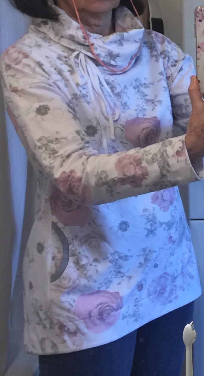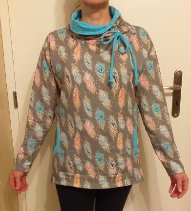 „Je to můj první zkušební vzorek z darových zbytků teplákoviny. Chybělo, takže jsem mikinu pouze podhrnula. Kapsy jsem vynechala, aby mi nezvětšovaly břicho. Zůžila jsem si průkrčník, abych nemusela nosil šátky. Je krásně vypasovaná, takže mi není zima na záda. Závěr: prostě potřebuju další :-D A s videonávodem to byla fakt brnkačka.“